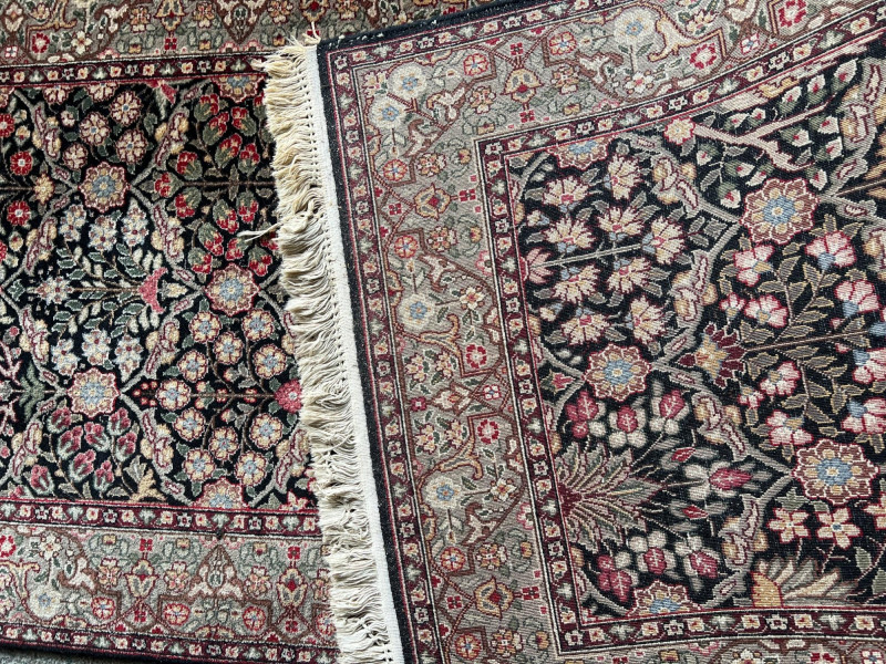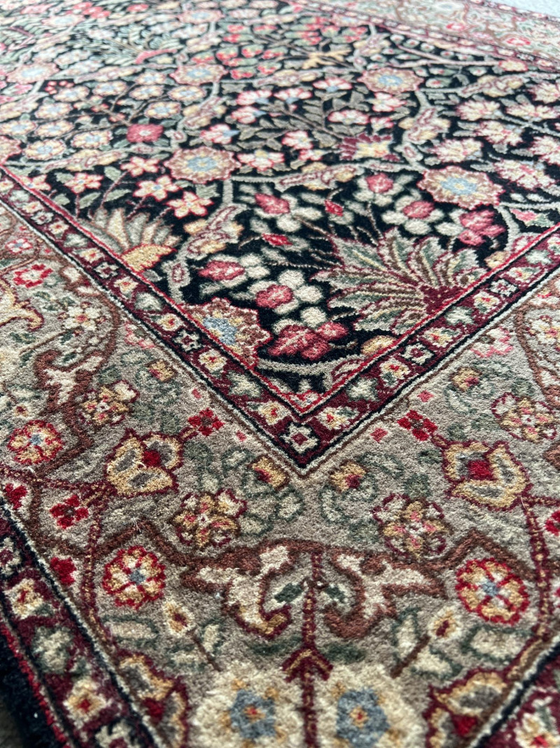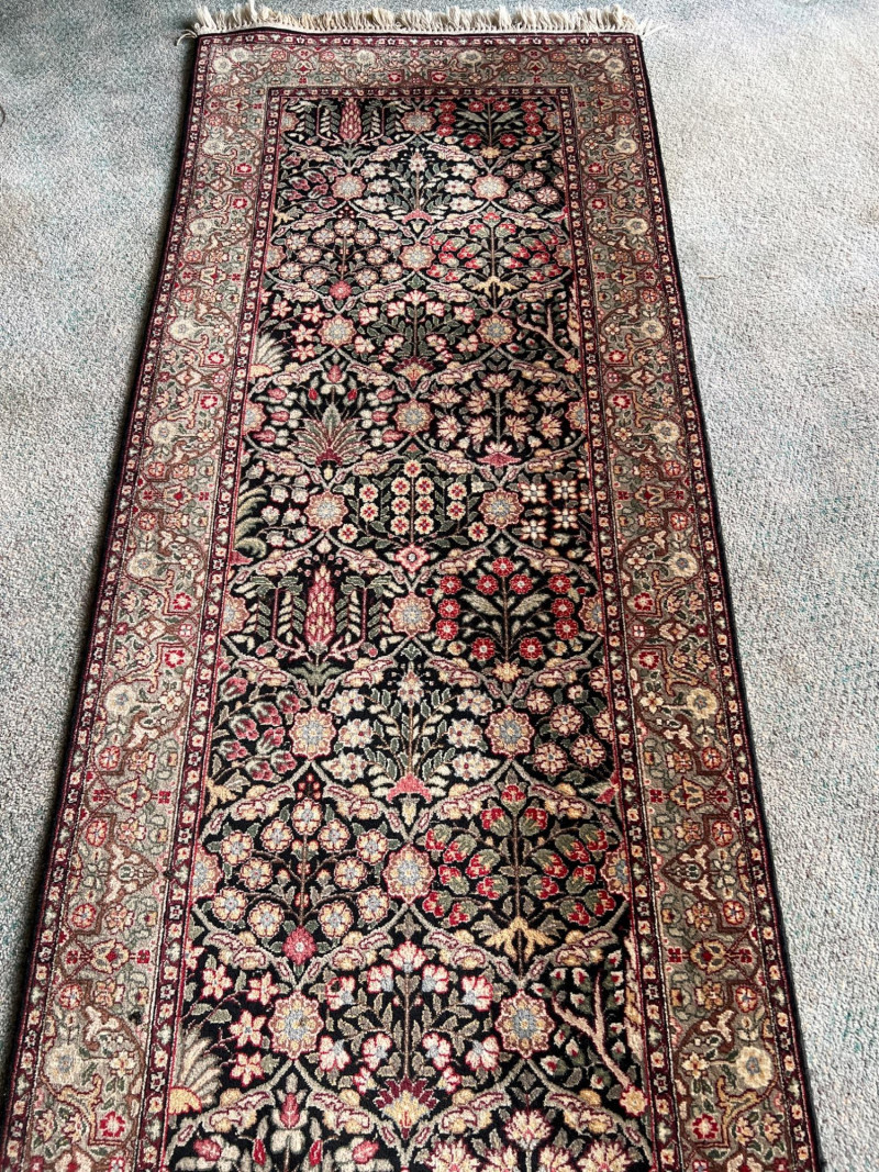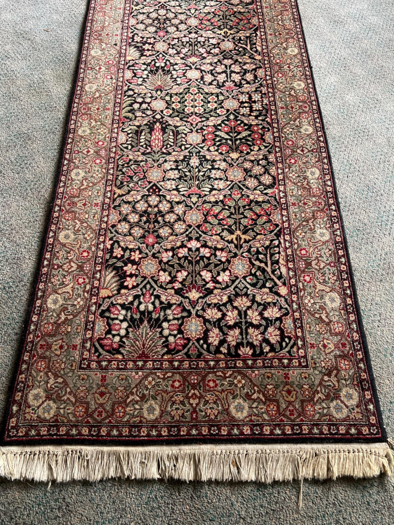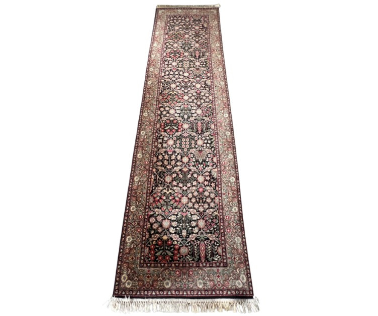 This handwoven Persian Tabriz runner rug showcases intricate floral patterns in a rich palette of black, red, ivory, blue, and beige—an excellent example of traditional Persian craftsmanship. The rug features a detailed central field filled with symmetrical botanical motifs, framed by multiple guard bands with complementary floral elements. Origin: Tabriz, Iran Type: Hand-knotted runner rug Design: Floral medallion and vine motifs Colors: Black, red, beige, ivory, blue Material: Wool pile on cotton foundation Fringe: Traditional fringe on both ends
