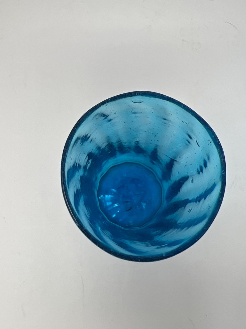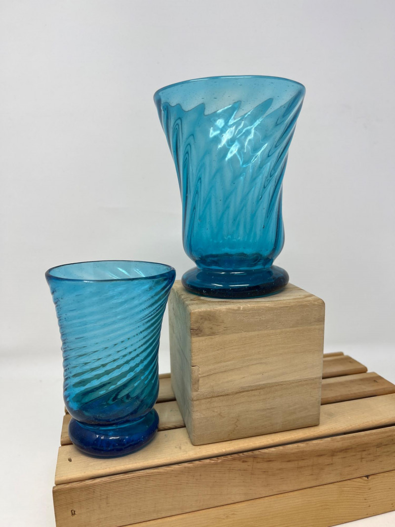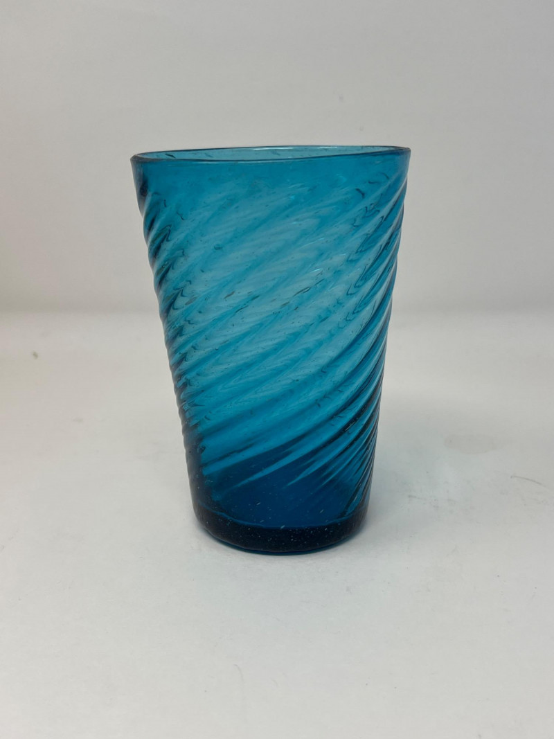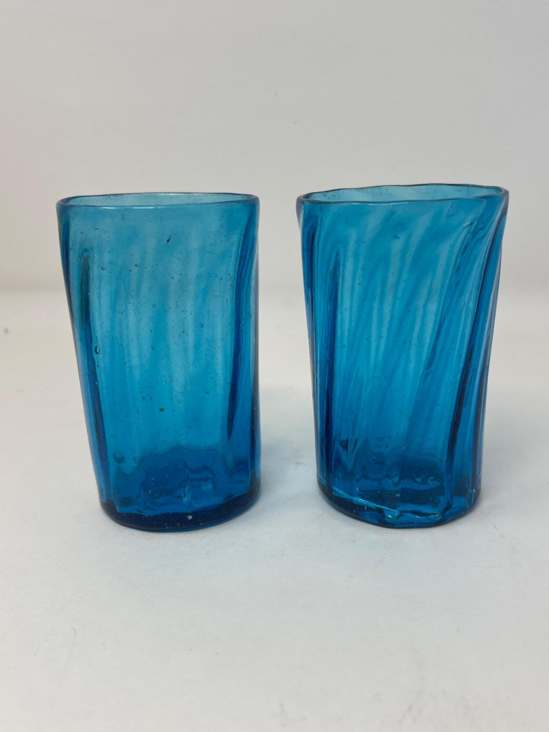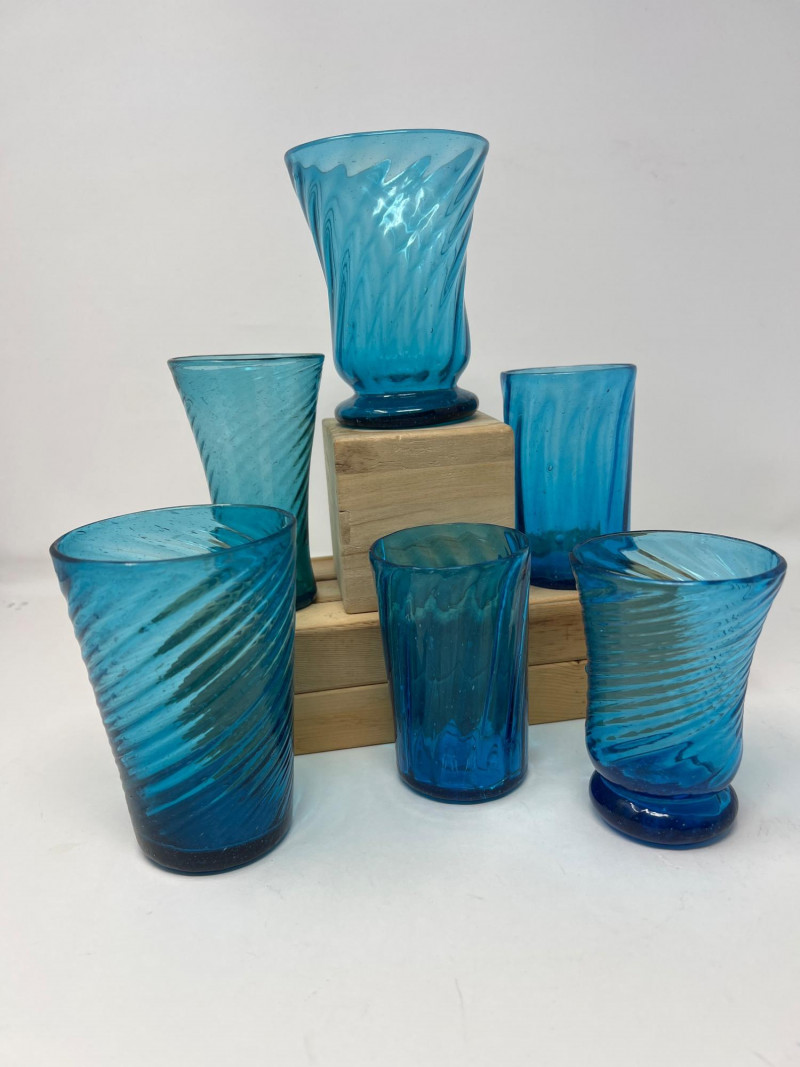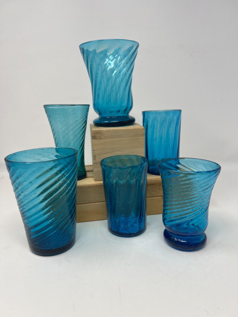 A charming assortment of handblown vintage blue glasses featuring various swirl patterns and shapes. This mismatched collection showcases both vertical and diagonal swirls, with a mix of footed and non-footed designs. Includes: Two 4.75” tall blue glasses with vertical swirl pattern (note: one has a visible crack) One 5.5” tall x 3.5” diameter glass with diagonal swirl One 5.5” tall footed glass with diagonal swirl pattern One 4.25” tall x 3” diameter footed juice glass One 5.5” tall x 3” diameter handblown glass with blue diagonal swirl