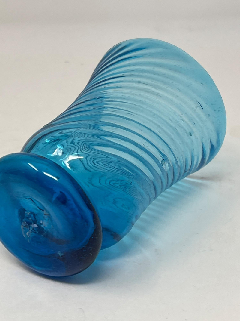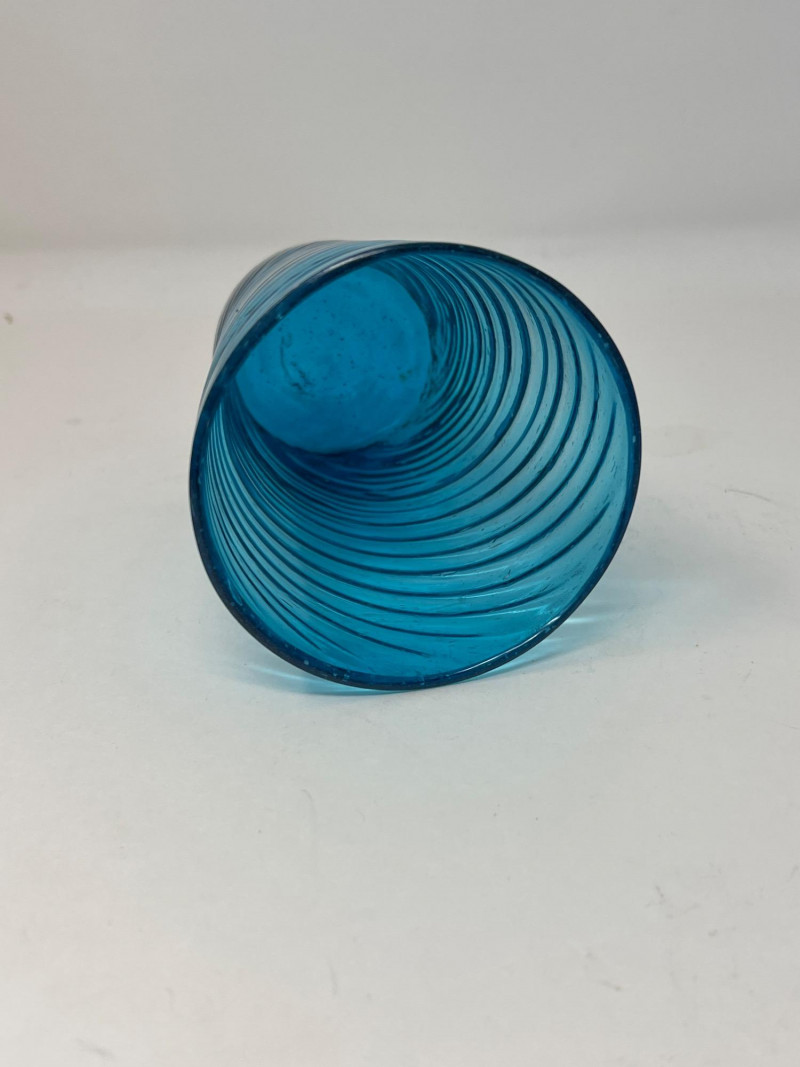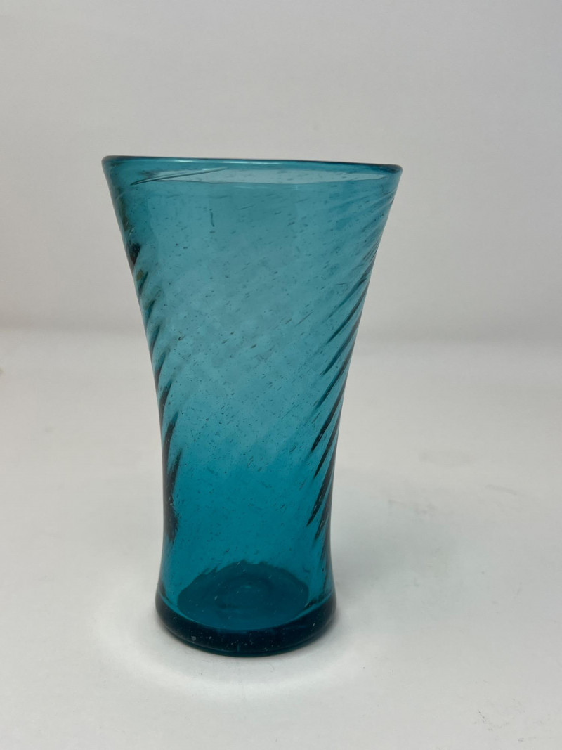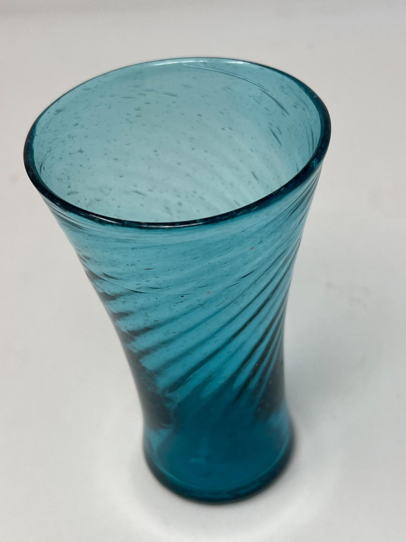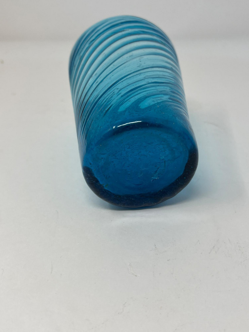 A charming assortment of handblown vintage blue glasses featuring various swirl patterns and shapes. This mismatched collection showcases both vertical and diagonal swirls, with a mix of footed and non-footed designs. Includes: Two 4.75” tall blue glasses with vertical swirl pattern (note: one has a visible crack) One 5.5” tall x 3.5” diameter glass with diagonal swirl One 5.5” tall footed glass with diagonal swirl pattern One 4.25” tall x 3” diameter footed juice glass One 5.5” tall x 3” diameter handblown glass with blue diagonal swirl
