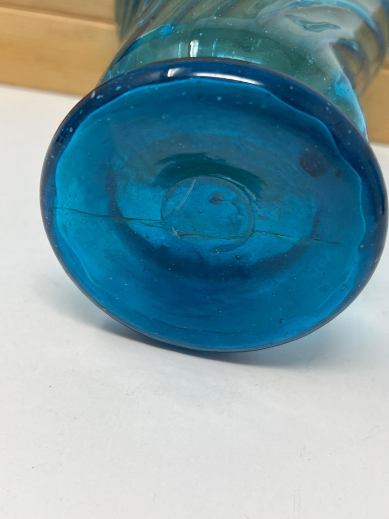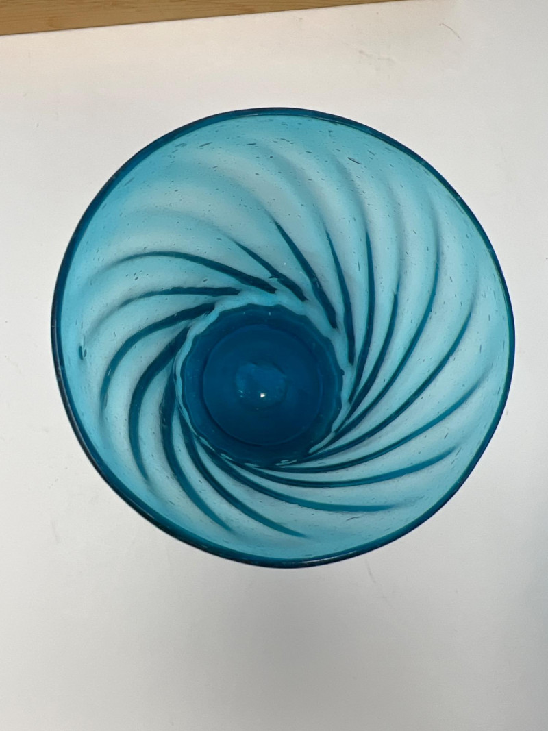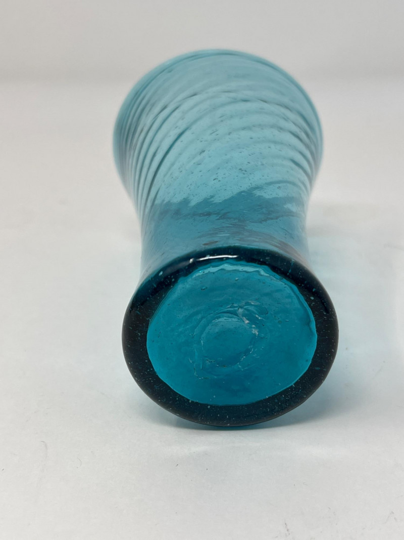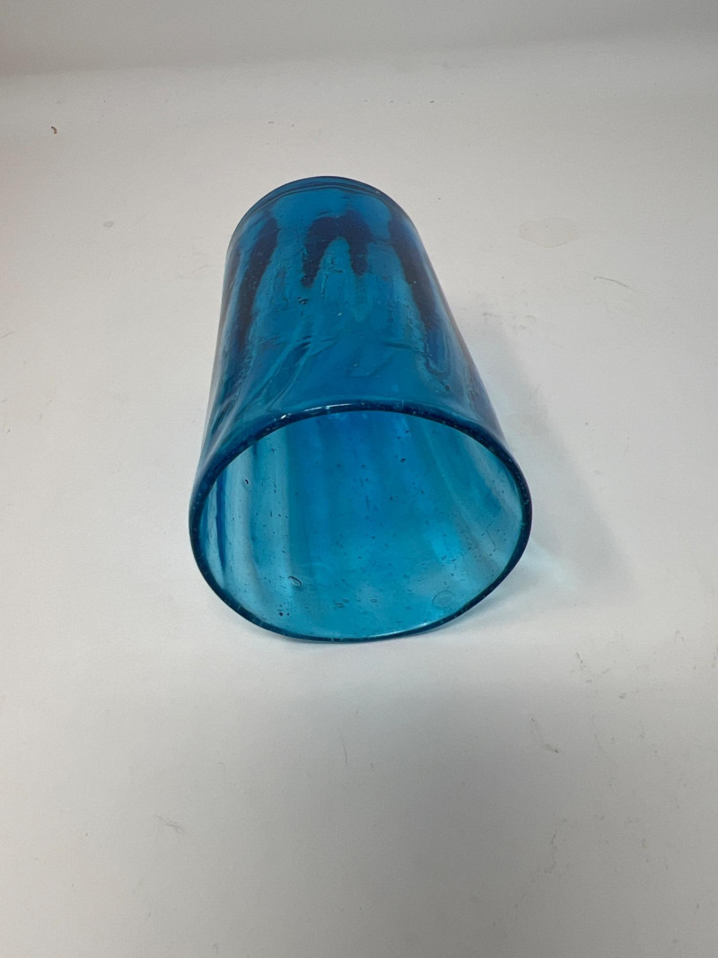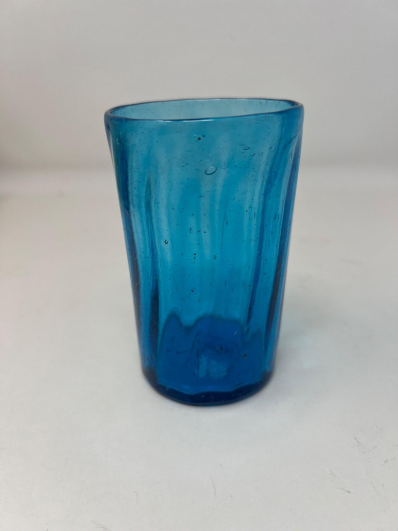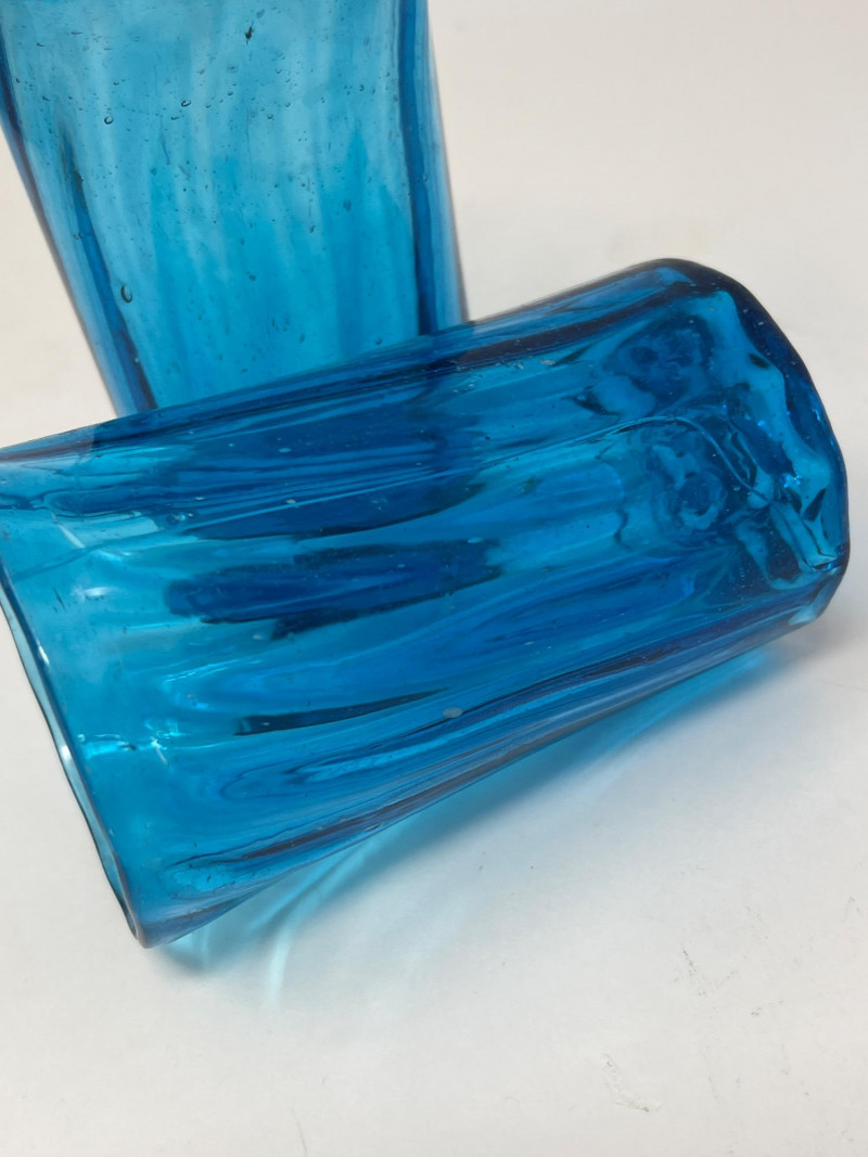 A charming assortment of handblown vintage blue glasses featuring various swirl patterns and shapes. This mismatched collection showcases both vertical and diagonal swirls, with a mix of footed and non-footed designs. Includes: Two 4.75” tall blue glasses with vertical swirl pattern (note: one has a visible crack) One 5.5” tall x 3.5” diameter glass with diagonal swirl One 5.5” tall footed glass with diagonal swirl pattern One 4.25” tall x 3” diameter footed juice glass One 5.5” tall x 3” diameter handblown glass with blue diagonal swirl