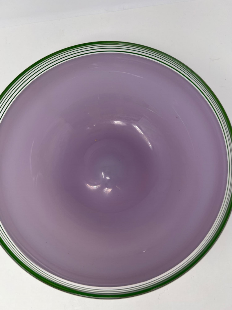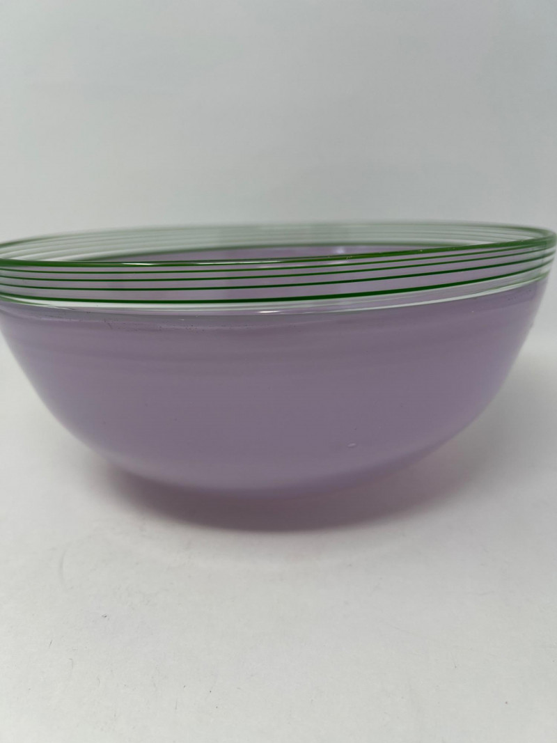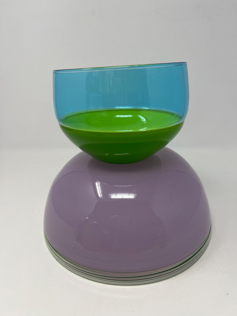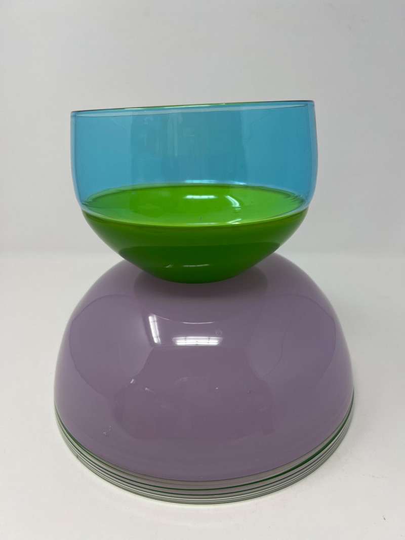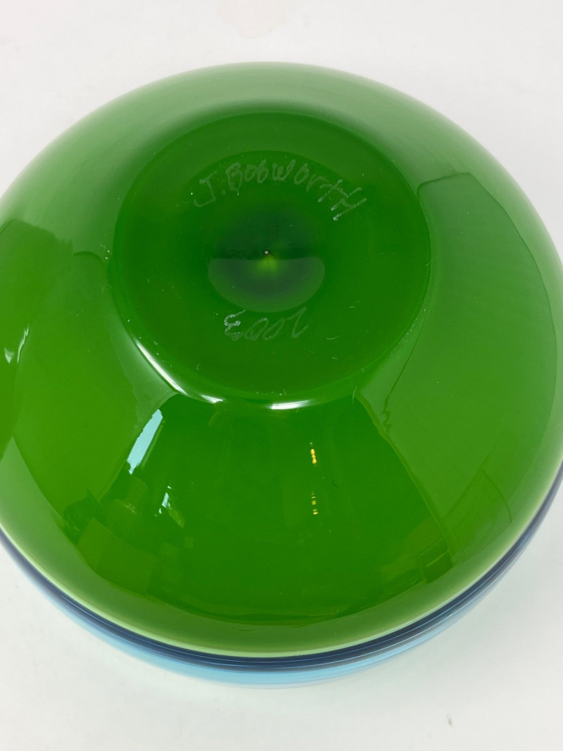 A vibrant pair of contemporary artist glass bowls showcasing striking color contrasts and elegant craftsmanship. Lavender Bowl: Measuring 9.5" in diameter and 4" in height, this bowl features a smooth lavender hue with subtle striping detail along the rim Blue/Green Bowl: A signed piece by J. Bobworth (2003), this smaller bowl measures 6" in diameter and 4.76" in height. It features a vivid green interior paired with a translucent blue exterior, forming a bold visual contrast.