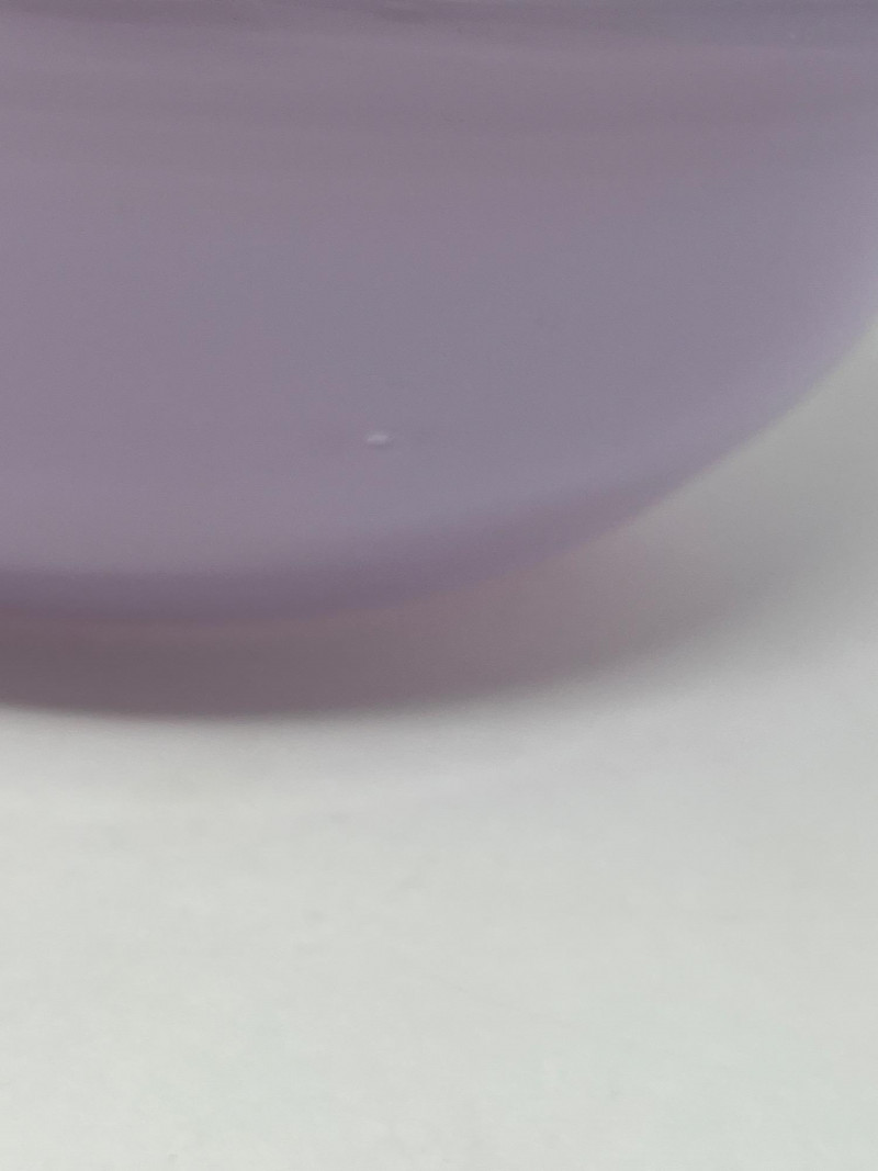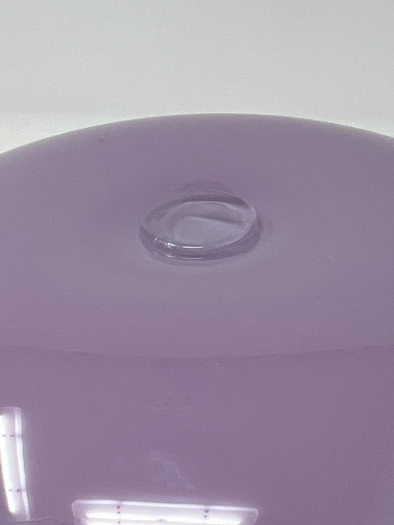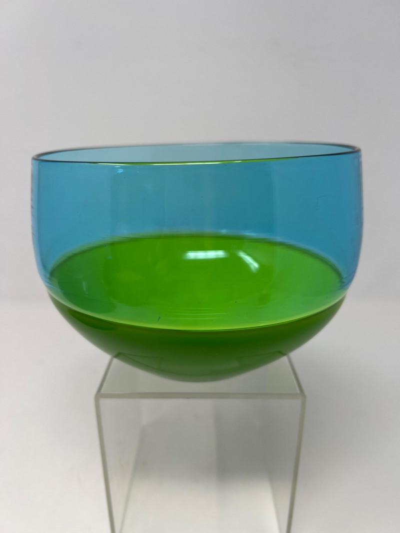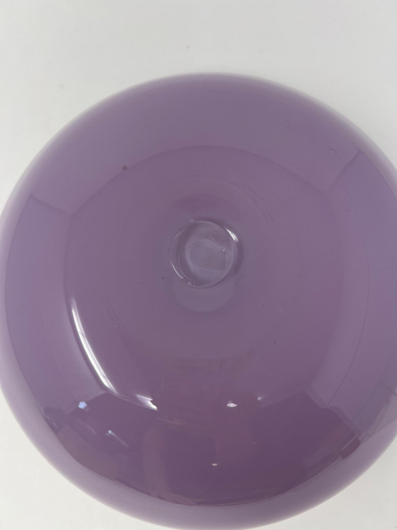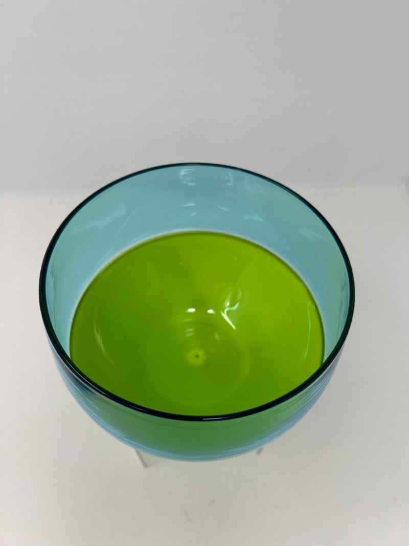 A vibrant pair of contemporary artist glass bowls showcasing striking color contrasts and elegant craftsmanship. Lavender Bowl: Measuring 9.5" in diameter and 4" in height, this bowl features a smooth lavender hue with subtle striping detail along the rim Blue/Green Bowl: A signed piece by J. Bobworth (2003), this smaller bowl measures 6" in diameter and 4.76" in height. It features a vivid green interior paired with a translucent blue exterior, forming a bold visual contrast.