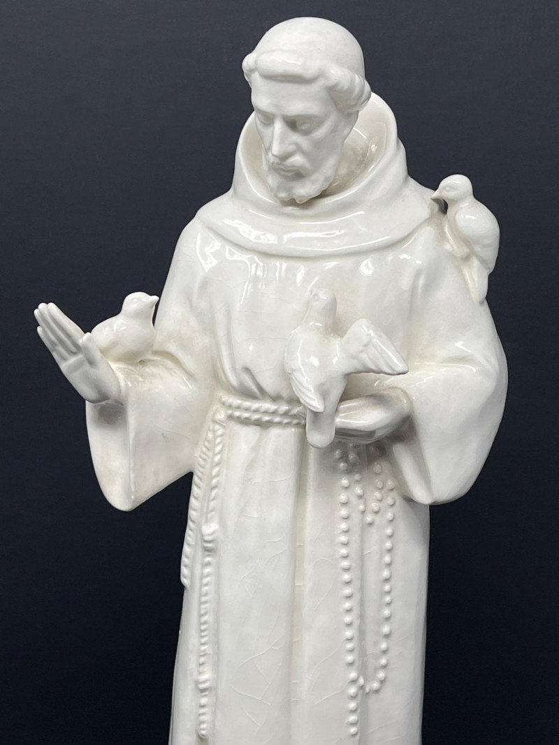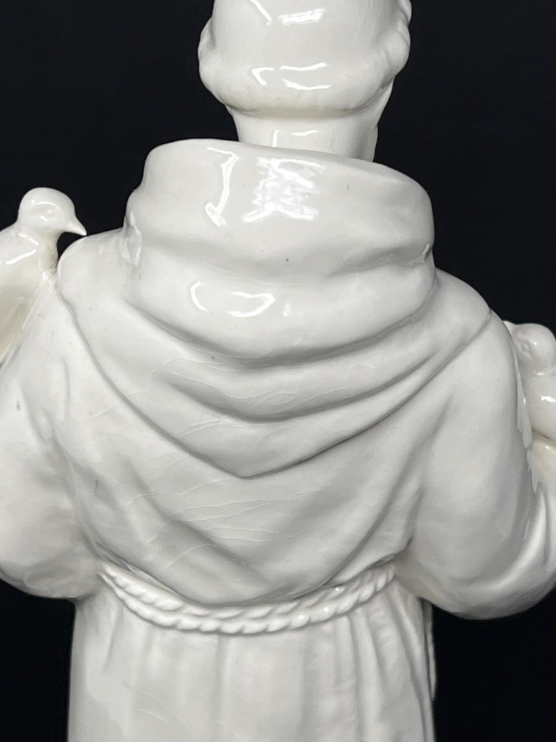 A beautifully detailed vintage porcelain statue depicting Saint Francis of Assisi, the patron saint of animals and nature. This serene figure is shown in a traditional friar’s robe with rosary beads draped down the front. Birds are delicately perched on his hands, arm, and feet, symbolizing his deep connection with nature. Features: Material: Glazed porcelain Color: Glossy white with subtle crazing Subject: Saint Francis of Assisi with birds Style: Religious / devotional figurine Era: Vintage