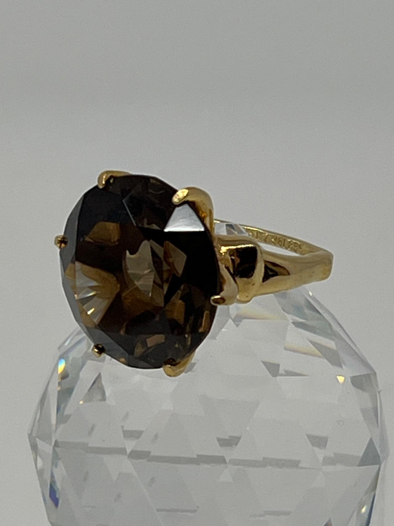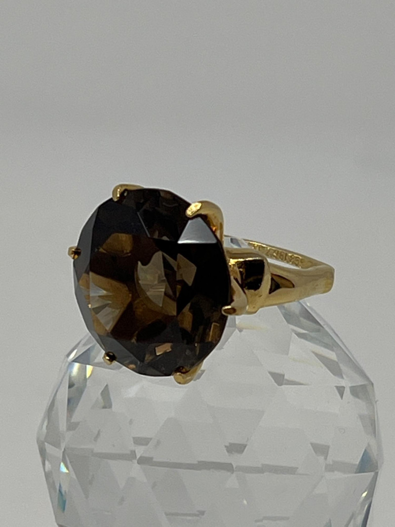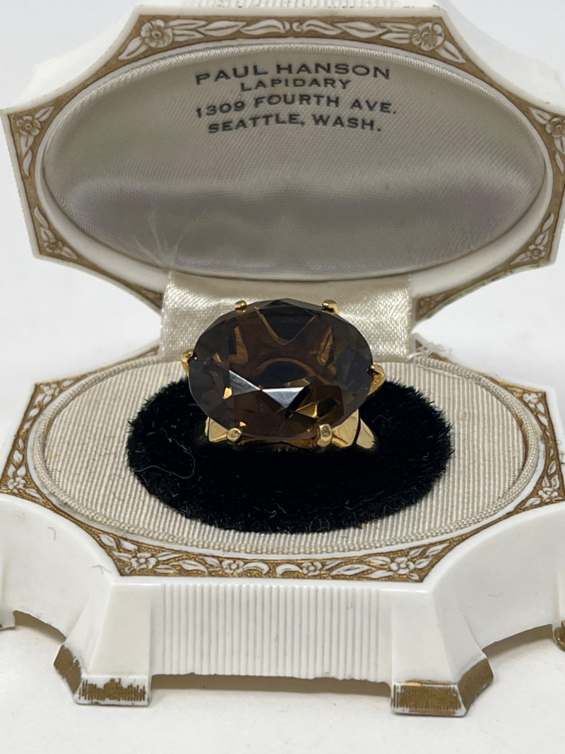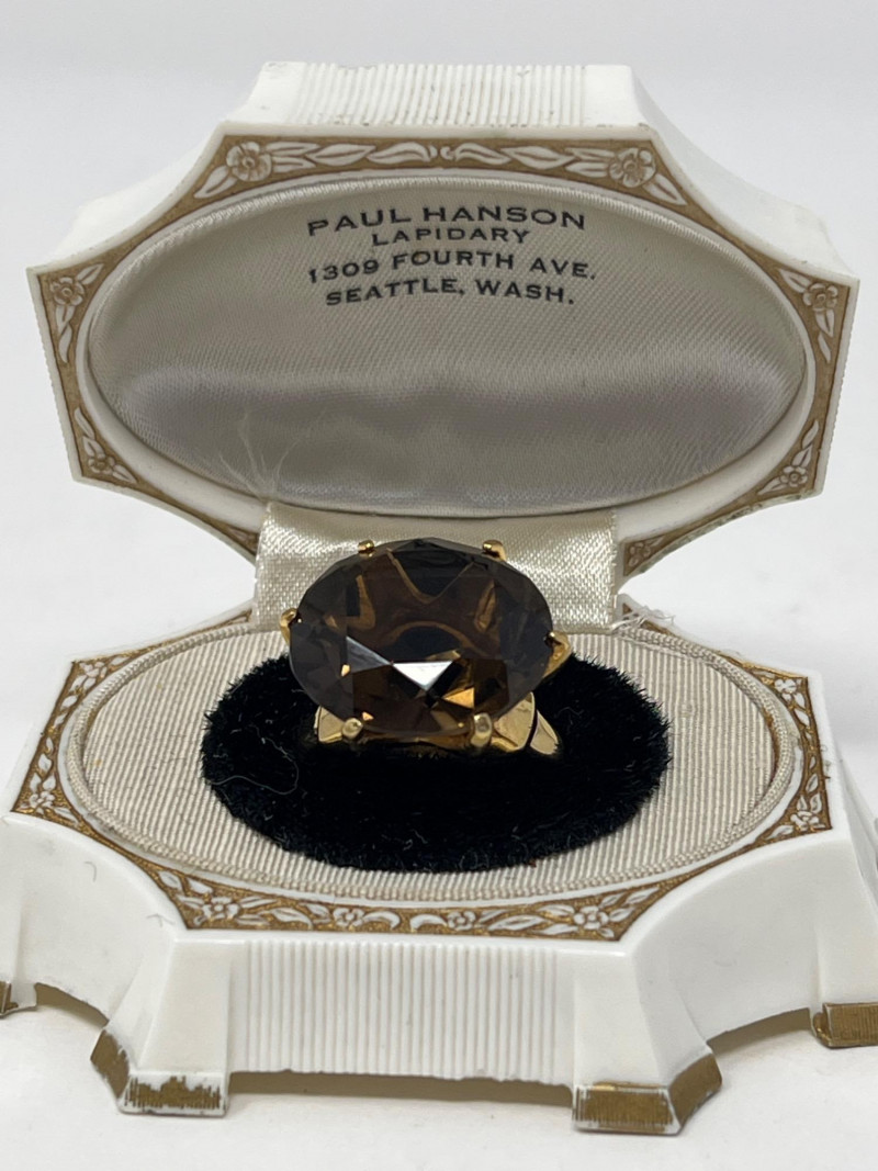 Make a bold vintage statement with this stunning Vendome ring from the 1960s. Featuring a large, faceted topaz-colored stone, this elegant piece is set in a high-quality gold-tone setting with dramatic prong details that showcase the gem’s brilliance and depth. Maker: Vendome Marking: Stamped with patent number Pat. 2,961,855 Era: Circa 1960s Stone: Oval-cut topaz-colored glass (approx. 26mm wide x 13mm deep) Metal: Gold-tone metal Ring Size: Adjustable shank fits approximately size 5 to 7 Presentation: Includes original vintage ring box from Paul Hanson, Lapidary, Seattle, WA – a collector’s piece in its own right