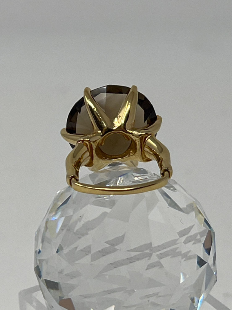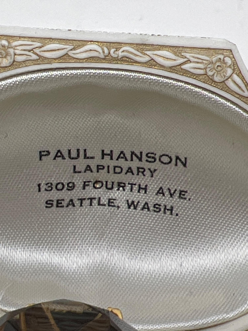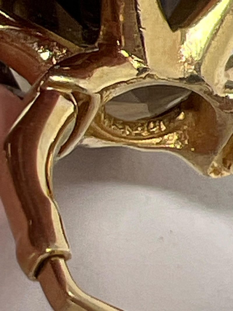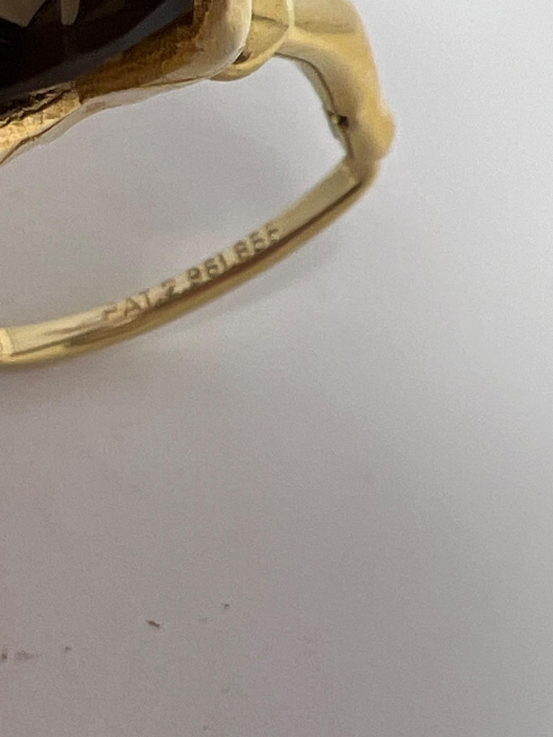 Make a bold vintage statement with this stunning Vendome ring from the 1960s. Featuring a large, faceted topaz-colored stone, this elegant piece is set in a high-quality gold-tone setting with dramatic prong details that showcase the gem’s brilliance and depth. Maker: Vendome Marking: Stamped with patent number Pat. 2,961,855 Era: Circa 1960s Stone: Oval-cut topaz-colored glass (approx. 26mm wide x 13mm deep) Metal: Gold-tone metal Ring Size: Adjustable shank fits approximately size 5 to 7 Presentation: Includes original vintage ring box from Paul Hanson, Lapidary, Seattle, WA – a collector’s piece in its own right