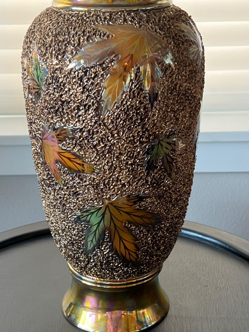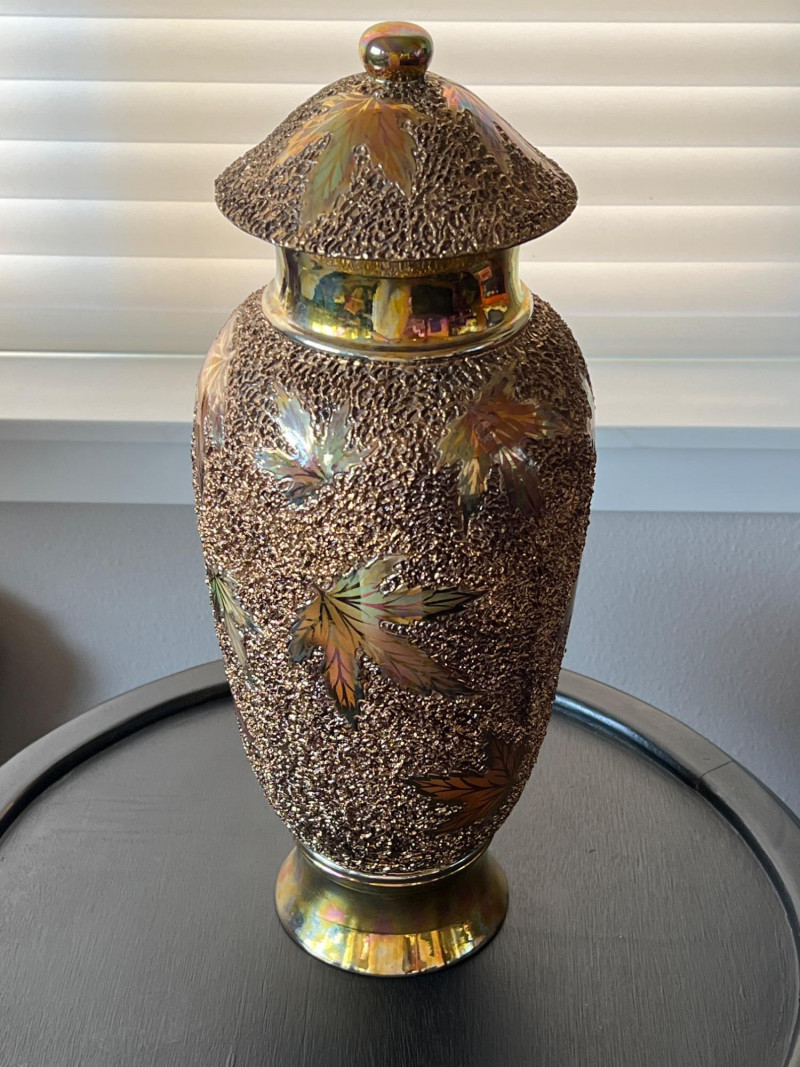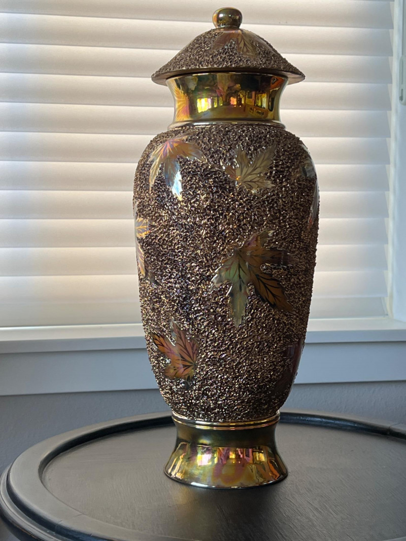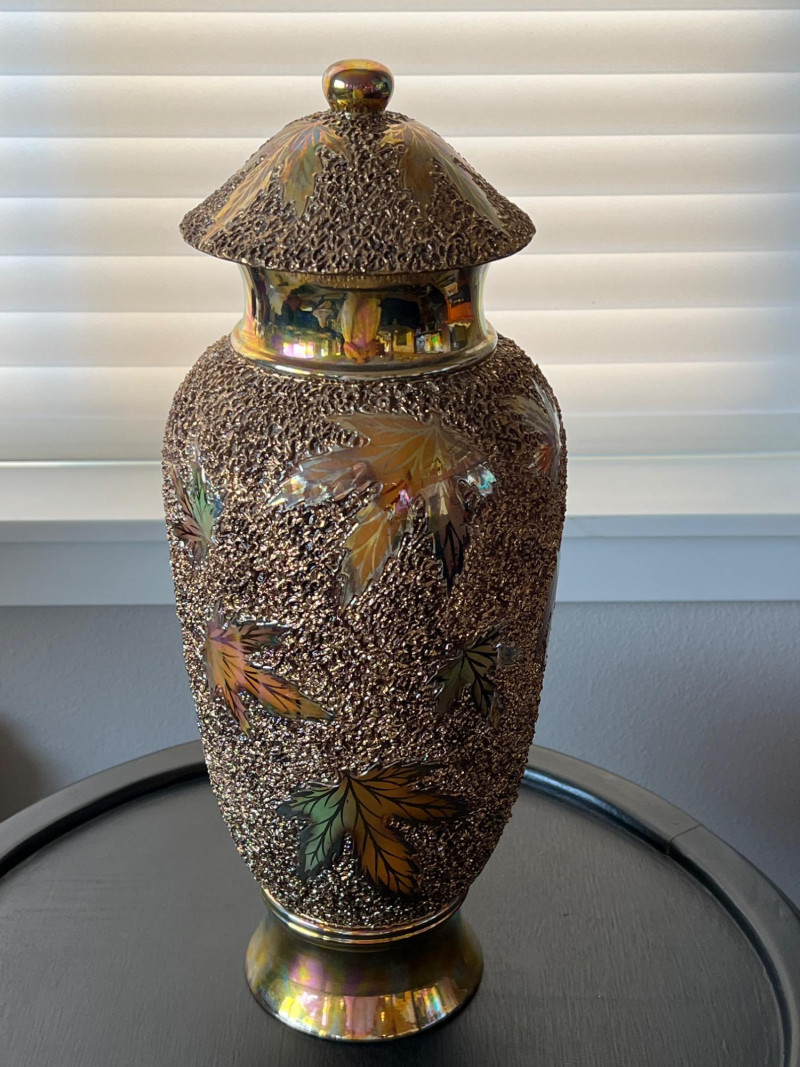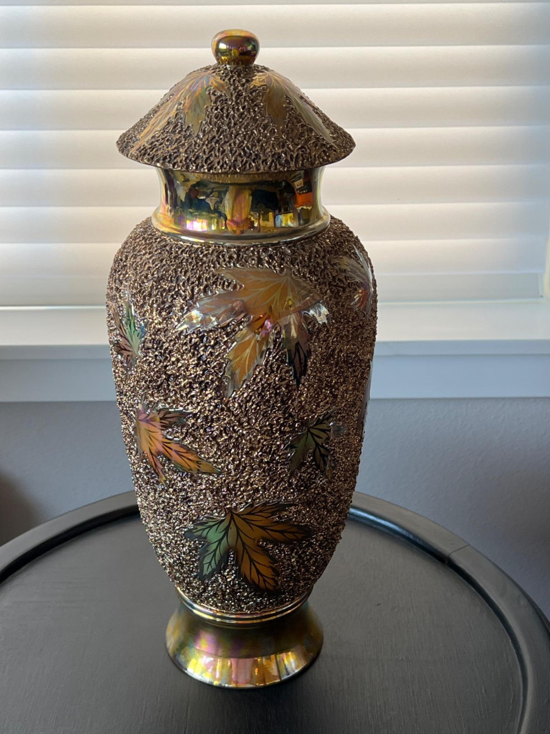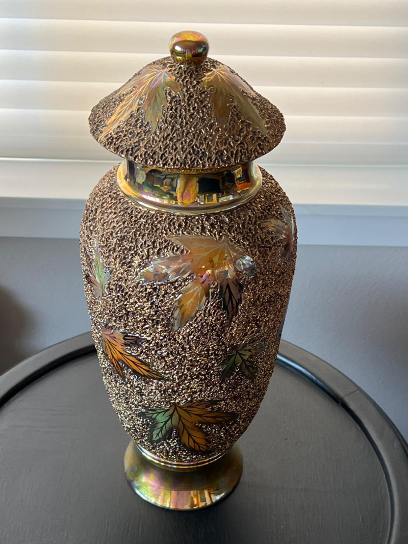 An elegant and eye-catching decorative piece by Rose Mario, this lidded vase features a stunning combination of texture, color, and craftsmanship. Details: Artist: Rose Mario (signed on the base) Material: Porcelain Finish: Multi-textured surface with a metallic golden luster Design: Raised leaf motifs in autumn colors (gold, copper, green, amber) Features: Removable lid with matching design Iridescent sheen on base and rim Hand-applied textured detailing