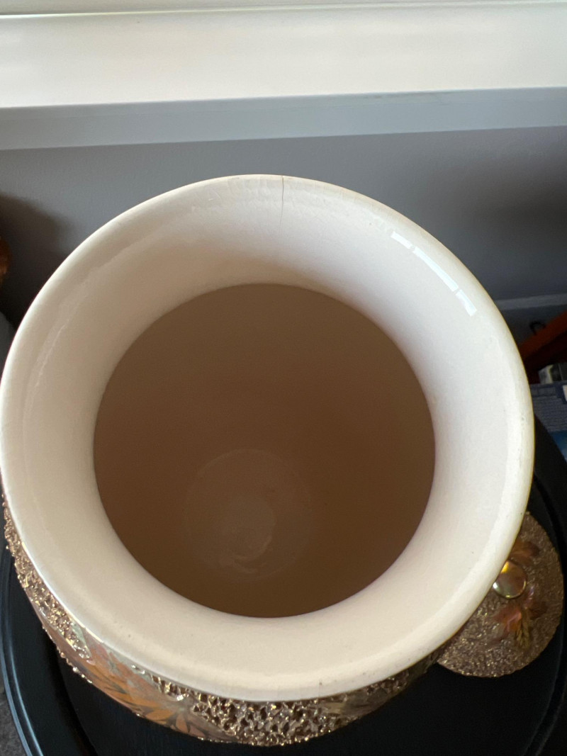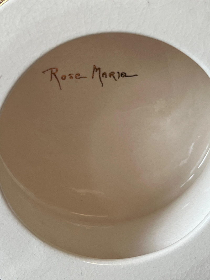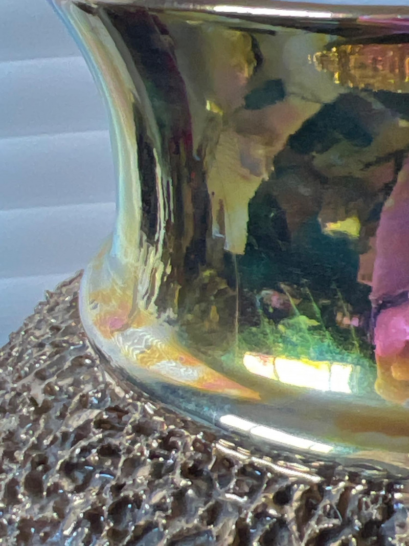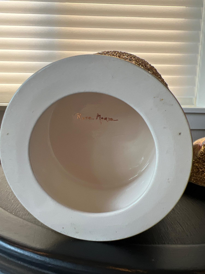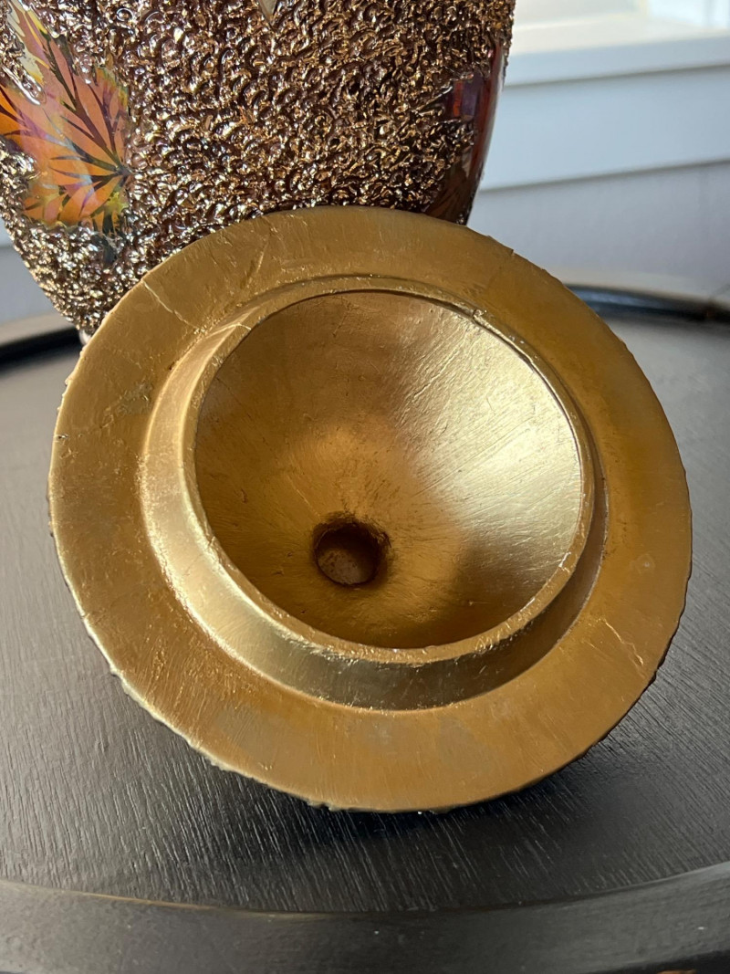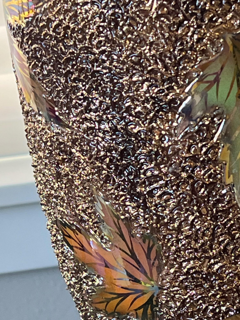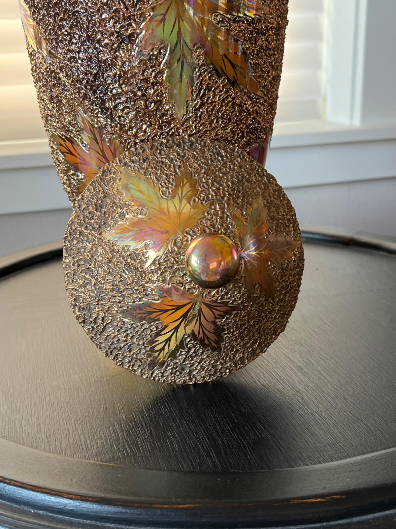 An elegant and eye-catching decorative piece by Rose Mario, this lidded vase features a stunning combination of texture, color, and craftsmanship. Details: Artist: Rose Mario (signed on the base) Material: Porcelain Finish: Multi-textured surface with a metallic golden luster Design: Raised leaf motifs in autumn colors (gold, copper, green, amber) Features: Removable lid with matching design Iridescent sheen on base and rim Hand-applied textured detailing