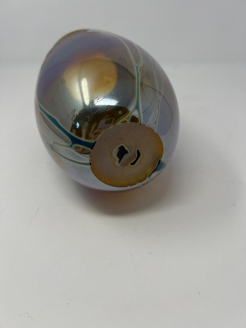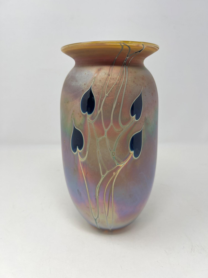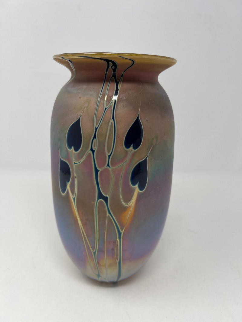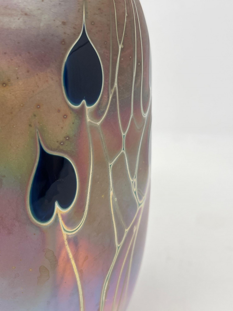 This exquisite handblown art glass vase by renowned American glass artist Craig Zweifel features a mesmerizing iridescent surface with flowing feathered leaf designs in deep cobalt and cream. The piece showcases Zweifel’s signature organic motifs and expert use of color, blending purples, golds, and blues for a stunning, luminous effect that changes with the light. Artist: Craig Zweifel Medium: Handblown iridescent art glass Design: Organic abstract motifs in cobalt and ivory Color palette: Iridescent tones of purple, gold, green, and blue Signature: Signed “Zweifel” and dated 8/81 – 12 on the base