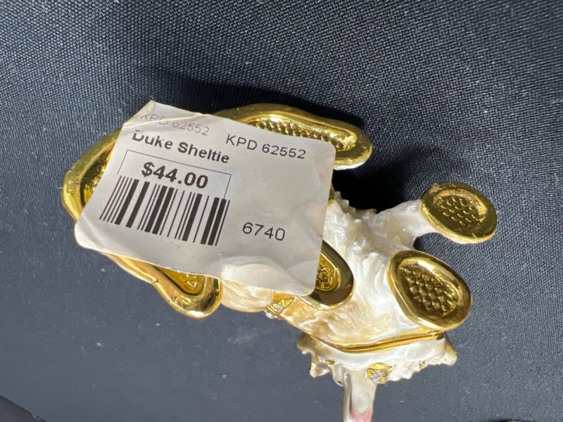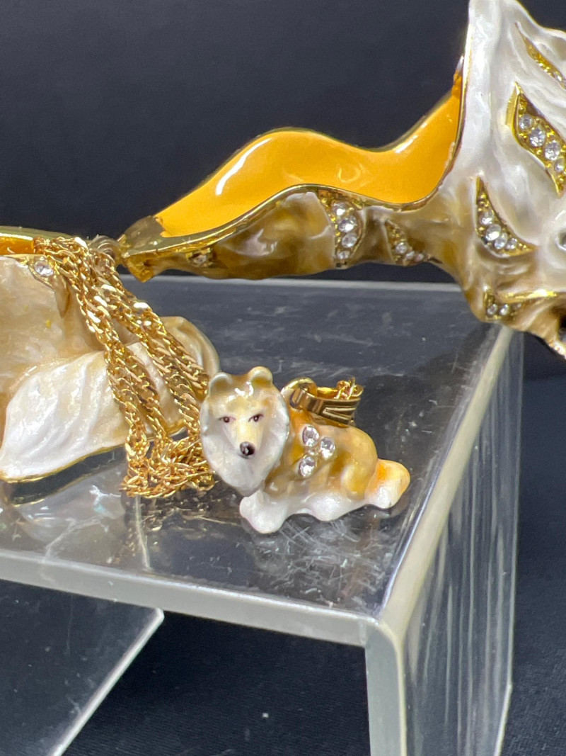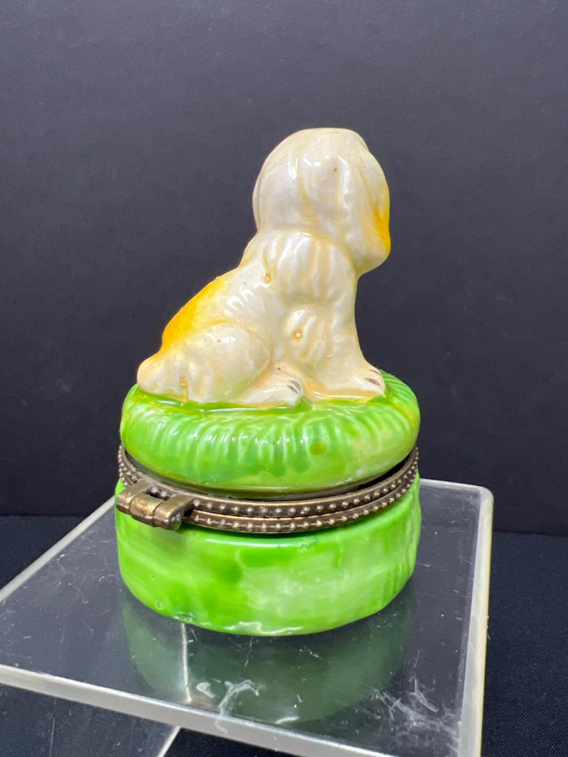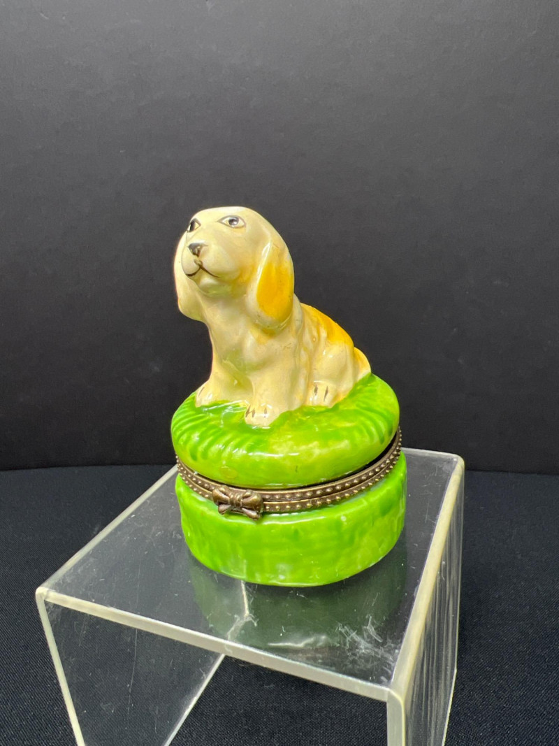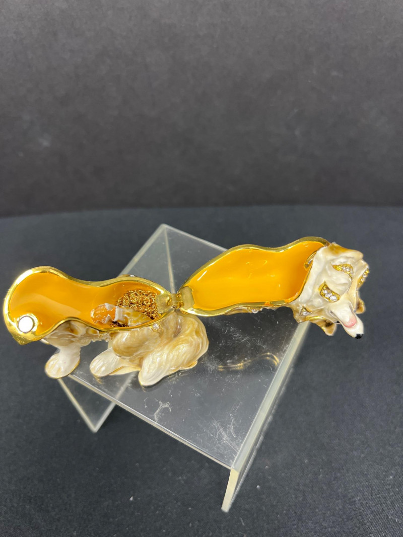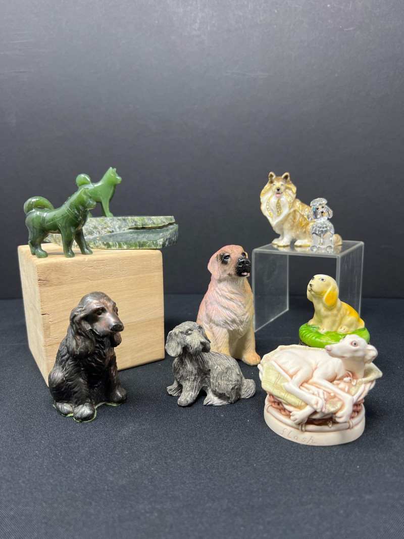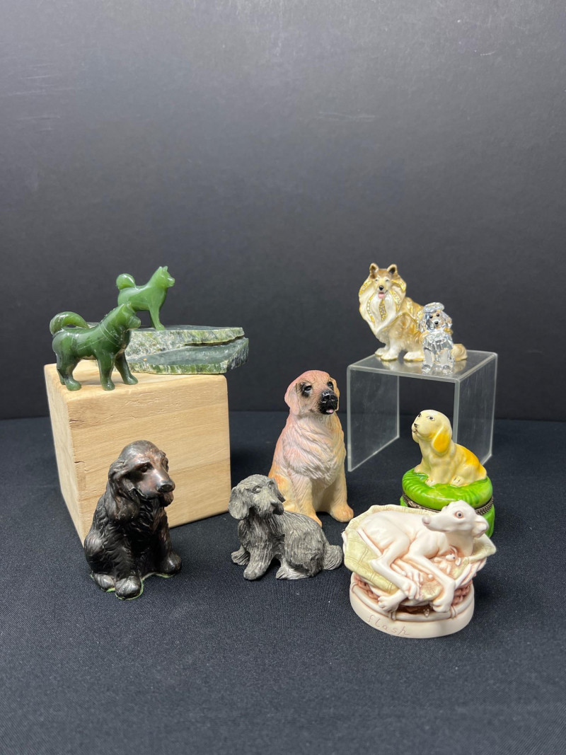 This charming collection features a variety of miniature dog figurines crafted from diverse materials including porcelain, crystal, jade-like stone, and resin. Highlights include: Harmony Kingdom "Retired Racers" Greyhound Box (2008) – A hand-painted collectible from England by Peter Calvesbert, with a hidden compartment and intricate detailing. Green Stone Carved Dogs – Two detailed dog carvings displayed on raw mineral bases, possibly jade or serpentine. Duke Sheltie Trinket Box Necklace – A decorative gold-accented Sheltie box that opens to reveal a tiny dog pendant on a gold-tone chain. Crystal Poodle Figurine – Swarovski crystal dog with fine features and glossy finish. Vintage Ceramic Dogs – Includes breeds like Golden Retriever (marked “1987” and “Made in China”), a Spaniel marked “Pewter”, and a yellow ceramic dog atop a green trinket box.