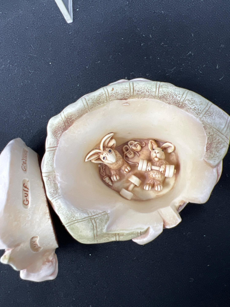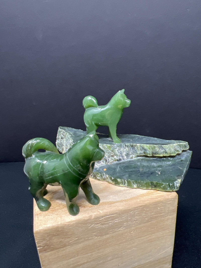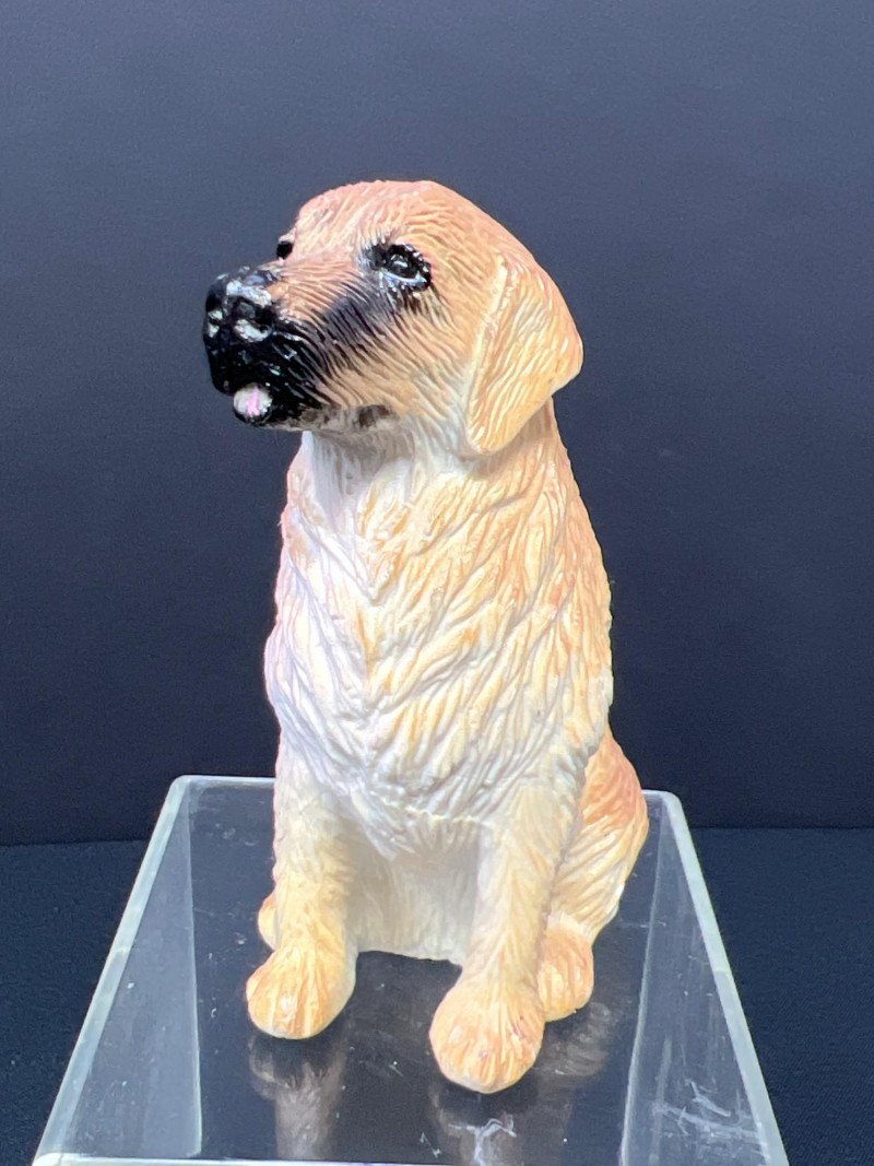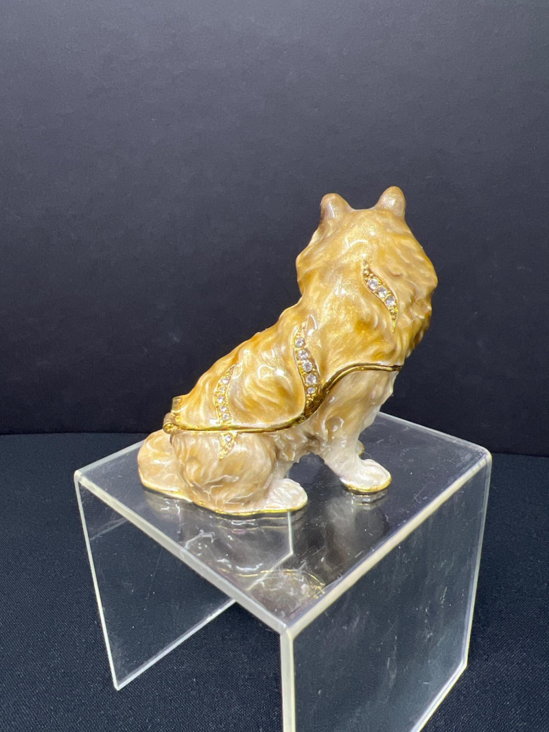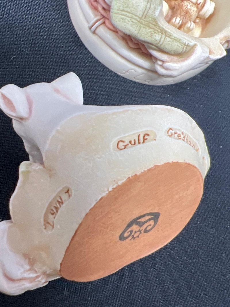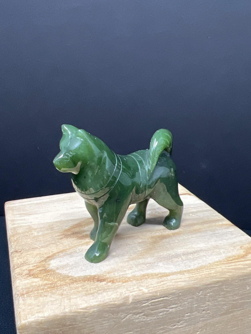 This charming collection features a variety of miniature dog figurines crafted from diverse materials including porcelain, crystal, jade-like stone, and resin. Highlights include: Harmony Kingdom "Retired Racers" Greyhound Box (2008) – A hand-painted collectible from England by Peter Calvesbert, with a hidden compartment and intricate detailing. Green Stone Carved Dogs – Two detailed dog carvings displayed on raw mineral bases, possibly jade or serpentine. Duke Sheltie Trinket Box Necklace – A decorative gold-accented Sheltie box that opens to reveal a tiny dog pendant on a gold-tone chain. Crystal Poodle Figurine – Swarovski crystal dog with fine features and glossy finish. Vintage Ceramic Dogs – Includes breeds like Golden Retriever (marked “1987” and “Made in China”), a Spaniel marked “Pewter”, and a yellow ceramic dog atop a green trinket box.