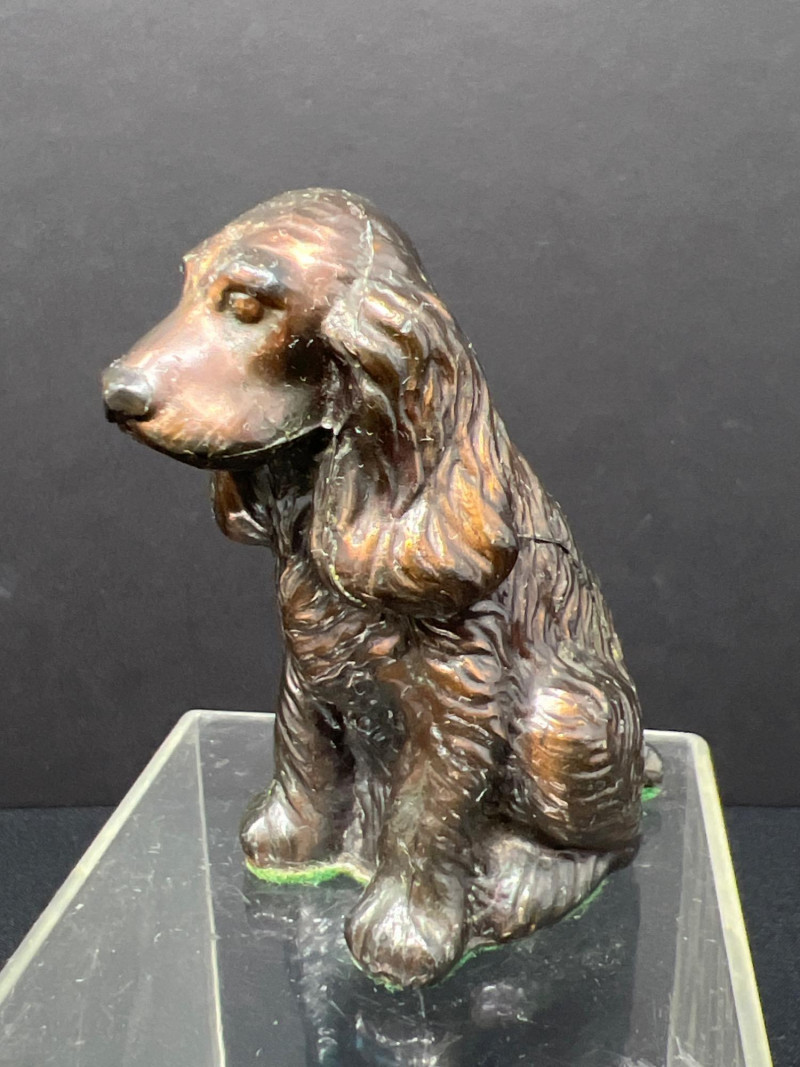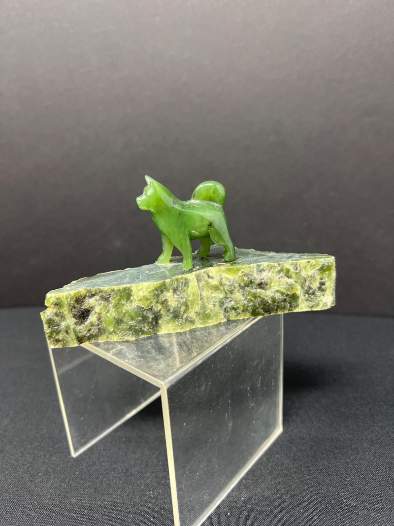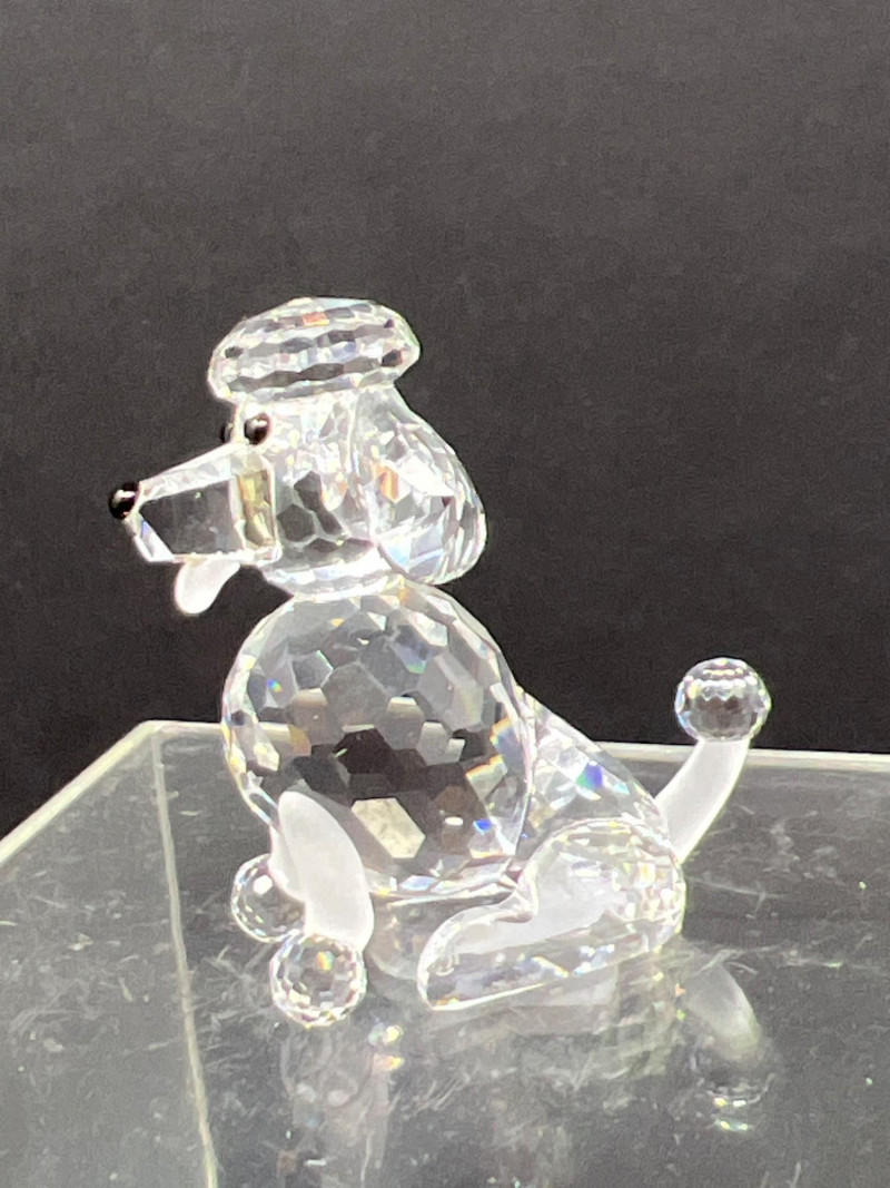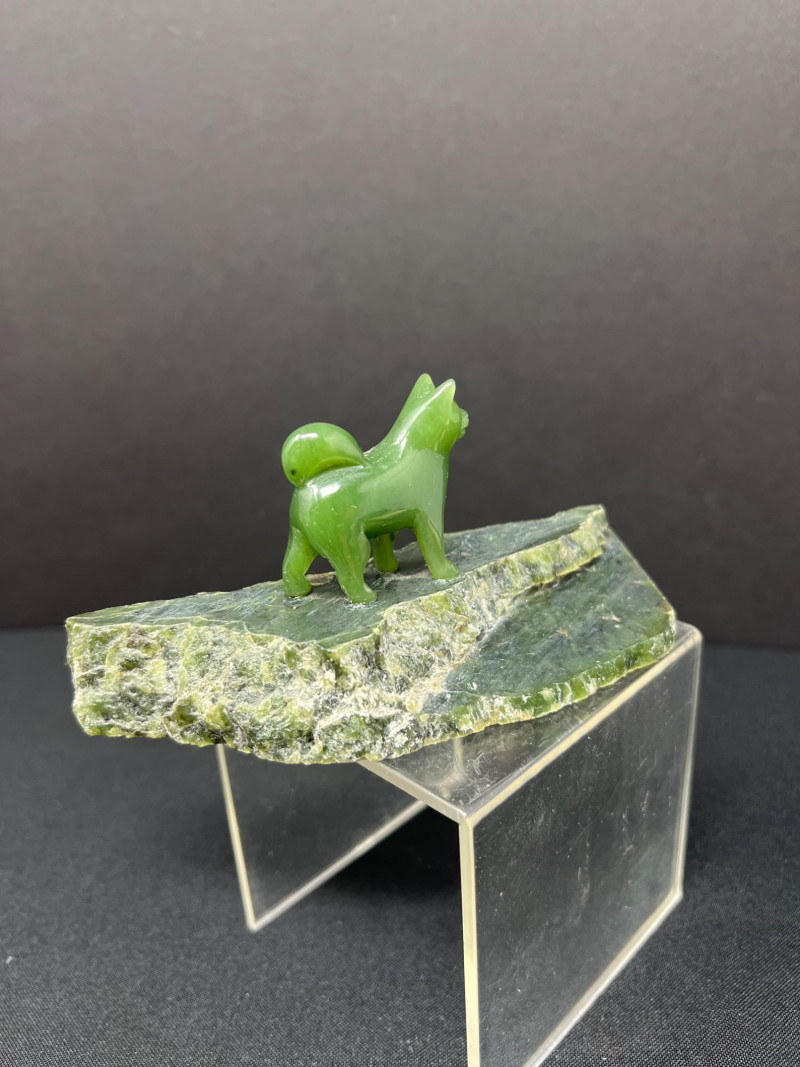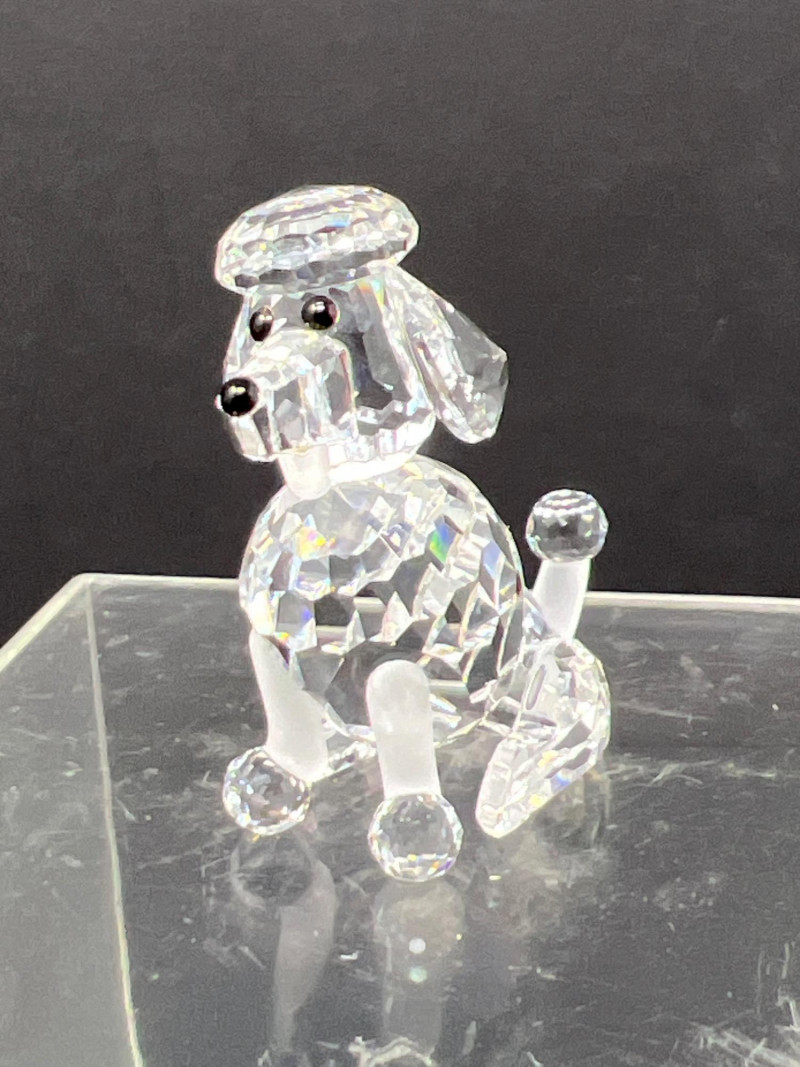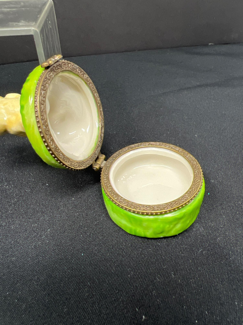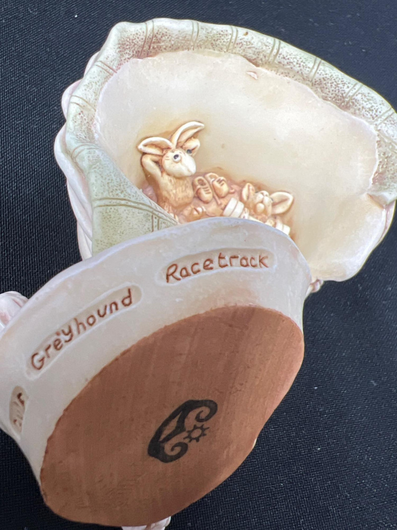 This charming collection features a variety of miniature dog figurines crafted from diverse materials including porcelain, crystal, jade-like stone, and resin. Highlights include: Harmony Kingdom "Retired Racers" Greyhound Box (2008) – A hand-painted collectible from England by Peter Calvesbert, with a hidden compartment and intricate detailing. Green Stone Carved Dogs – Two detailed dog carvings displayed on raw mineral bases, possibly jade or serpentine. Duke Sheltie Trinket Box Necklace – A decorative gold-accented Sheltie box that opens to reveal a tiny dog pendant on a gold-tone chain. Crystal Poodle Figurine – Swarovski crystal dog with fine features and glossy finish. Vintage Ceramic Dogs – Includes breeds like Golden Retriever (marked “1987” and “Made in China”), a Spaniel marked “Pewter”, and a yellow ceramic dog atop a green trinket box.