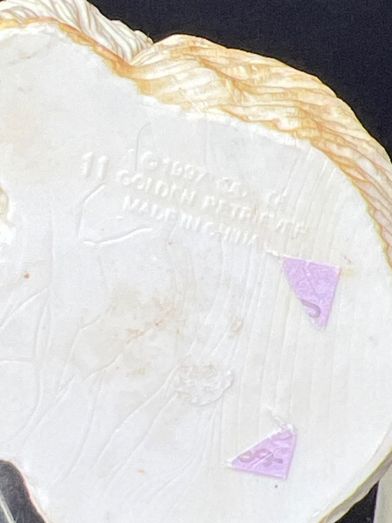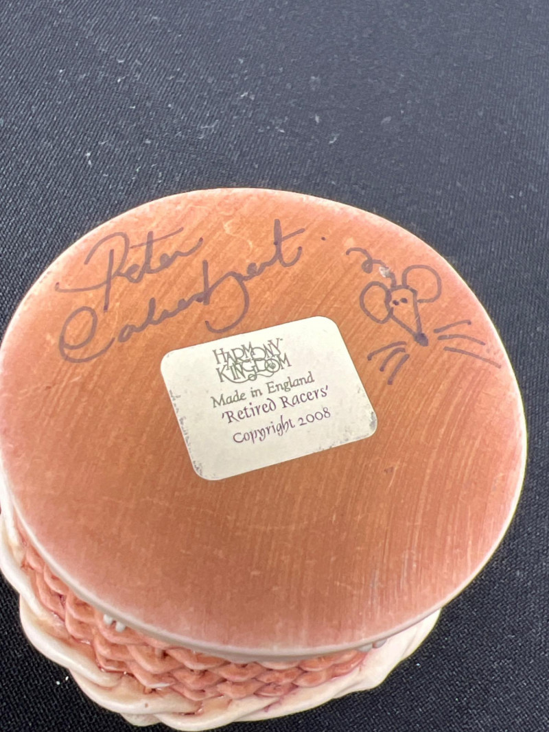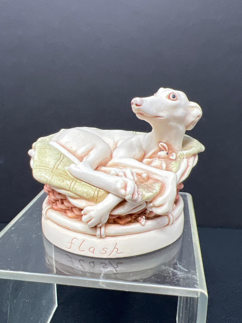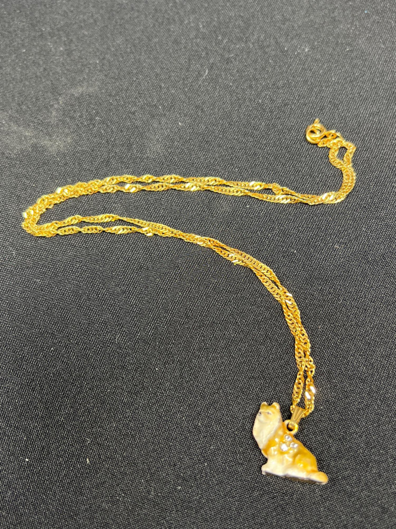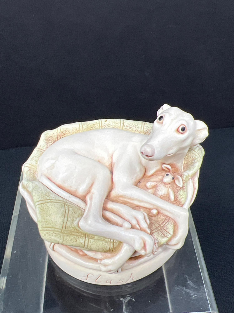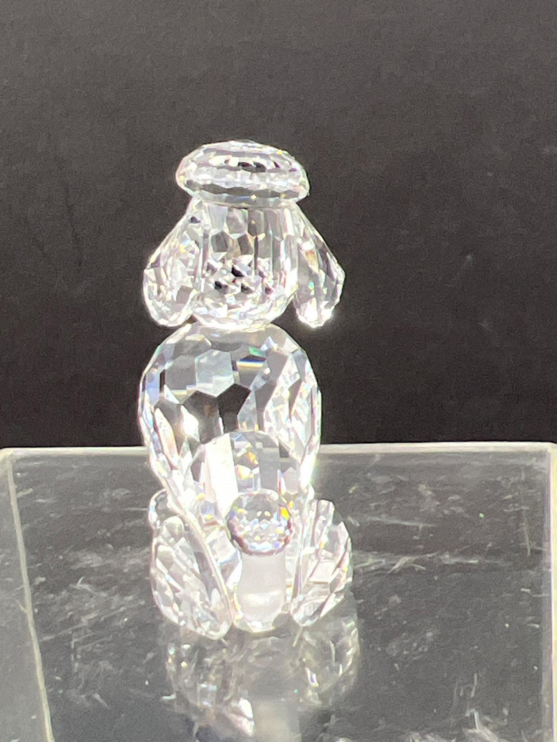 This charming collection features a variety of miniature dog figurines crafted from diverse materials including porcelain, crystal, jade-like stone, and resin. Highlights include: Harmony Kingdom "Retired Racers" Greyhound Box (2008) – A hand-painted collectible from England by Peter Calvesbert, with a hidden compartment and intricate detailing. Green Stone Carved Dogs – Two detailed dog carvings displayed on raw mineral bases, possibly jade or serpentine. Duke Sheltie Trinket Box Necklace – A decorative gold-accented Sheltie box that opens to reveal a tiny dog pendant on a gold-tone chain. Crystal Poodle Figurine – Swarovski crystal dog with fine features and glossy finish. Vintage Ceramic Dogs – Includes breeds like Golden Retriever (marked “1987” and “Made in China”), a Spaniel marked “Pewter”, and a yellow ceramic dog atop a green trinket box.