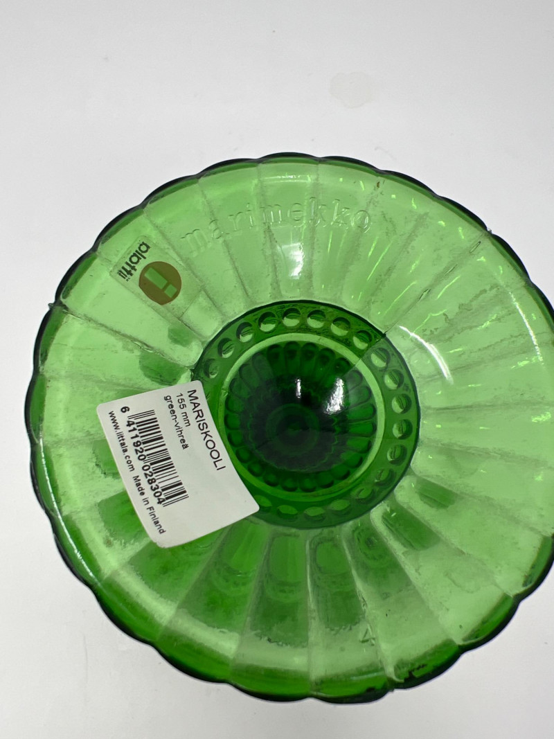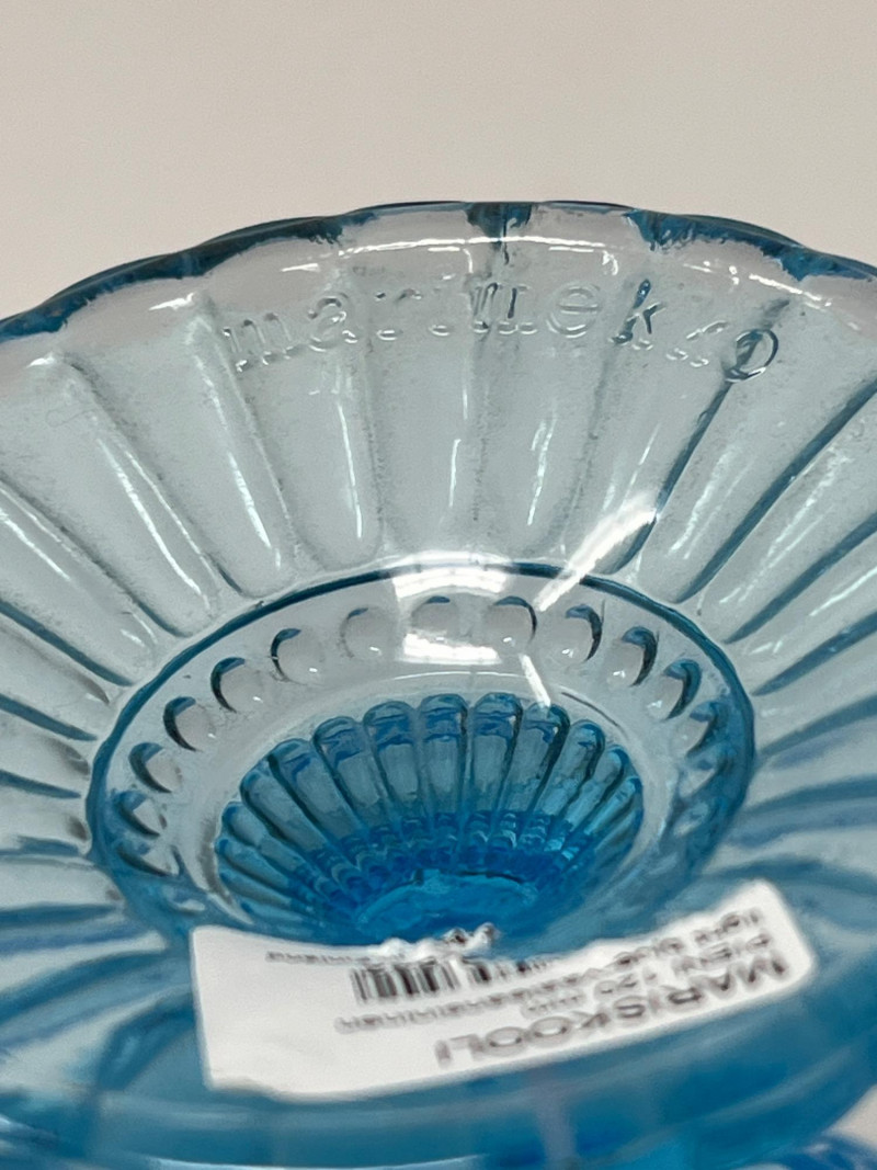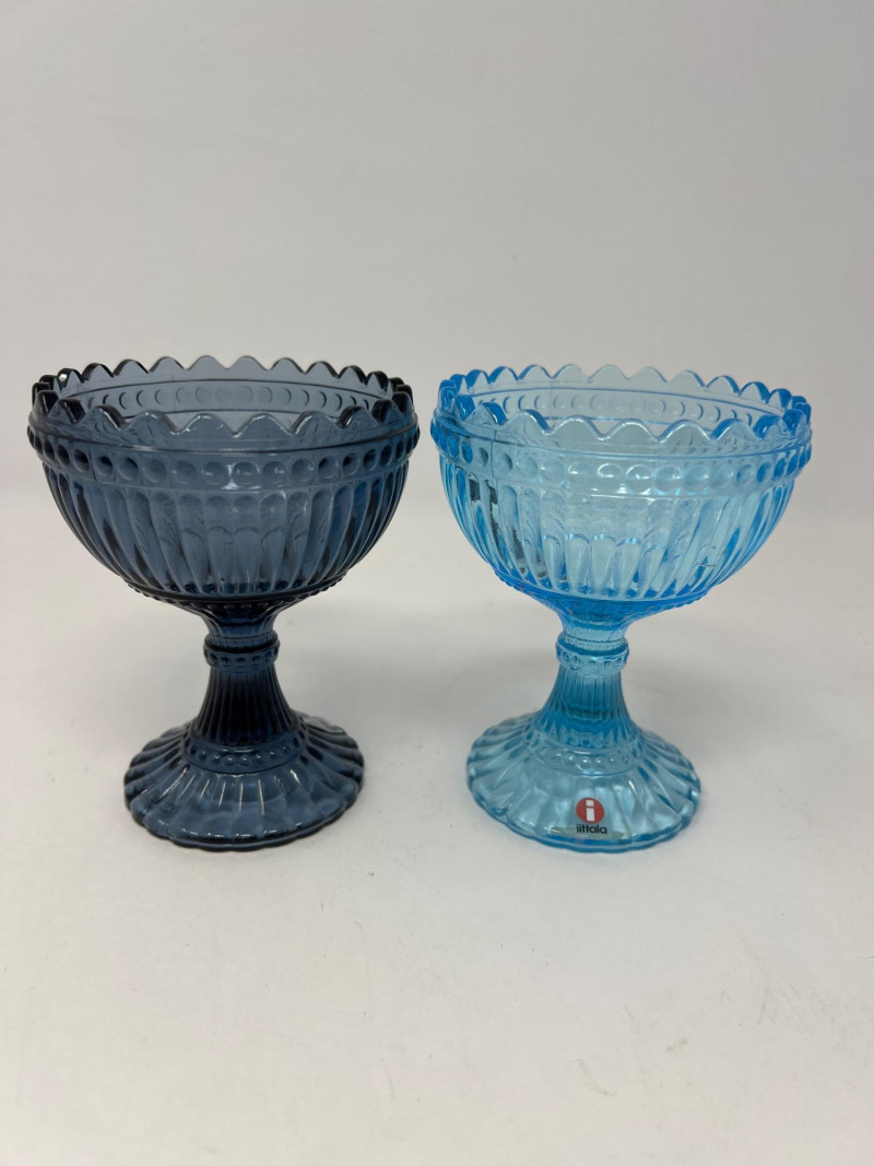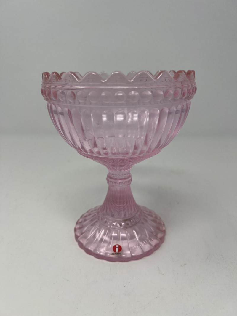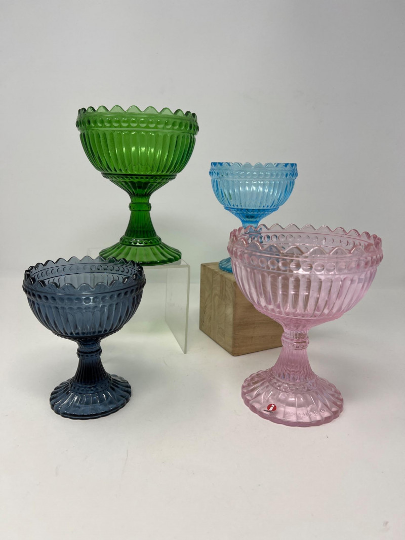 A beautiful set of four pedestal glass bowls by Iittala in collaboration with Marimekko, known as "Mariskooli." These iconic Finnish bowls feature scalloped rims, fluted bodies, and vibrant pressed glass in assorted colors: pink, green, blue, and smoky gray. Set Includes: Two bowls, 6” H x 4.75” diameter Two bowls, 5” H x 3.75” diameter Each is etched with the marimekko mark and retains the original Iittala label. Made in Finland. A classic blend of Scandinavian design and functional elegance