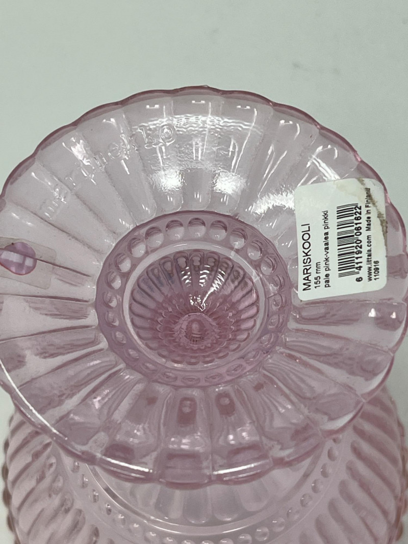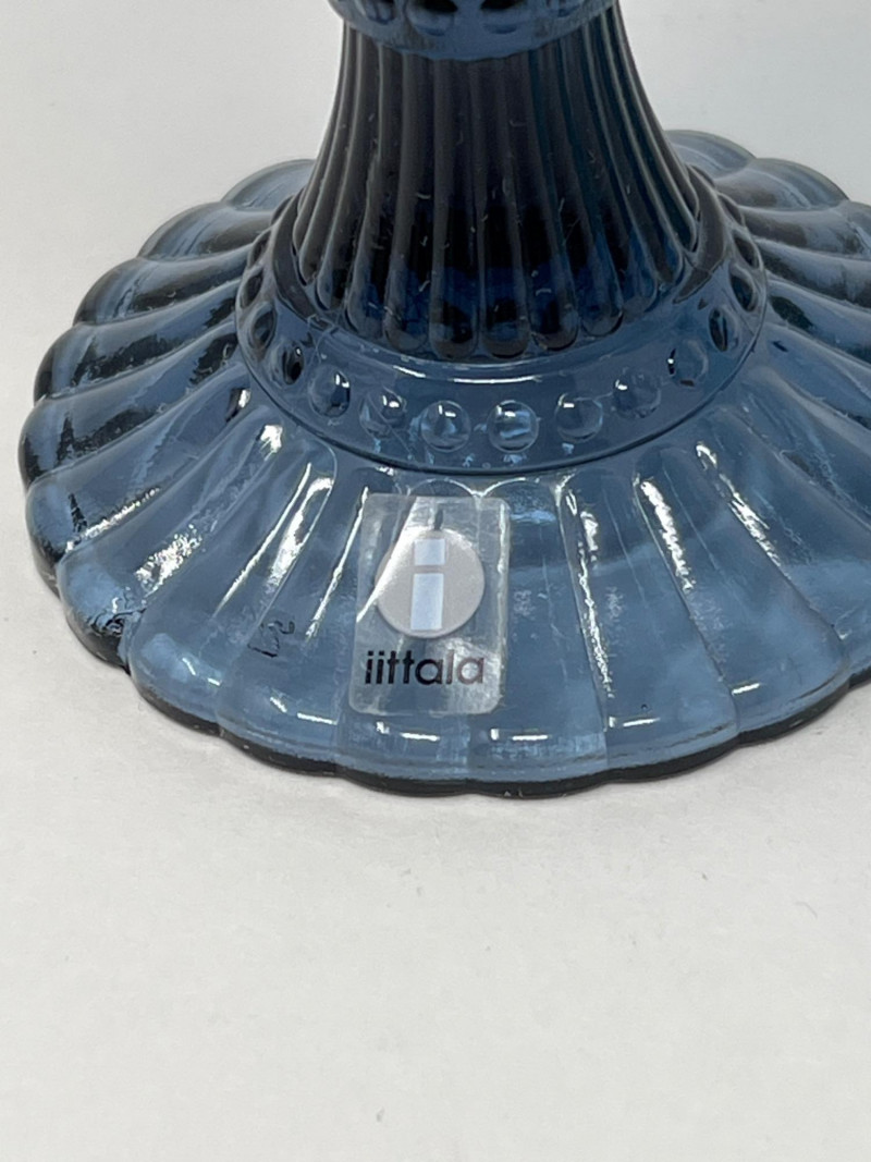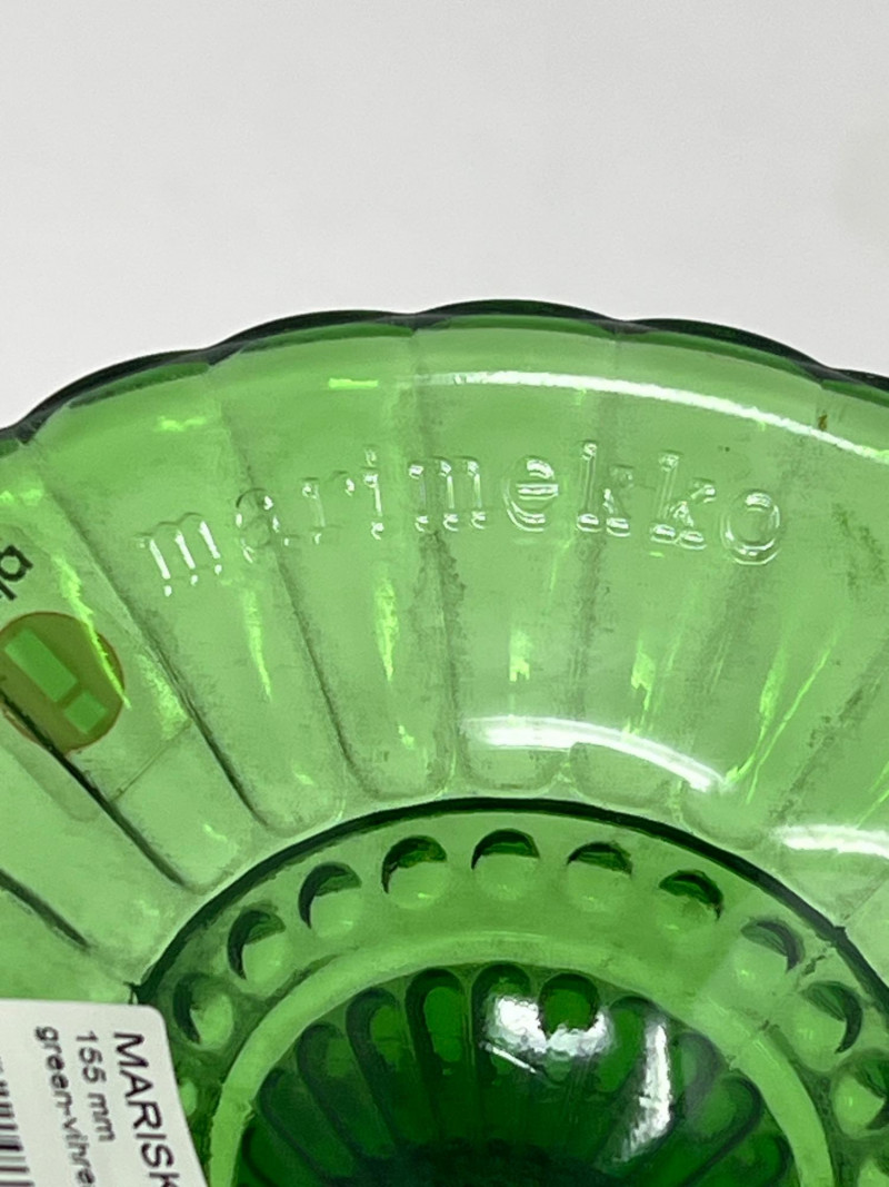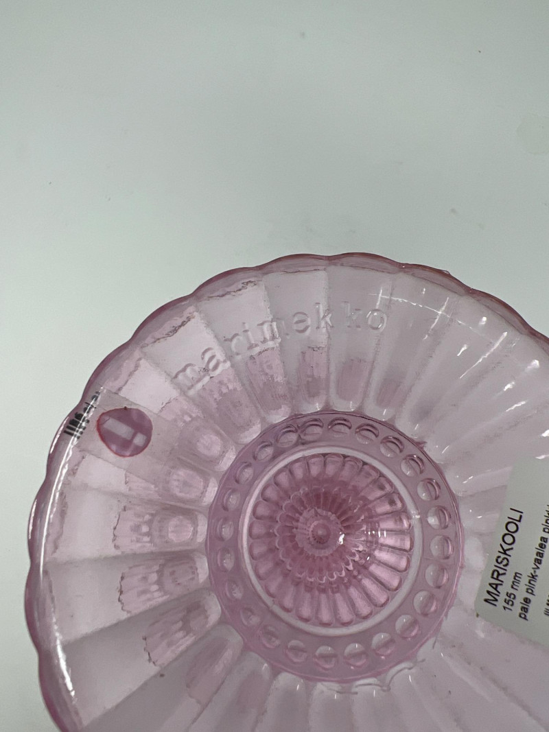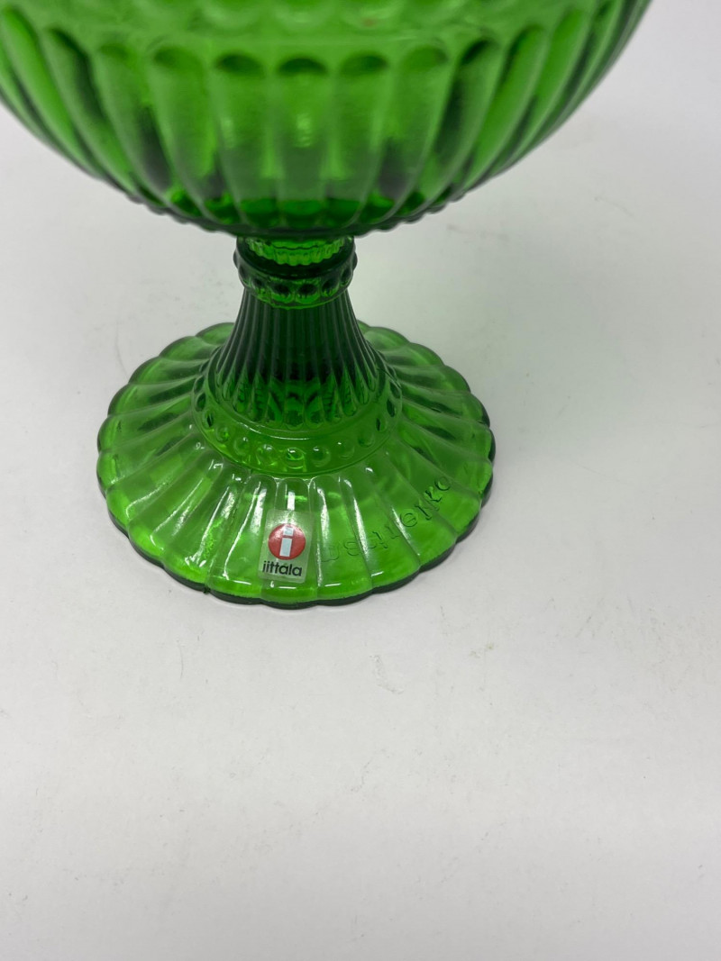 A beautiful set of four pedestal glass bowls by Iittala in collaboration with Marimekko, known as "Mariskooli." These iconic Finnish bowls feature scalloped rims, fluted bodies, and vibrant pressed glass in assorted colors: pink, green, blue, and smoky gray. Set Includes: Two bowls, 6” H x 4.75” diameter Two bowls, 5” H x 3.75” diameter Each is etched with the marimekko mark and retains the original Iittala label. Made in Finland. A classic blend of Scandinavian design and functional elegance