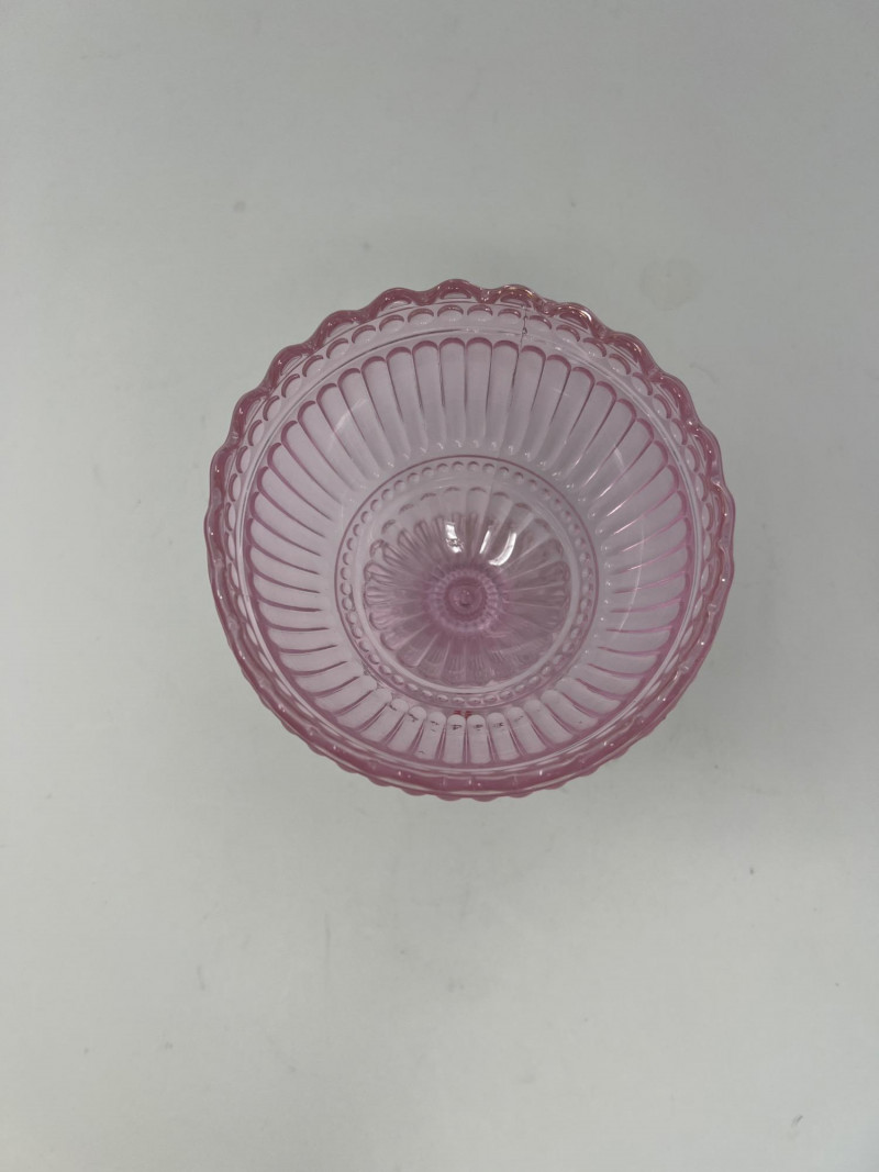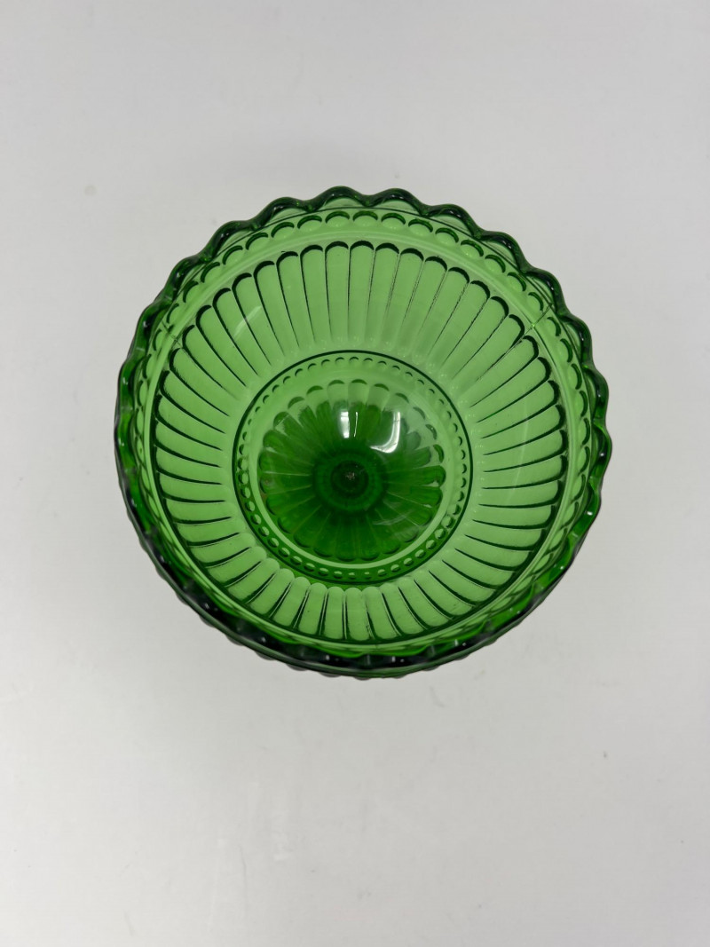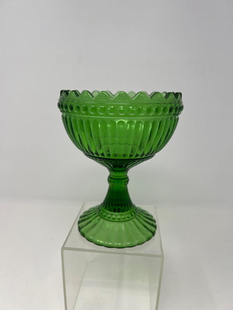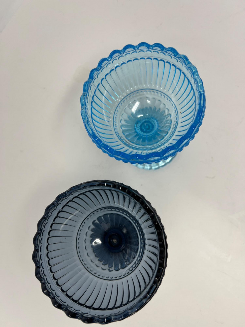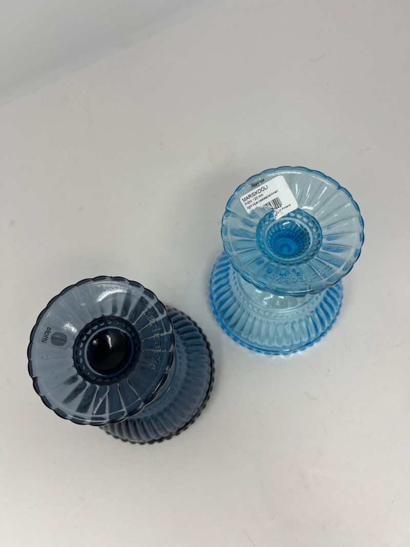 A beautiful set of four pedestal glass bowls by Iittala in collaboration with Marimekko, known as "Mariskooli." These iconic Finnish bowls feature scalloped rims, fluted bodies, and vibrant pressed glass in assorted colors: pink, green, blue, and smoky gray. Set Includes: Two bowls, 6” H x 4.75” diameter Two bowls, 5” H x 3.75” diameter Each is etched with the marimekko mark and retains the original Iittala label. Made in Finland. A classic blend of Scandinavian design and functional elegance