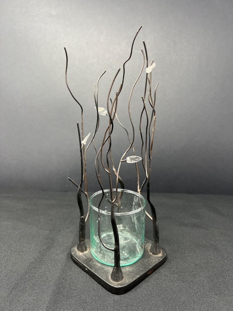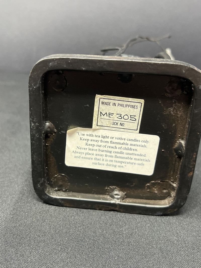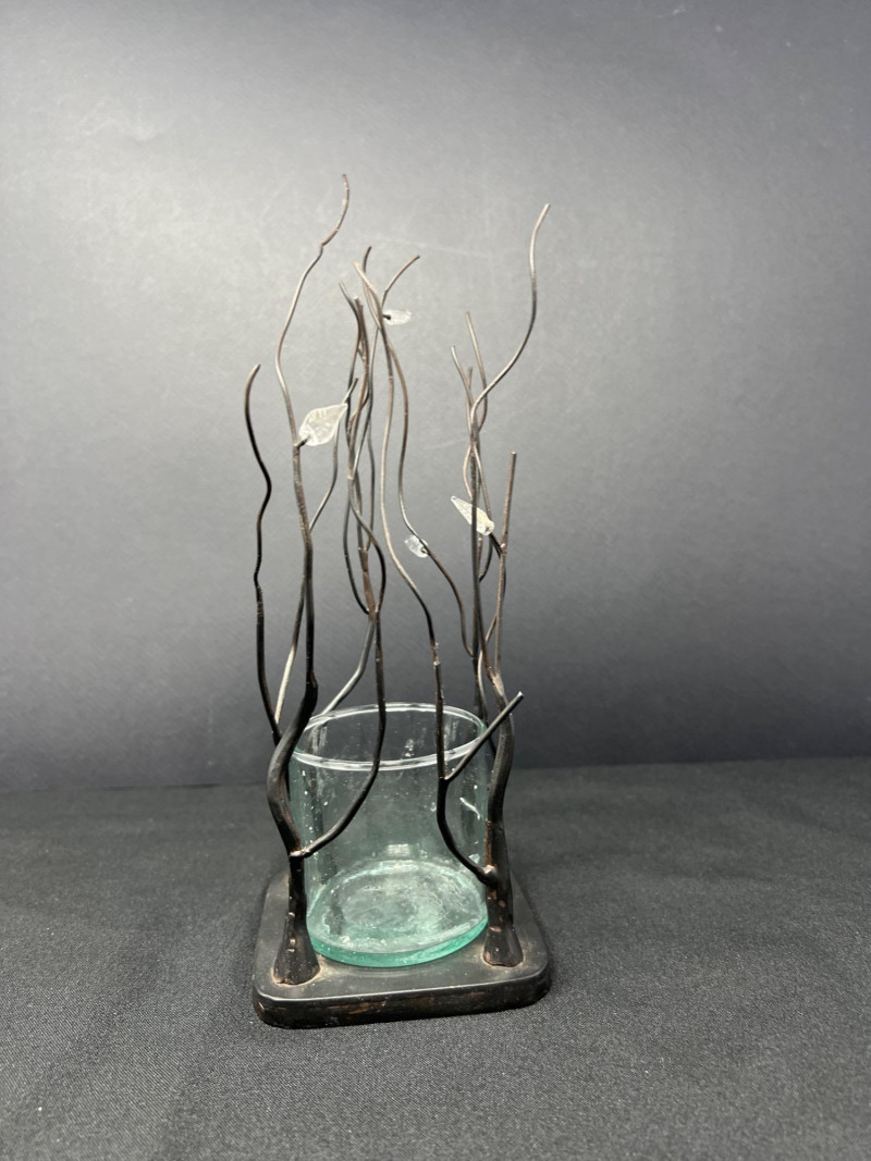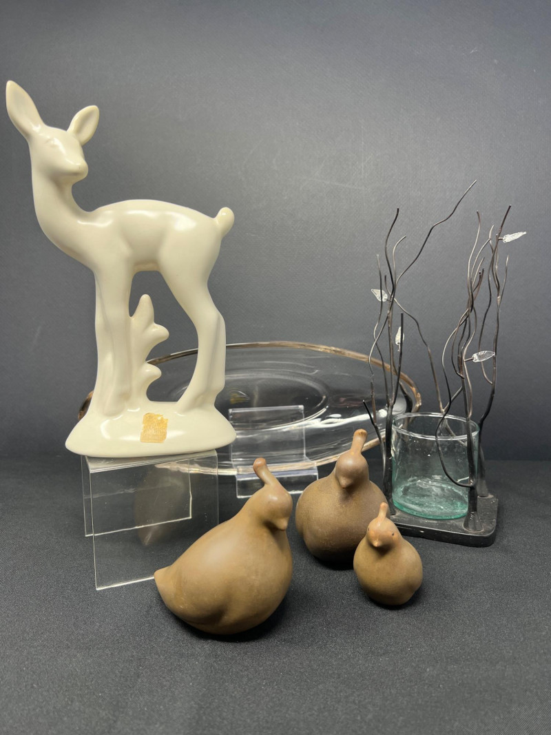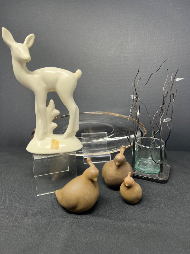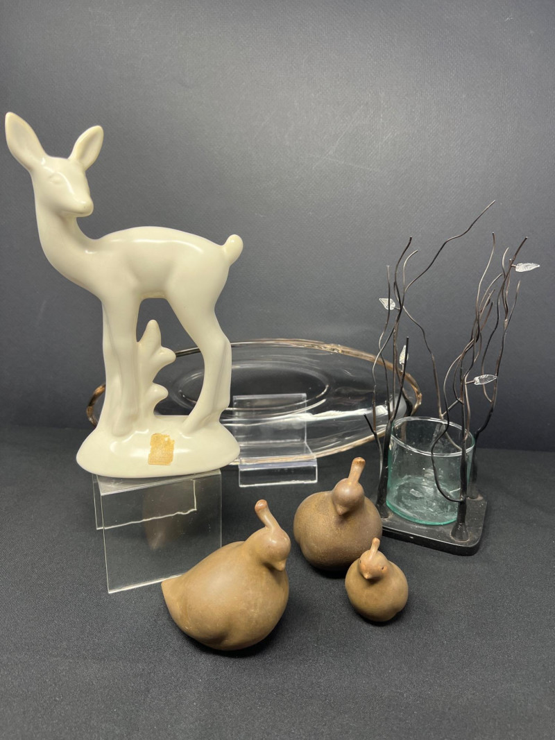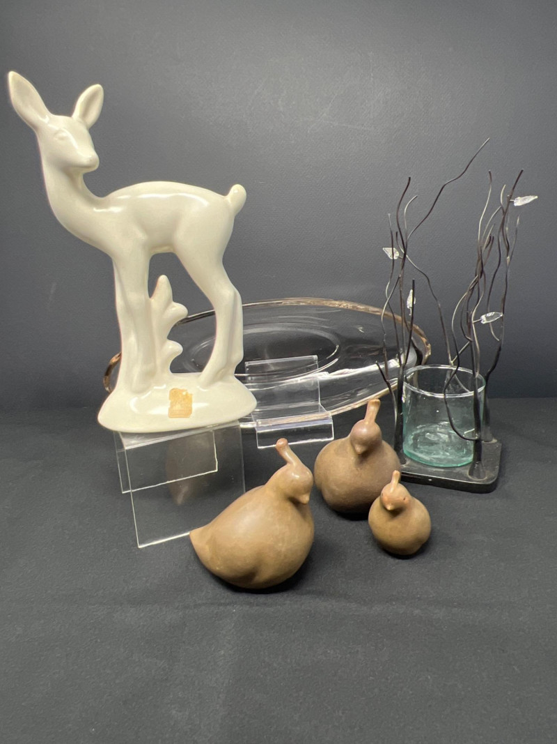 A thoughtfully curated grouping of mid-century decorative pieces, ideal for vintage collectors or anyone looking to enhance their space with retro charm. 1. Hollywood Ware Ceramic Deer Figurine A sleek and elegant ceramic deer in glossy ivory glaze, showcasing the clean lines and organic form typical of mid-century design. Original partial label reads Hollywood Ware – California Art Products – Los Angeles, indicating its mid-20th-century American studio pottery origin. Stands approx. 8.5" tall and 5" wide. Base shows wear and surface marks consistent with age. A classic MCM display piece with sculptural appeal. 2. Set of 3 Brown Ceramic Quail Figurines A family trio of stylized quail in earthy matte brown ceramic. Smooth, rounded silhouettes and simple detailing embody a minimalist aesthetic. Dimensions: Large: 3.5" H x 4" L Medium: 3.5" H x 3.75" L Small: 2" H x 2" L 3. Metal Votive Candle Holder with Glass Insert and Leaf Branch Design Unique sculptural votive holder featuring black metal tendrils with clear acrylic “leaves” rising from a square base. Includes a green-tinted glass votive cup for tea lights. Bottom labeled “Made in Philippines – MF 305.” Measures approx. 10" tall with a 4" x 4" base. A striking blend of nature-inspired art and function 4. Clear Oval Glass MCM Dish Elegant and lightweight clear glass dish with soft amber tint along the rim. Approx. 11" long x 4.5" wide x 2" high.