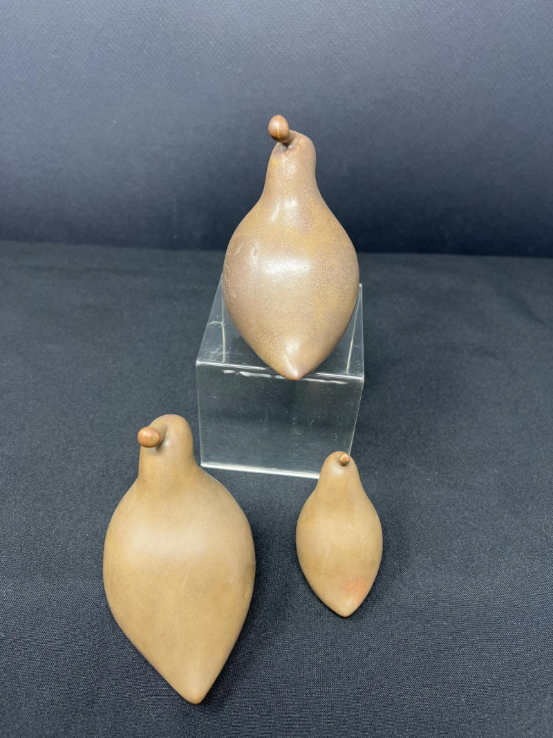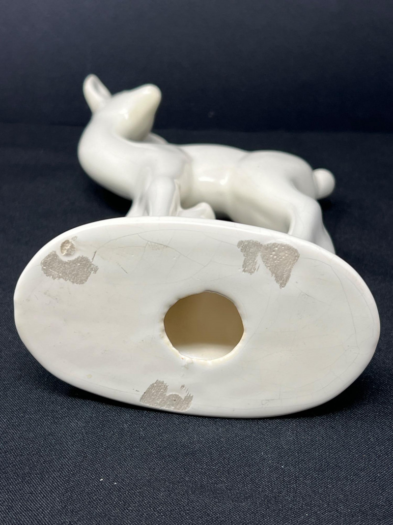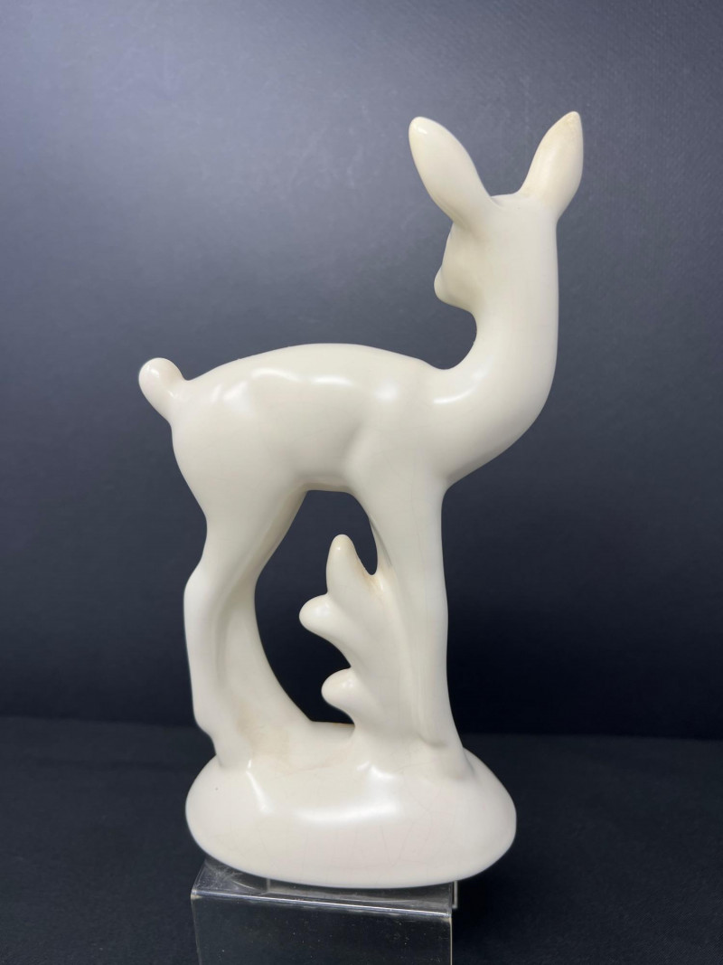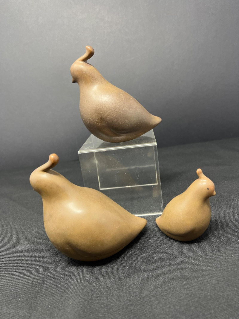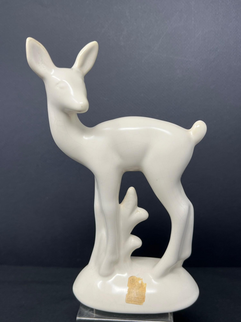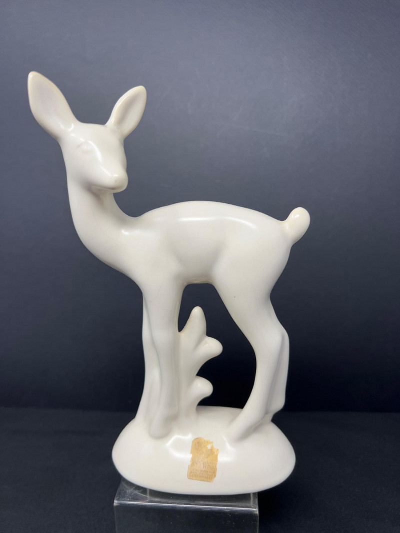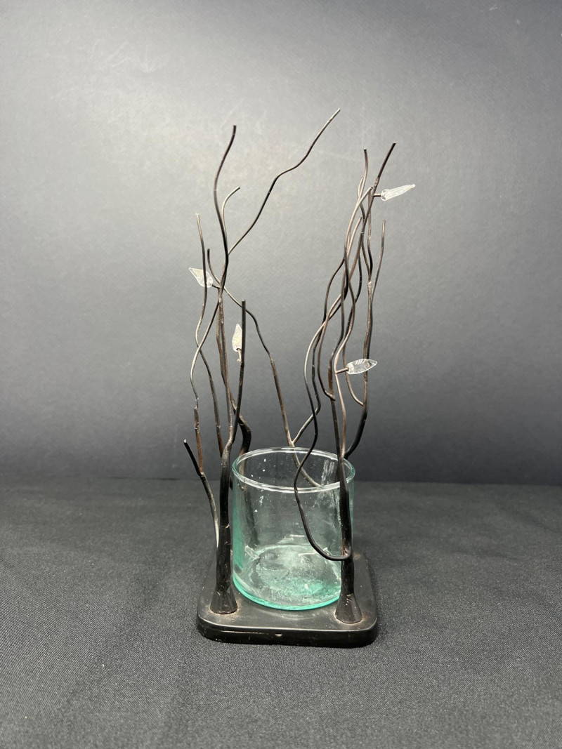 A thoughtfully curated grouping of mid-century decorative pieces, ideal for vintage collectors or anyone looking to enhance their space with retro charm. 1. Hollywood Ware Ceramic Deer Figurine A sleek and elegant ceramic deer in glossy ivory glaze, showcasing the clean lines and organic form typical of mid-century design. Original partial label reads Hollywood Ware – California Art Products – Los Angeles, indicating its mid-20th-century American studio pottery origin. Stands approx. 8.5" tall and 5" wide. Base shows wear and surface marks consistent with age. A classic MCM display piece with sculptural appeal. 2. Set of 3 Brown Ceramic Quail Figurines A family trio of stylized quail in earthy matte brown ceramic. Smooth, rounded silhouettes and simple detailing embody a minimalist aesthetic. Dimensions: Large: 3.5" H x 4" L Medium: 3.5" H x 3.75" L Small: 2" H x 2" L 3. Metal Votive Candle Holder with Glass Insert and Leaf Branch Design Unique sculptural votive holder featuring black metal tendrils with clear acrylic “leaves” rising from a square base. Includes a green-tinted glass votive cup for tea lights. Bottom labeled “Made in Philippines – MF 305.” Measures approx. 10" tall with a 4" x 4" base. A striking blend of nature-inspired art and function 4. Clear Oval Glass MCM Dish Elegant and lightweight clear glass dish with soft amber tint along the rim. Approx. 11" long x 4.5" wide x 2" high.
