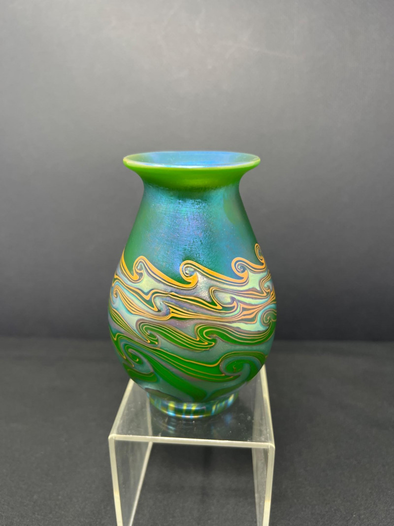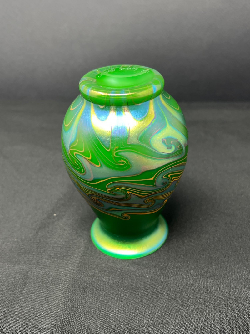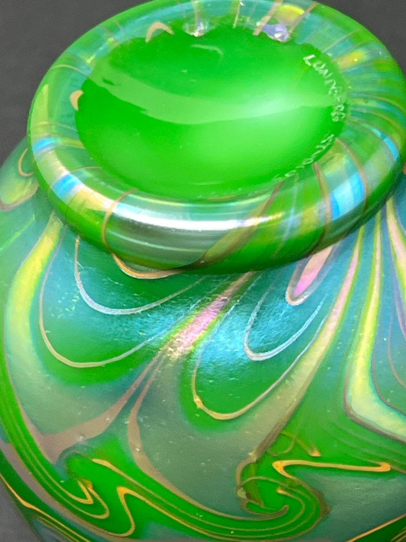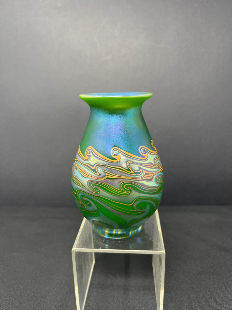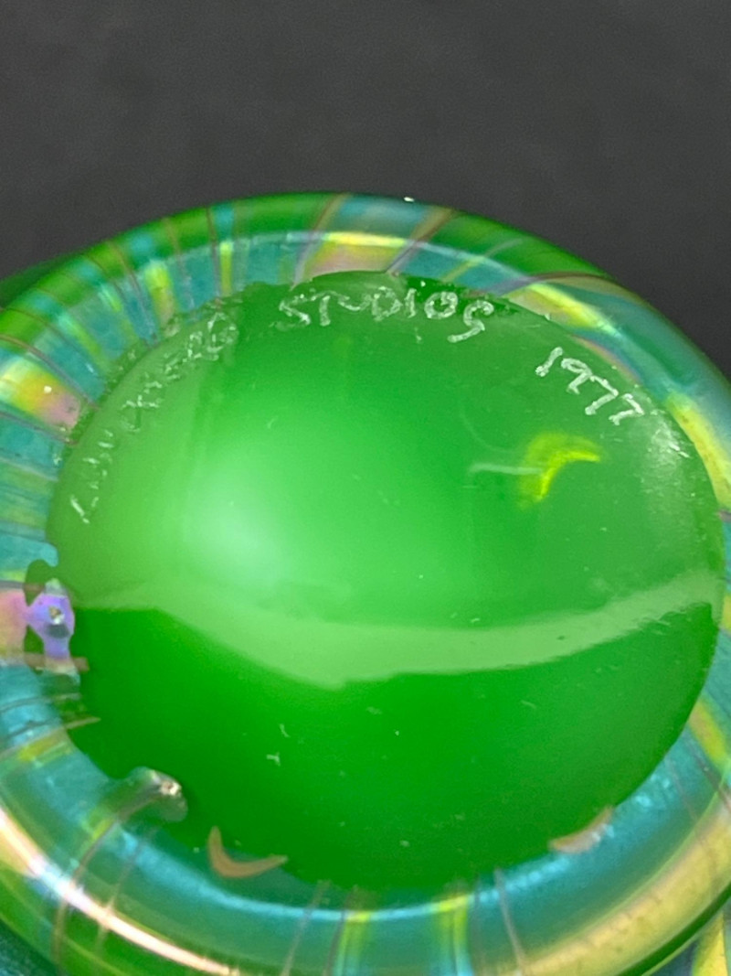 This hand-blown art glass vase by Lundberg Studios showcases a mesmerizing iridescent finish in vibrant shades of green, teal, and gold. The swirling wave-like patterns are skillfully layered, creating a fluid motion effect around the body of the vase. Signed and dated “Lundberg Studios 1977” on the polished pontil base, this piece reflects the studio’s mastery in glassmaking techniques developed during the American studio glass movement. The luminous sheen and unique form suggest the use of metallic oxides, contributing to its radiant, oil-slick surface—a hallmark of Lundberg’s signature style. Details: Artist: Lundberg Studios Year: 1977 Material: Iridescent hand-blown glass Features: Multicolor swirl design, signature on base