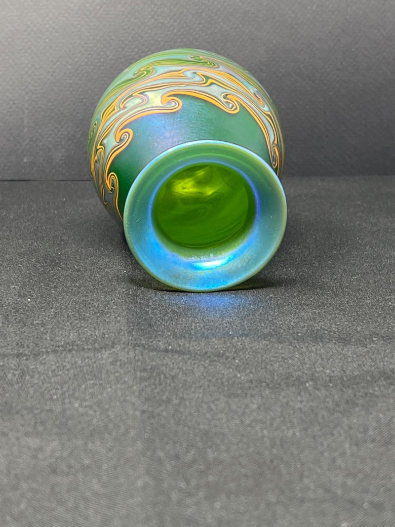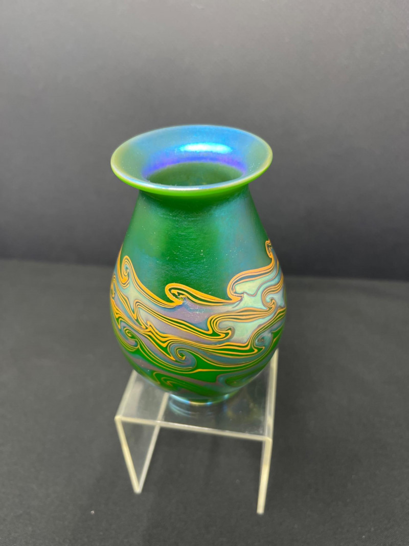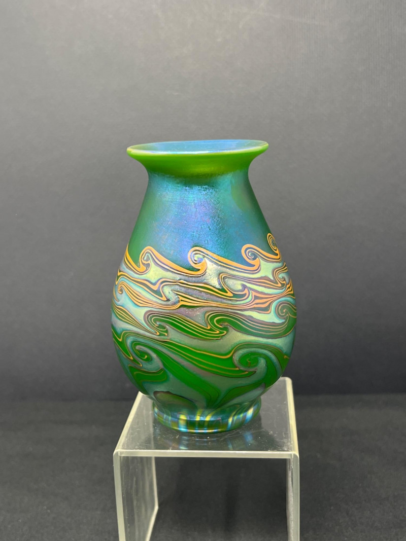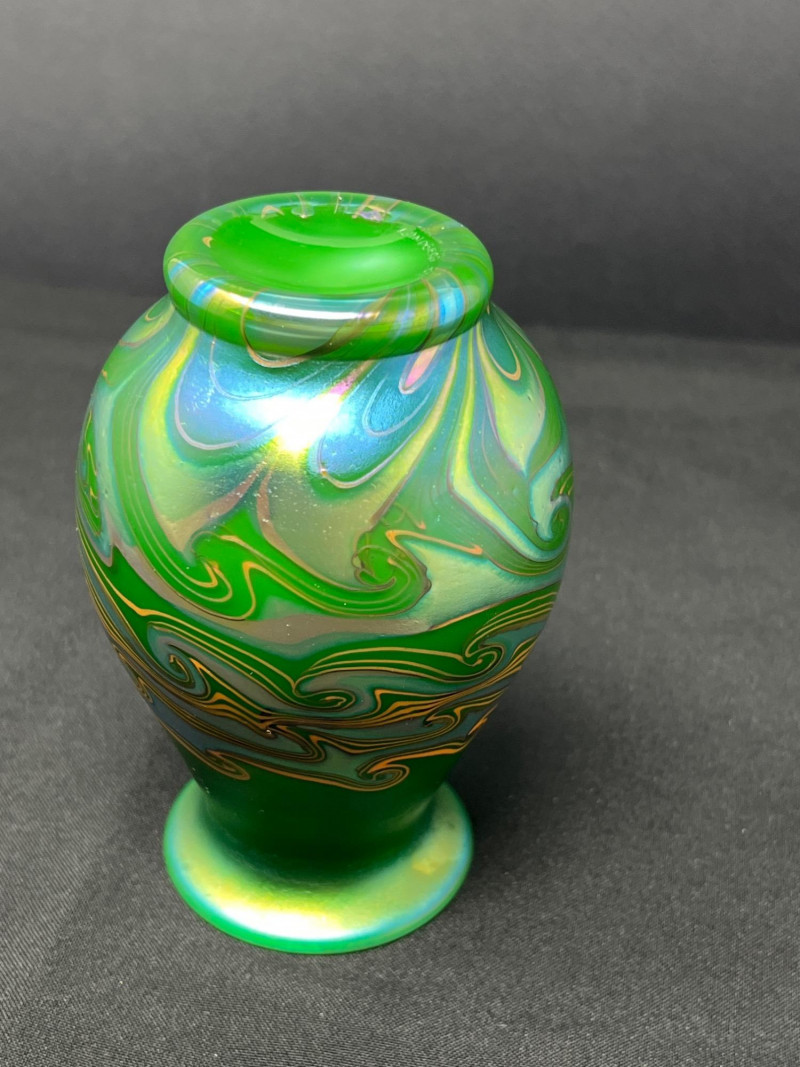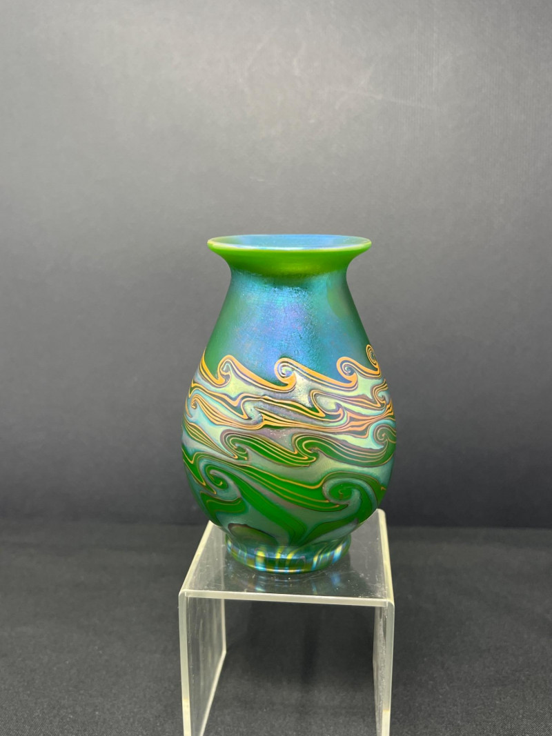This hand-blown art glass vase by Lundberg Studios showcases a mesmerizing iridescent finish in vibrant shades of green, teal, and gold. The swirling wave-like patterns are skillfully layered, creating a fluid motion effect around the body of the vase. Signed and dated “Lundberg Studios 1977” on the polished pontil base, this piece reflects the studio’s mastery in glassmaking techniques developed during the American studio glass movement. The luminous sheen and unique form suggest the use of metallic oxides, contributing to its radiant, oil-slick surface—a hallmark of Lundberg’s signature style. Details: Artist: Lundberg Studios Year: 1977 Material: Iridescent hand-blown glass Features: Multicolor swirl design, signature on base