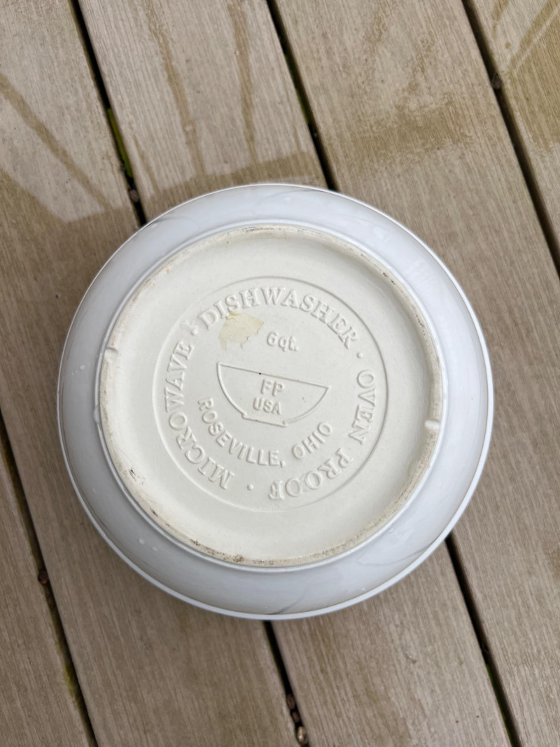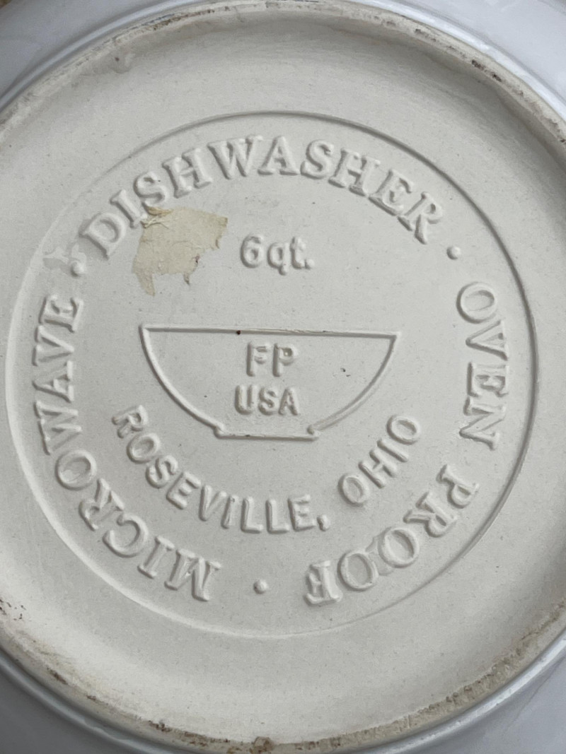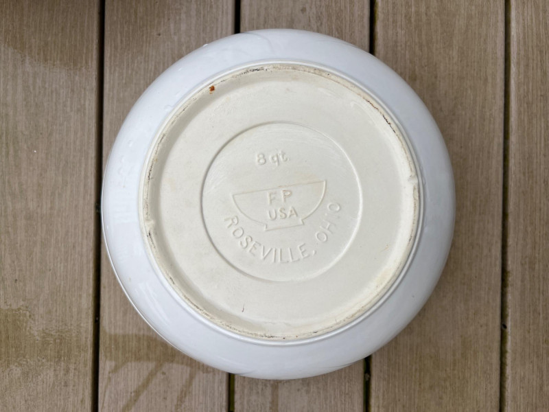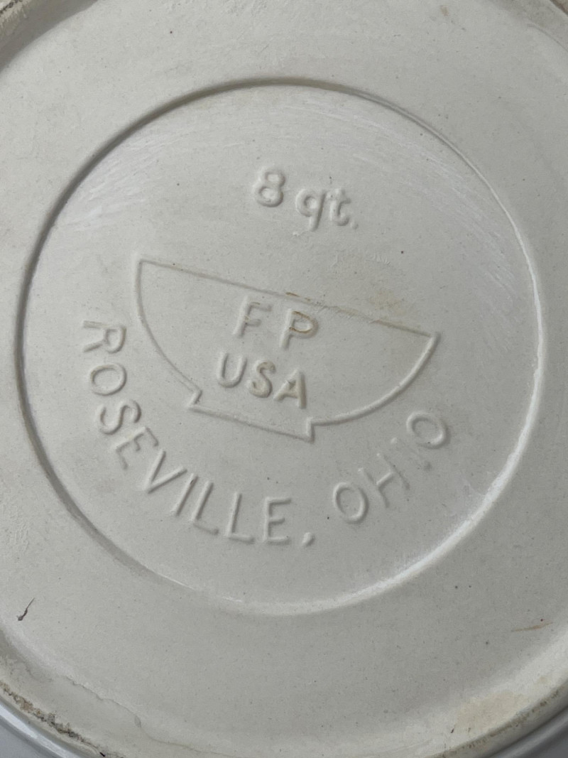 A classic and functional set of vintage glazed pottery bowls from Roseville, Ohio, perfect for both everyday use and display. Set Includes: One 8-quart bowl – stamped “FP USA, Roseville, Ohio” One 6-quart bowl – stamped “FP USA, Roseville, Ohio”; marked microwave, oven, and dishwasher safe Features: Timeless ivory glaze with horizontal ribbed design Heavy and durable construction Functional and decorative Made in the USA