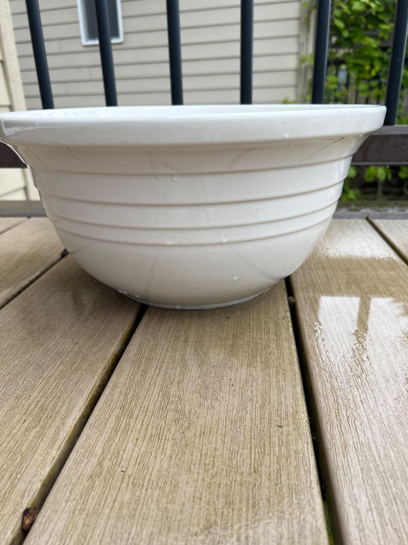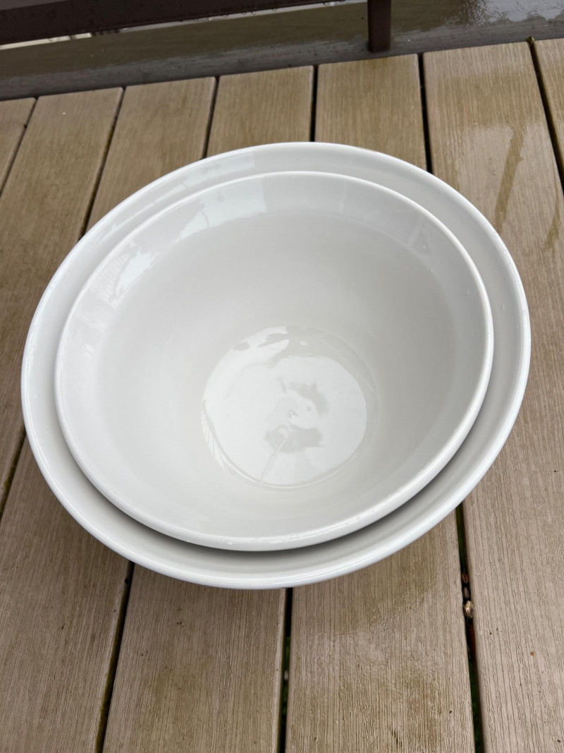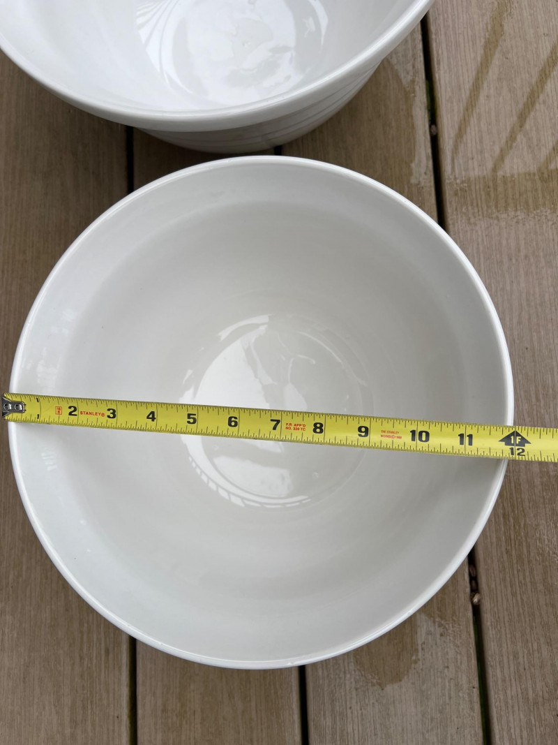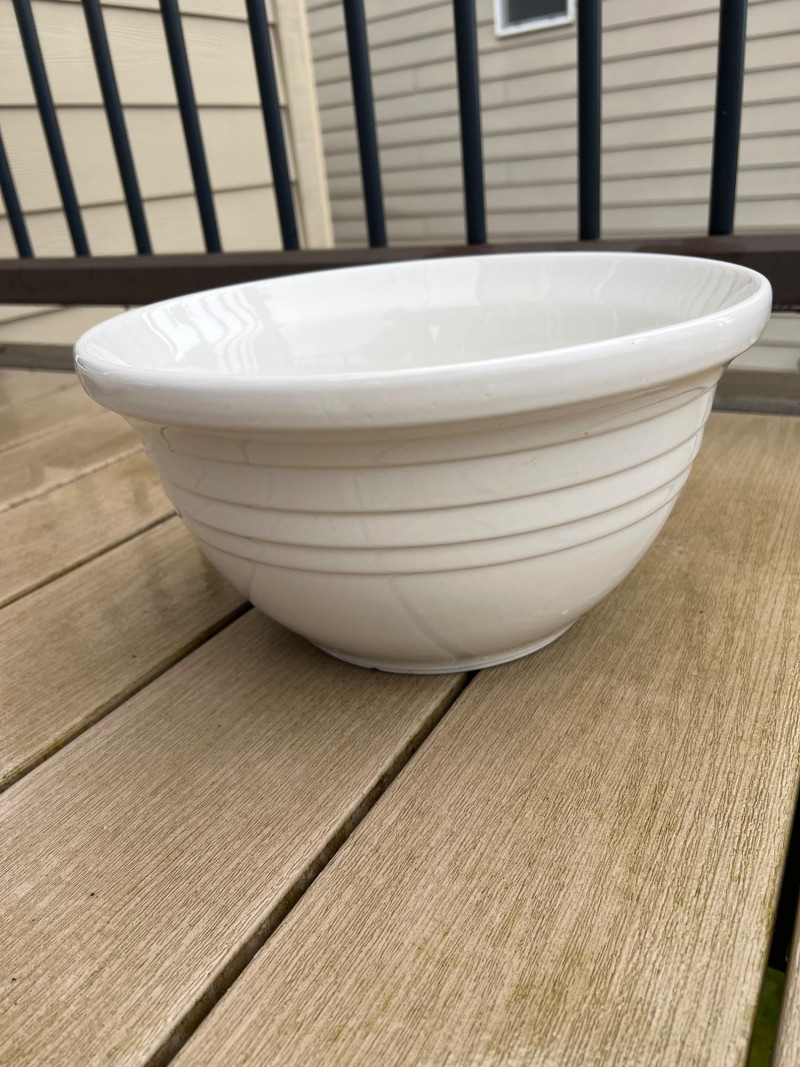 A classic and functional set of vintage glazed pottery bowls from Roseville, Ohio, perfect for both everyday use and display. Set Includes: One 8-quart bowl – stamped “FP USA, Roseville, Ohio” One 6-quart bowl – stamped “FP USA, Roseville, Ohio”; marked microwave, oven, and dishwasher safe Features: Timeless ivory glaze with horizontal ribbed design Heavy and durable construction Functional and decorative Made in the USA