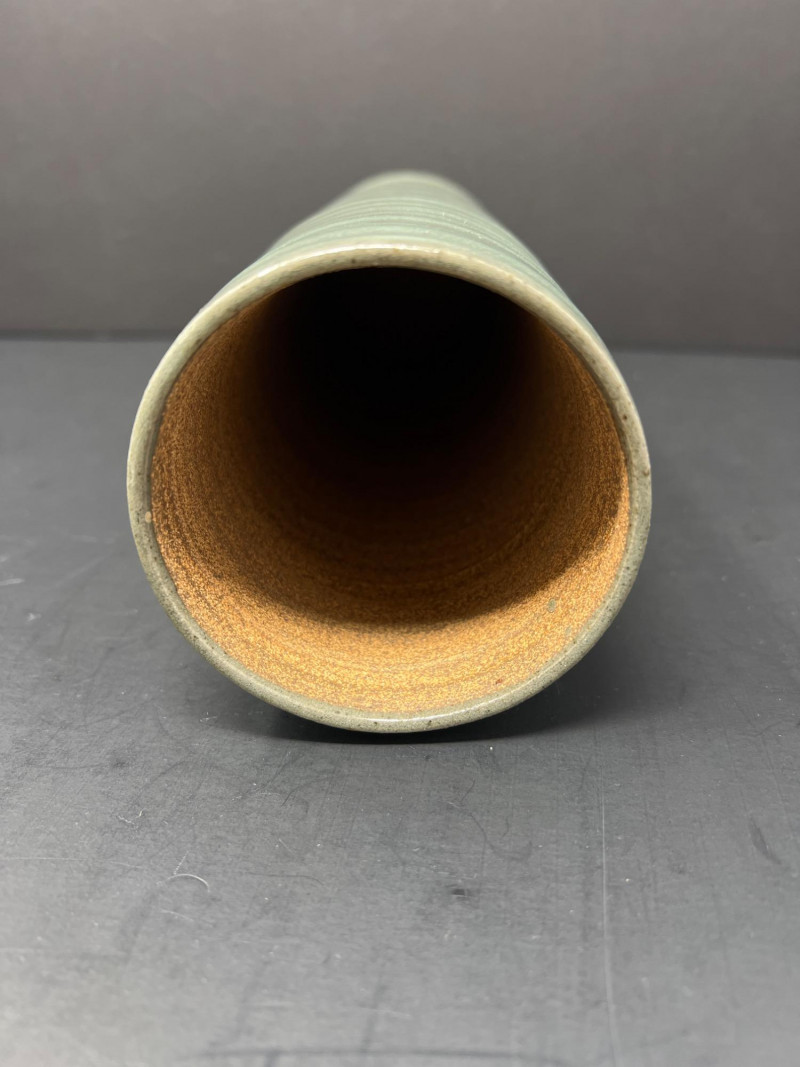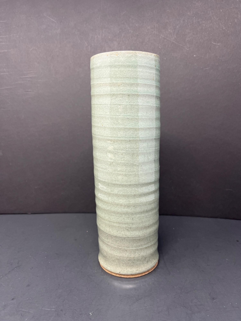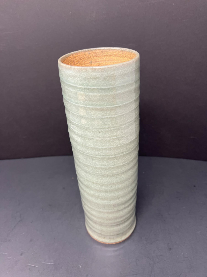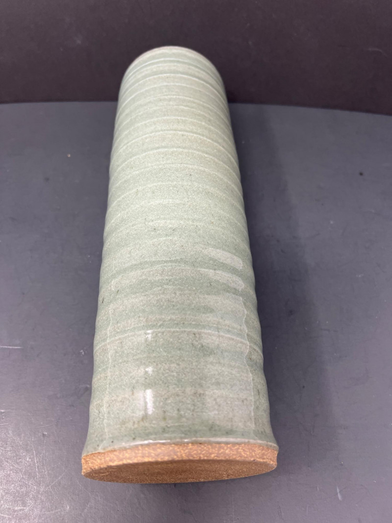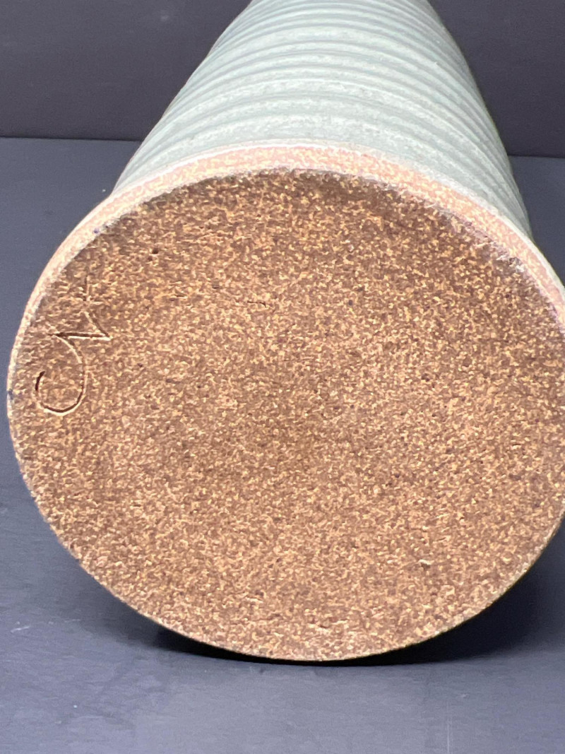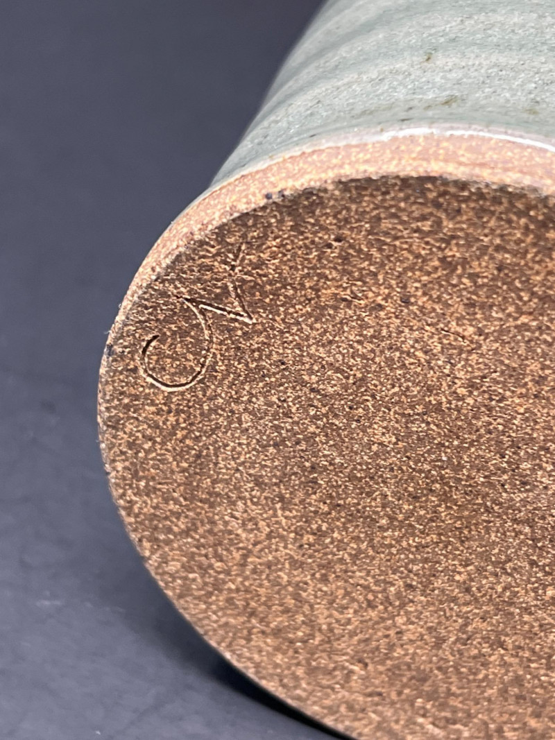 Hand-thrown with a soft green glaze and subtle horizontal banding. Interior unglazed. Signed on base with "CN".