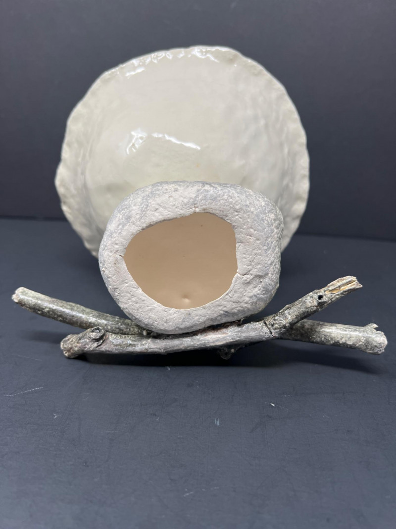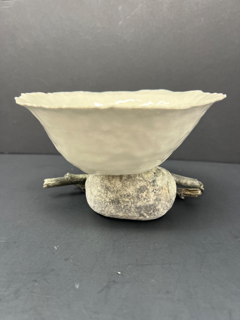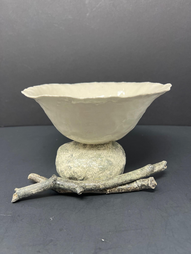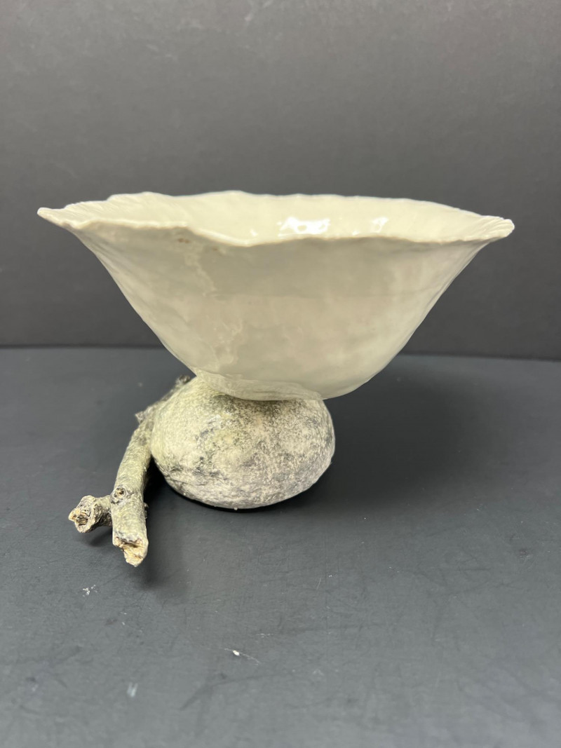 Sculptural organic bowl glazed in gloss ivory-white. Perched atop a faux stone and twig-textured base for an artful display presence.
