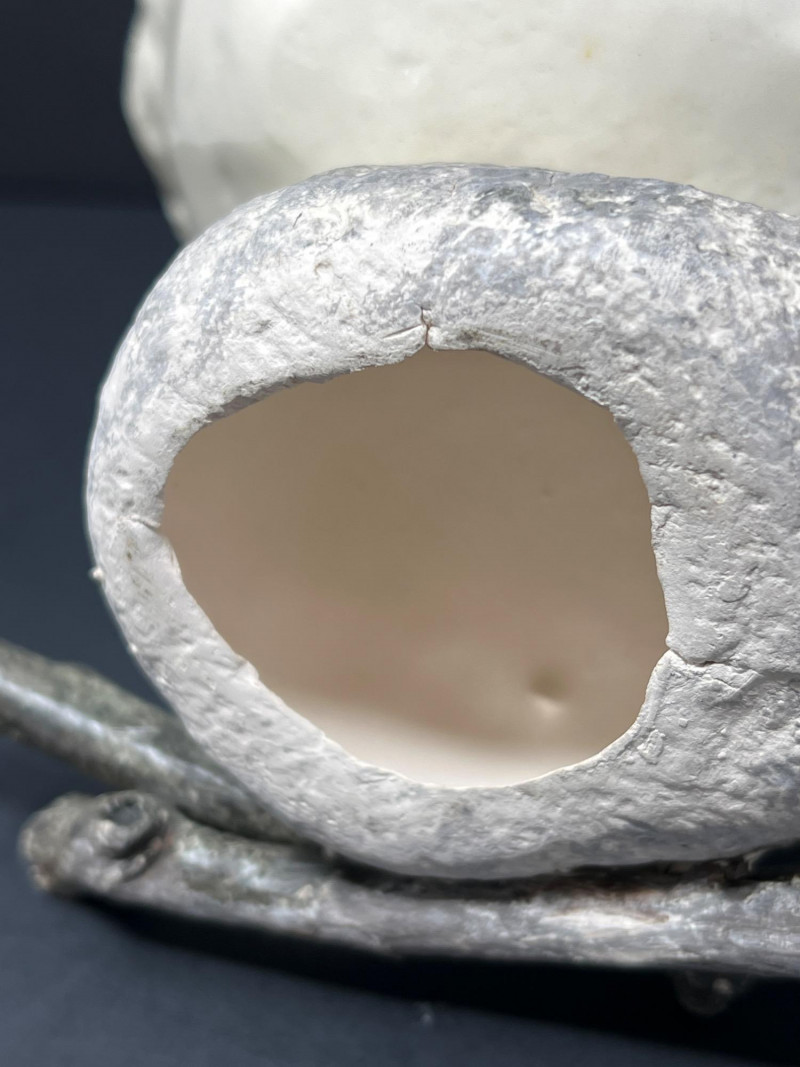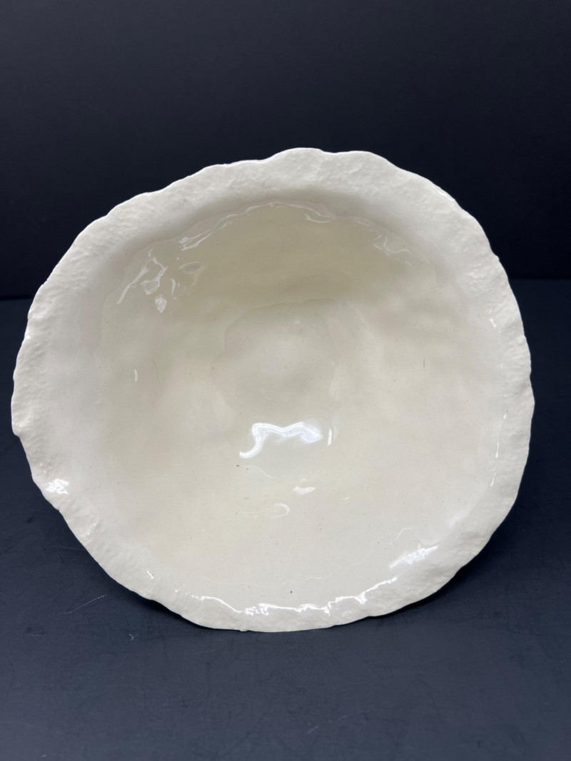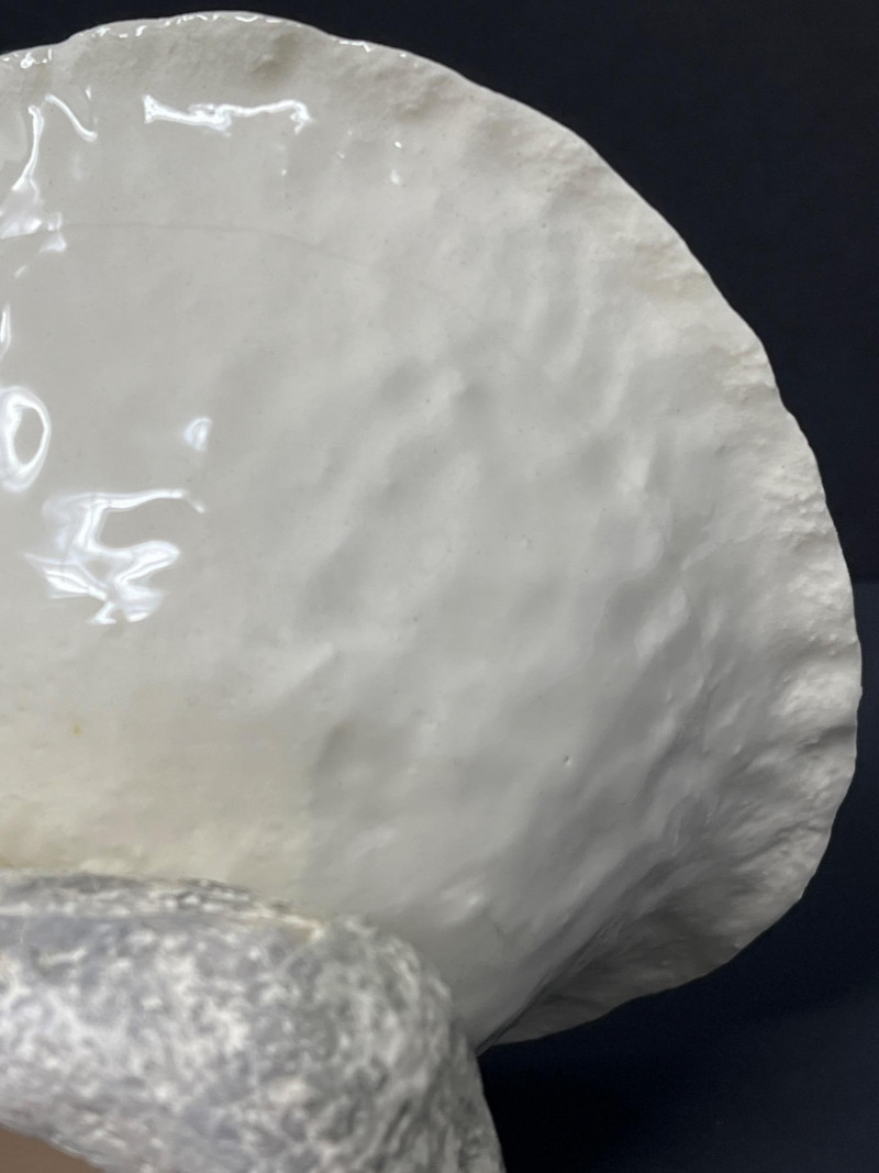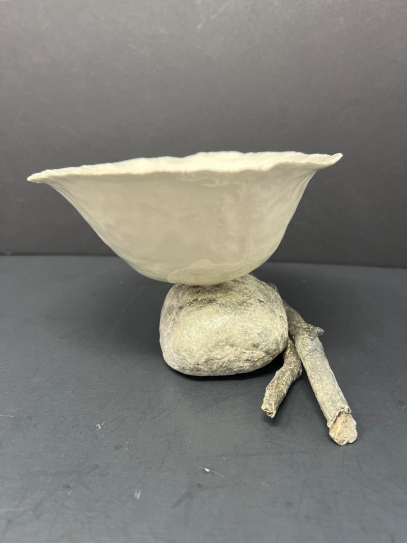 Sculptural organic bowl glazed in gloss ivory-white. Perched atop a faux stone and twig-textured base for an artful display presence.
