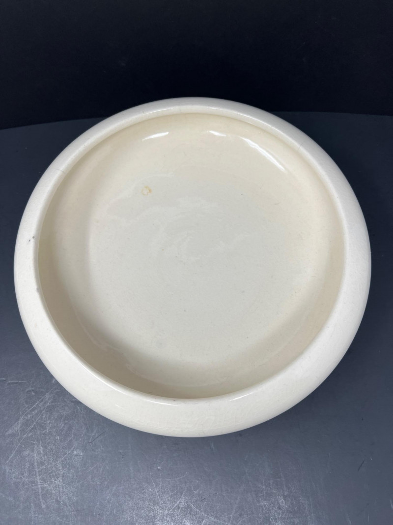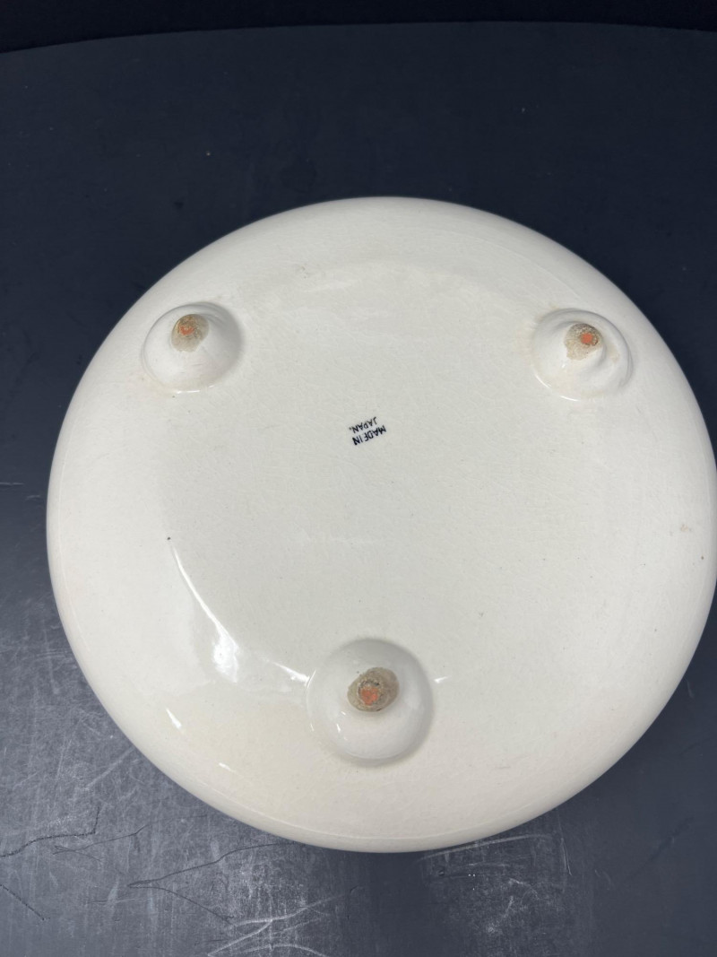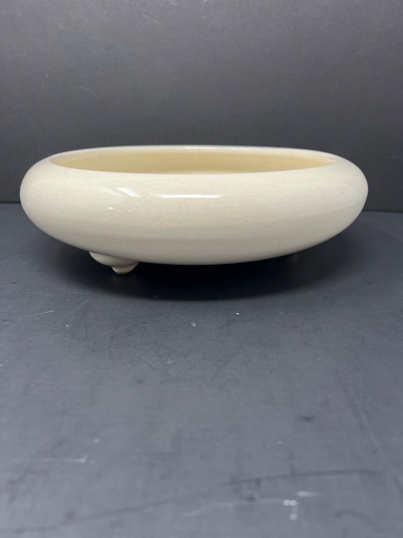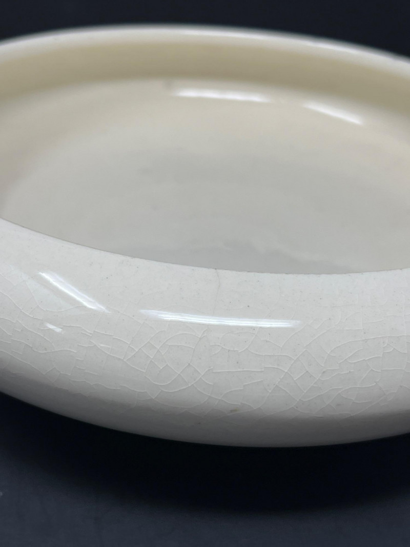 Wide, low-profile bowl in warm ivory crackle glaze. Marked "Made in Japan" on base. Classic vintage form with a soft luster.
