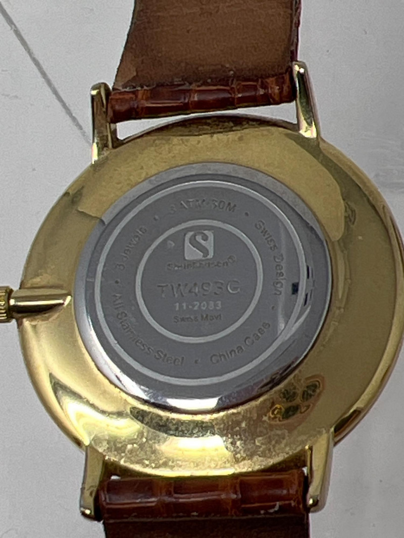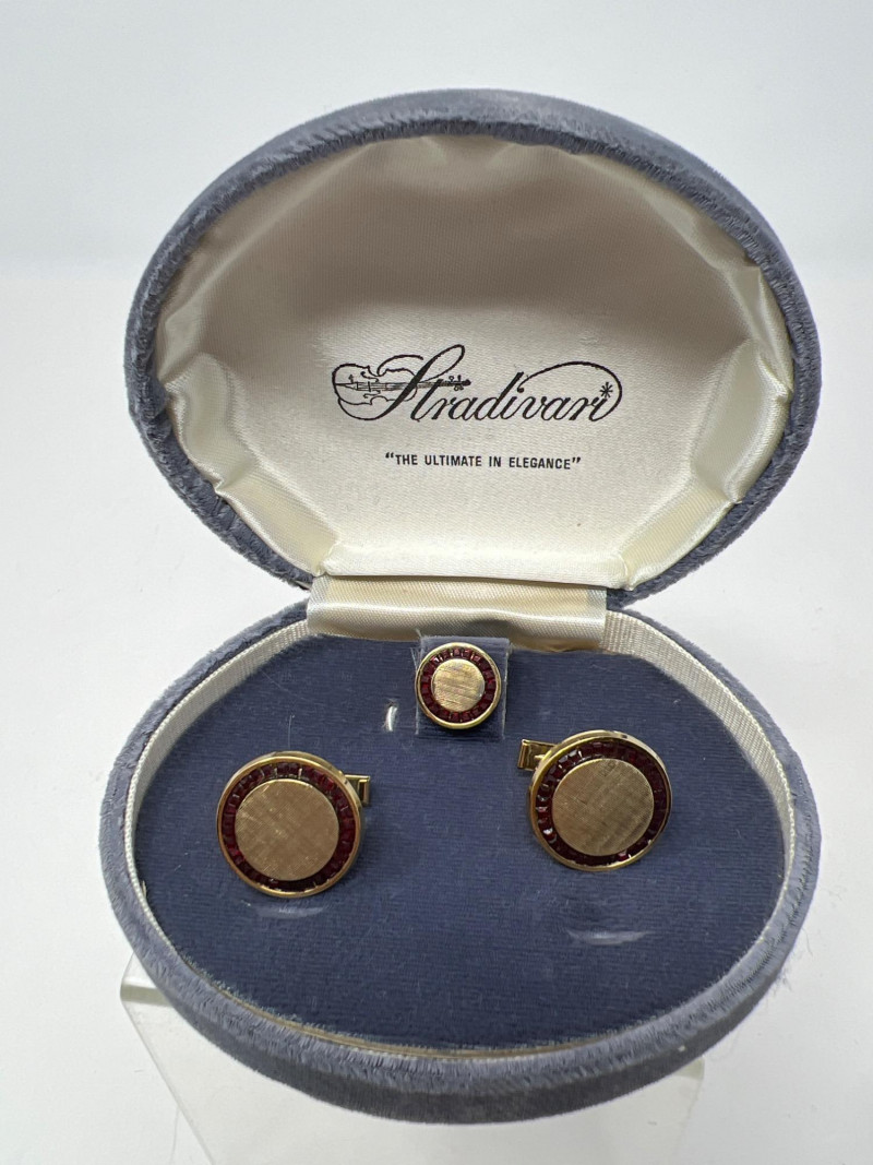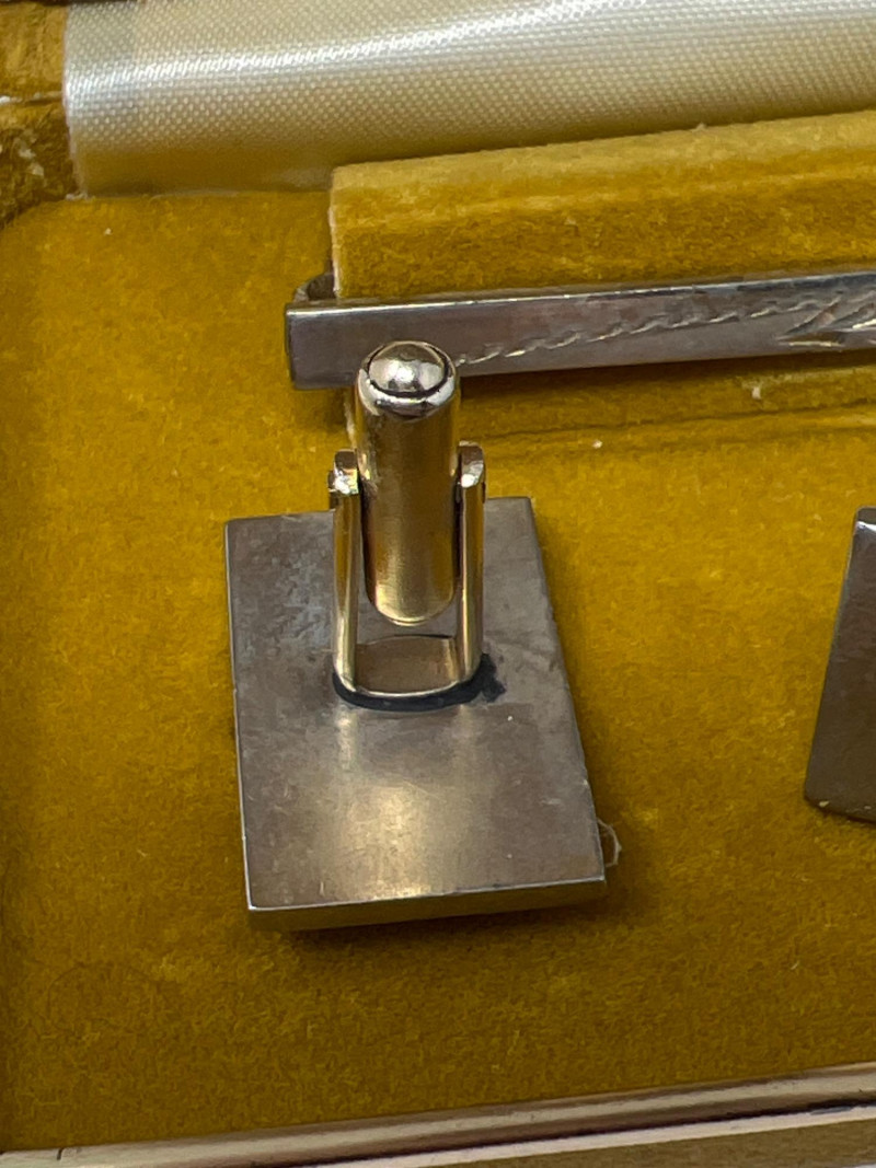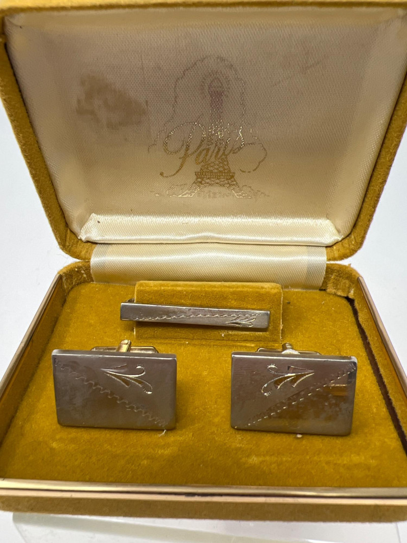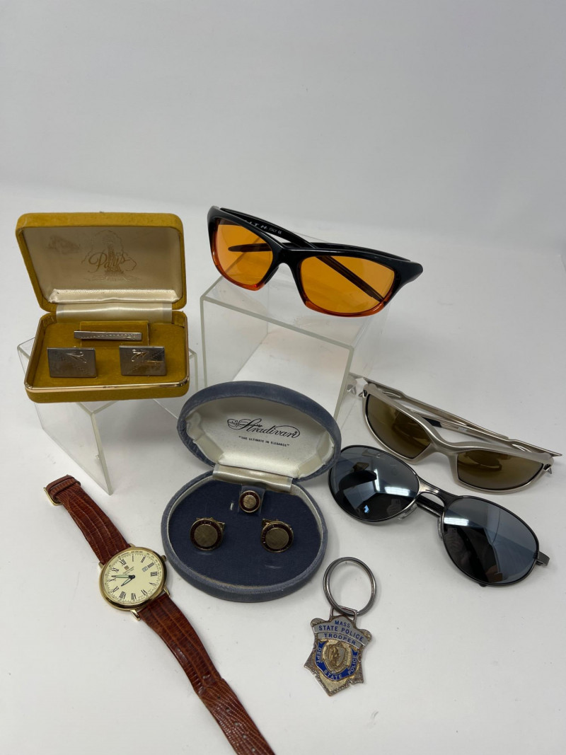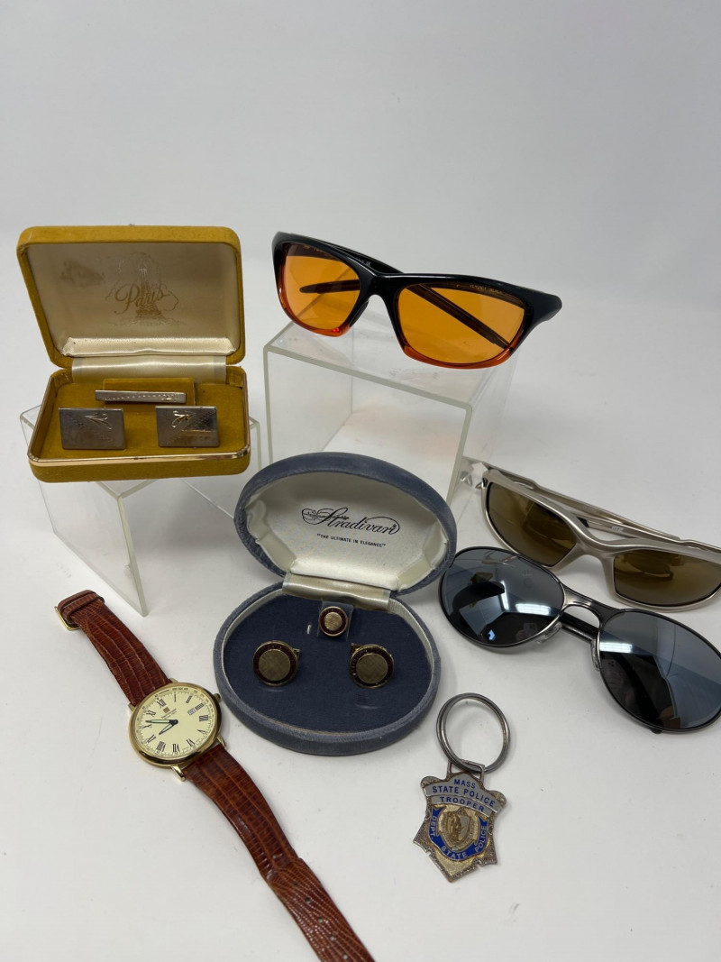 A stylish mixed lot of vintage and classic men's accessories, perfect for collectors or resellers. Includes: Steinhausen Men’s Watch – Model TW493G, Swiss Movement, 5 Jewel, 3 ATM Water Resistant. Gold-tone case, Roman numeral dial, leather band. Note: Needs servicing. Foster Grant Sunglasses – Black frame with tinted lenses, retro look. Miz Italy Sunglasses – Metallic frame with brown lenses, red star detail on the temple. Vintage Orange-Lens Sport Sunglasses – Bold and lightweight. Paris Cufflinks & Tie Clip Set – Rectangular silver-tone pieces in original velvet-lined case. Stradivari Cufflink & Stud Set – Round gold-tone with red enamel accent, in original case. Massachusetts State Police Trooper Keychain – Badge-shaped design, collectible item.