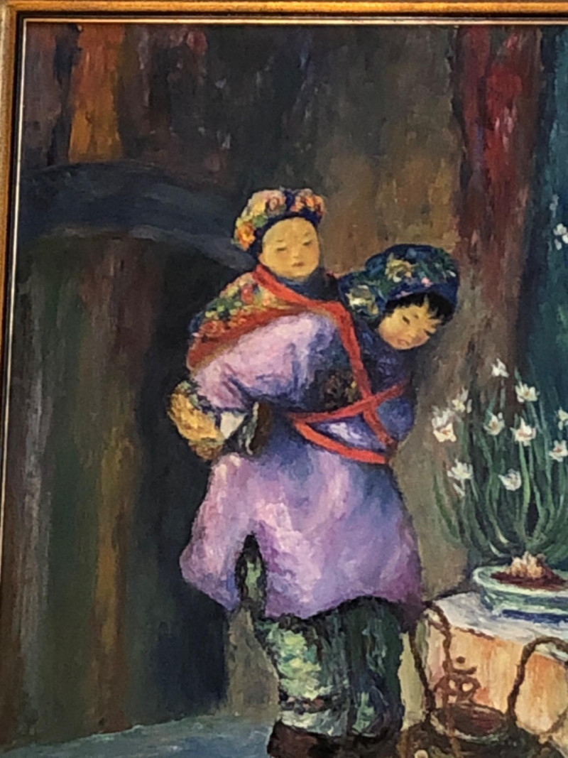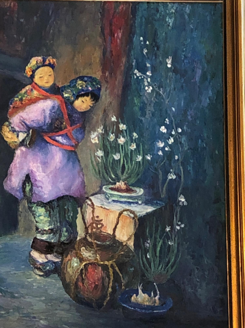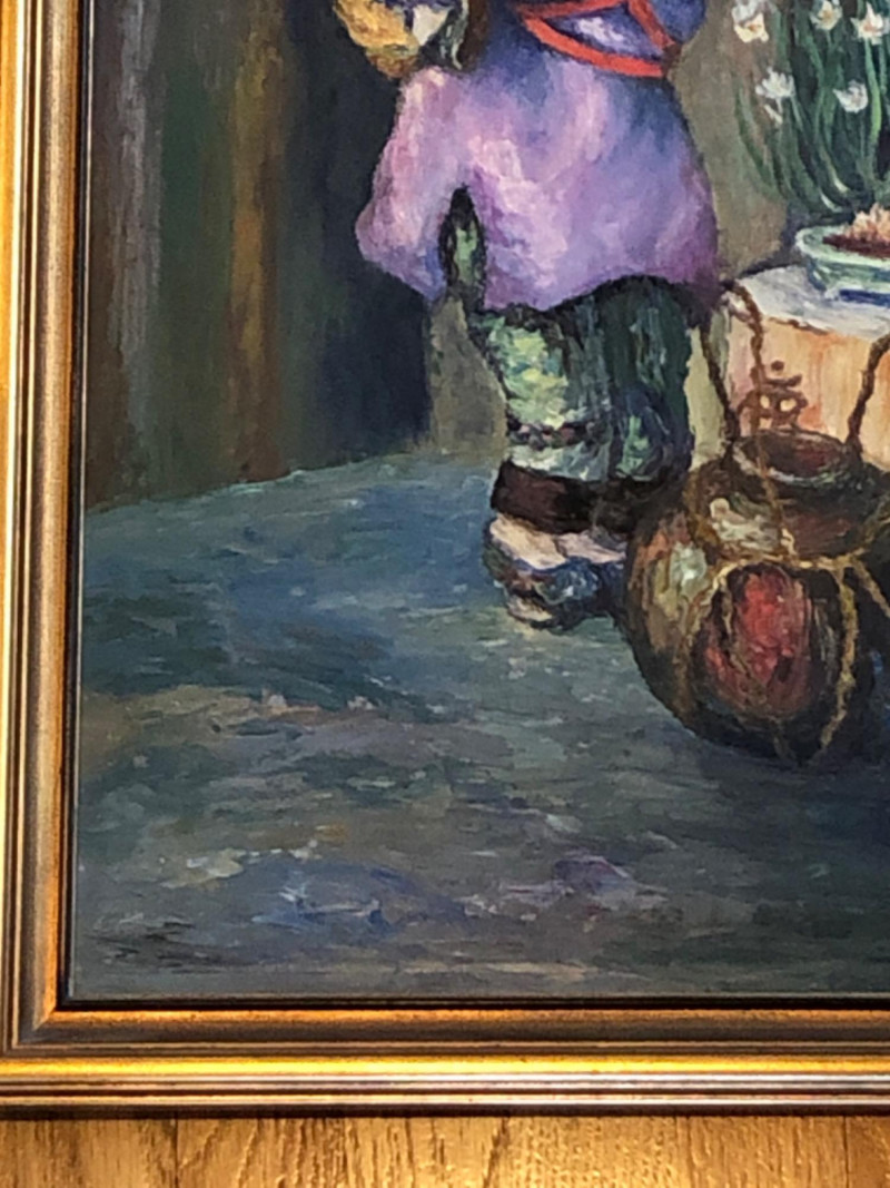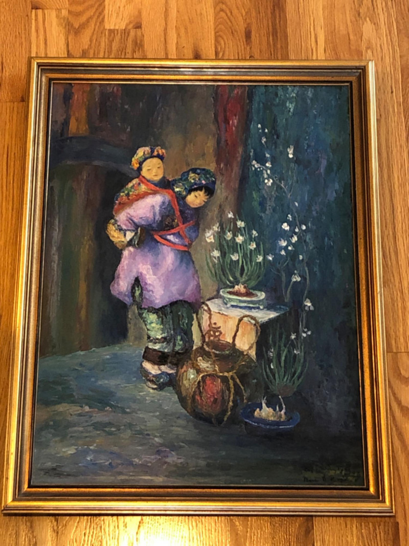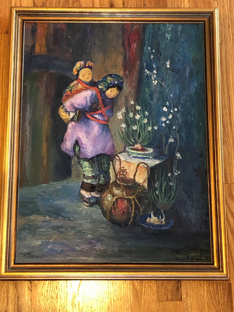 This vibrant oil painting, signed “Copy Wylay Fung by Maude D. Purple,” is a richly textured piece inspired by the work of Chinese artist Wylay Fung. Rendered in vivid hues and expressive brushwork, it depicts a woman carrying a child on her back, standing beside a rustic table with flowering plants and vessels. The painting captures a sense of everyday serenity and cultural warmth. The piece is presented in a vintage wooden frame, professionally framed by Pacific Picture Frame Co. of Seattle, as labeled on the back. The heavy texture and visible impasto technique enhance its dimensionality and hand-painted charm. Details: Medium: Oil on board Artist: Maude D. Purple (after Wylay Fung) Label: Pacific Picture Frame Co., Seattle