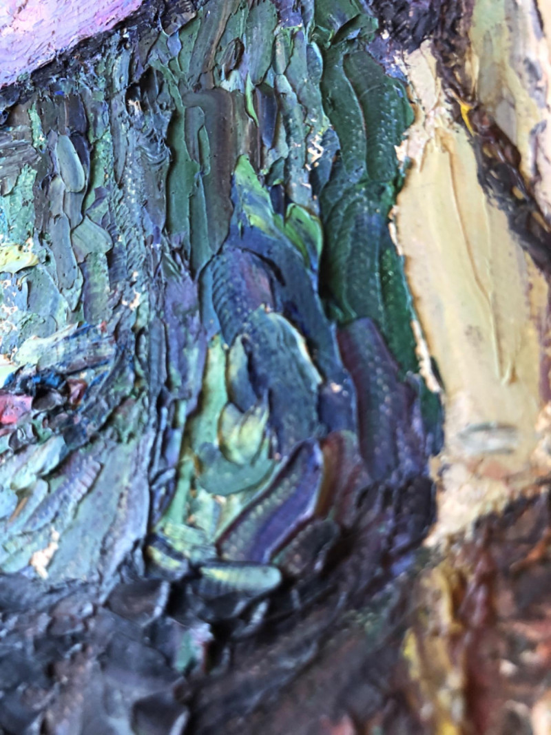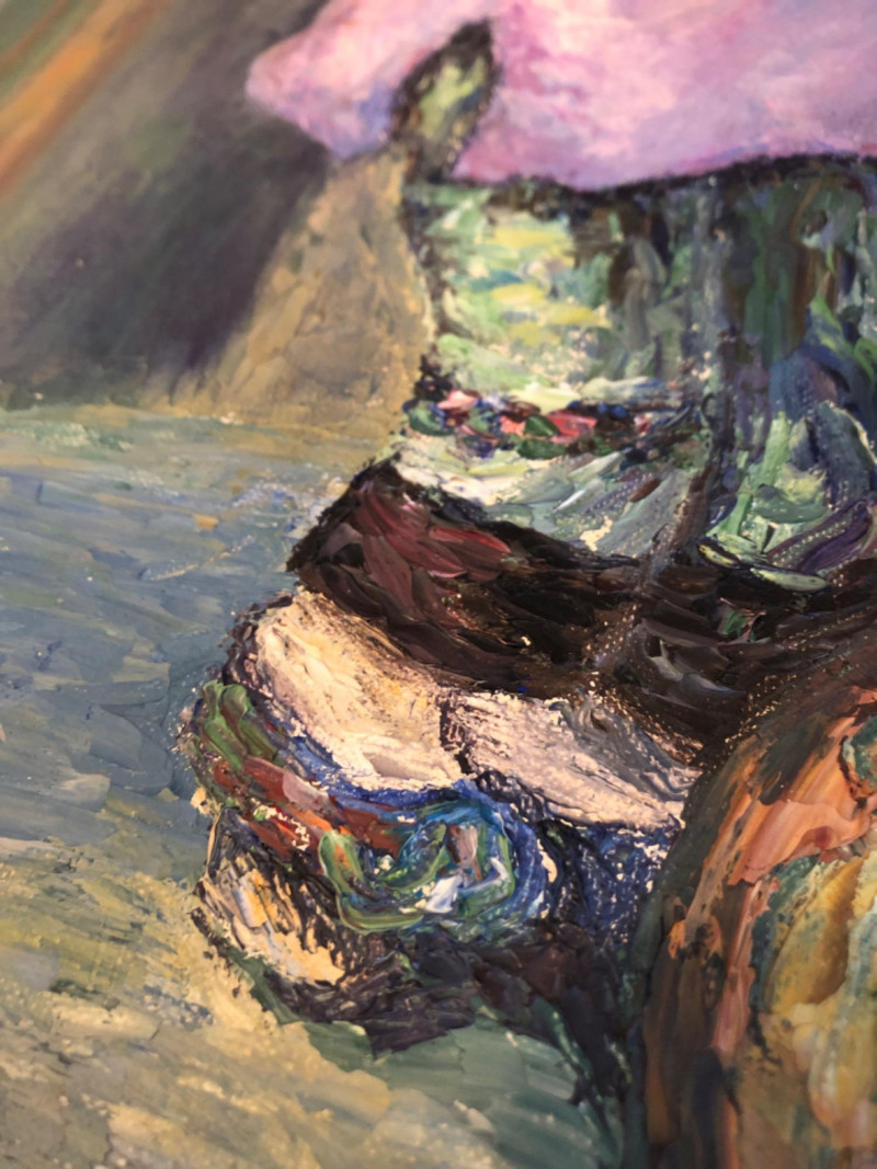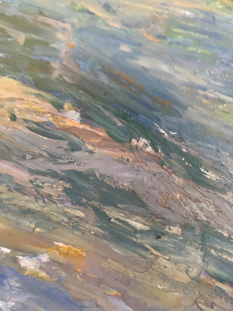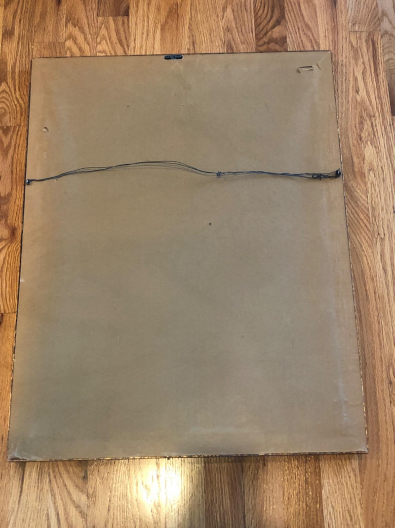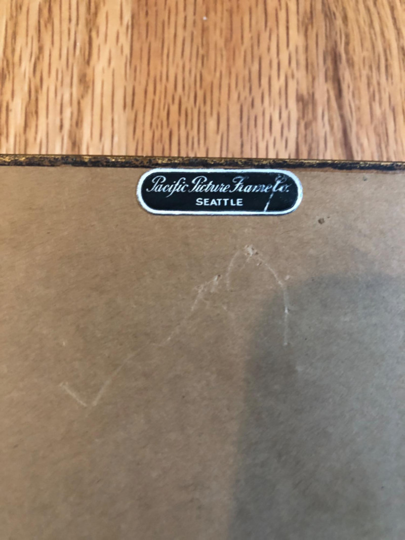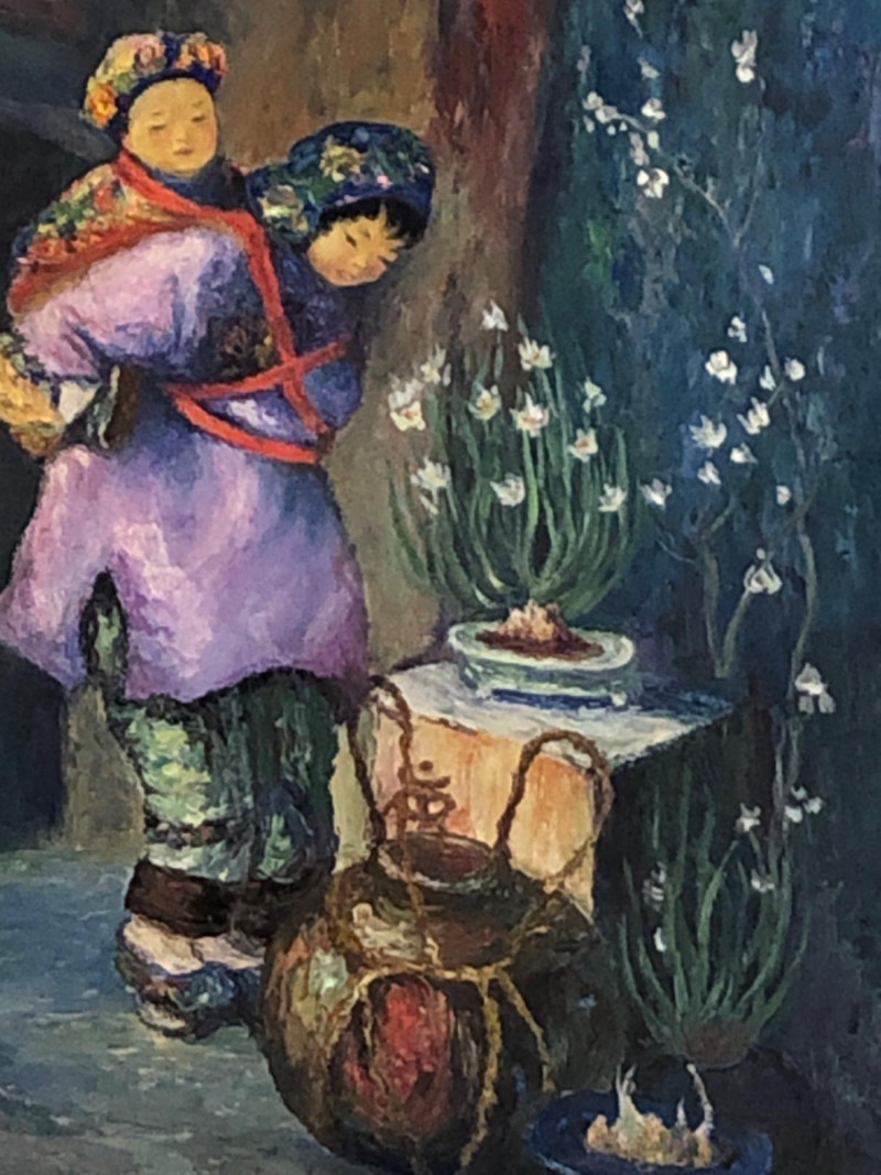 This vibrant oil painting, signed “Copy Wylay Fung by Maude D. Purple,” is a richly textured piece inspired by the work of Chinese artist Wylay Fung. Rendered in vivid hues and expressive brushwork, it depicts a woman carrying a child on her back, standing beside a rustic table with flowering plants and vessels. The painting captures a sense of everyday serenity and cultural warmth. The piece is presented in a vintage wooden frame, professionally framed by Pacific Picture Frame Co. of Seattle, as labeled on the back. The heavy texture and visible impasto technique enhance its dimensionality and hand-painted charm. Details: Medium: Oil on board Artist: Maude D. Purple (after Wylay Fung) Label: Pacific Picture Frame Co., Seattle