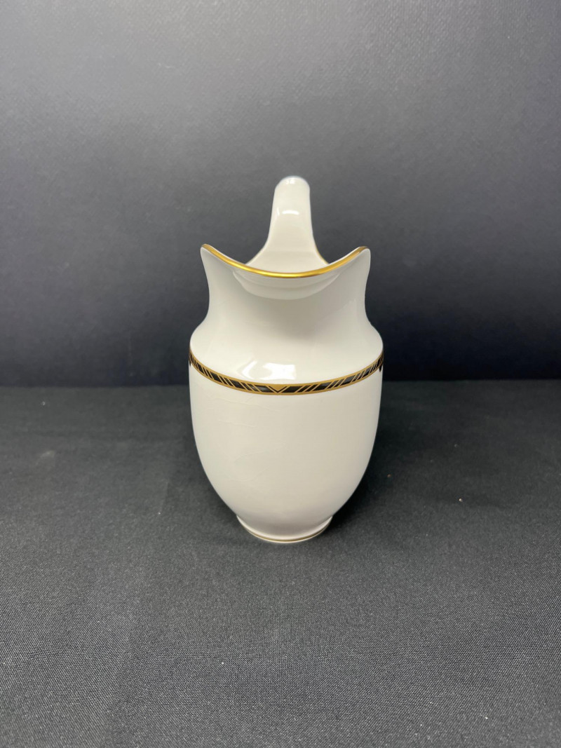 • Elegant white porcelain with gold rim and black-and-gold band detailing