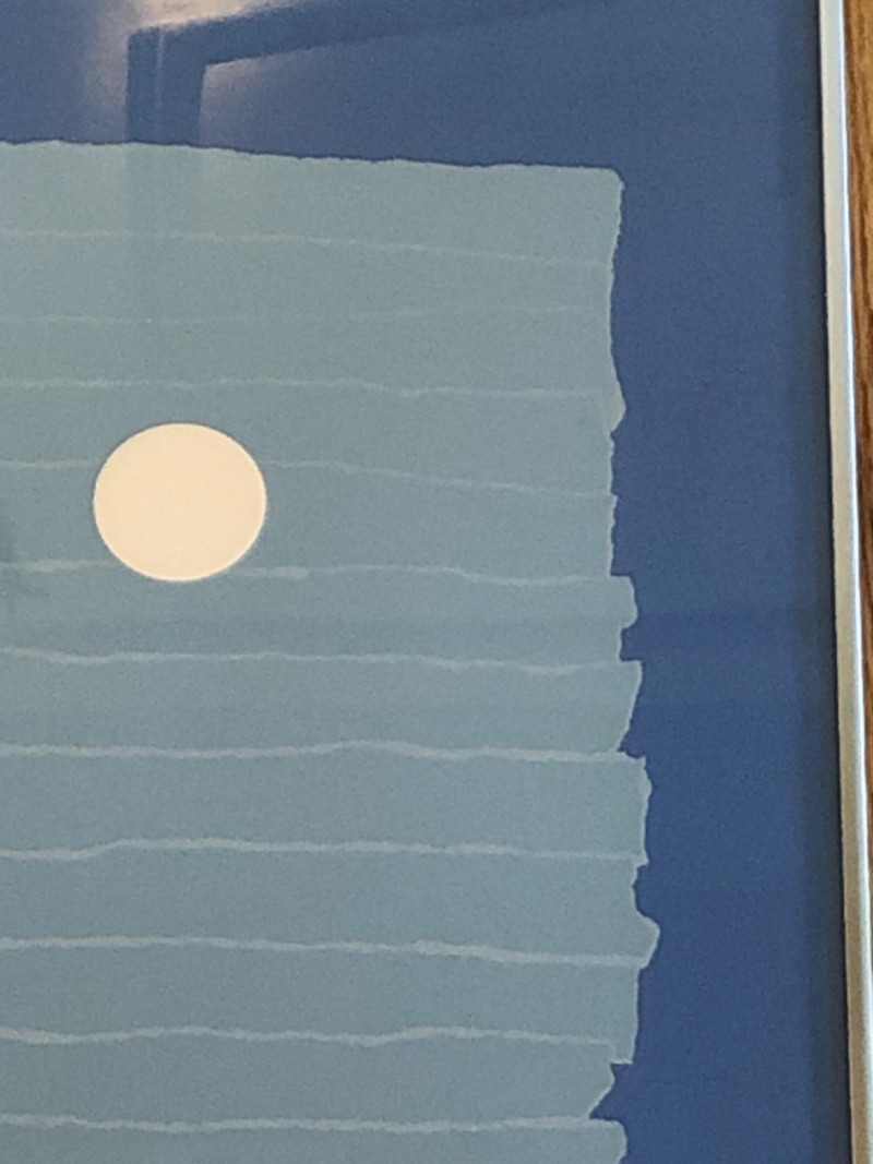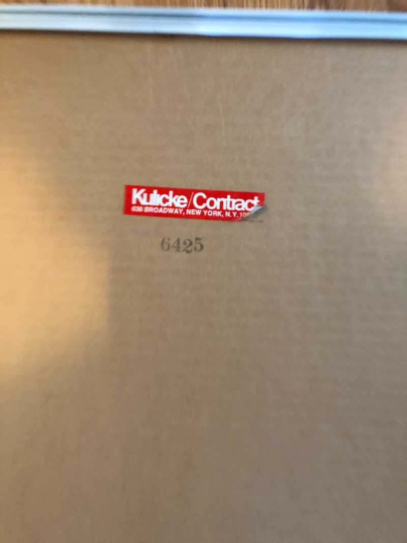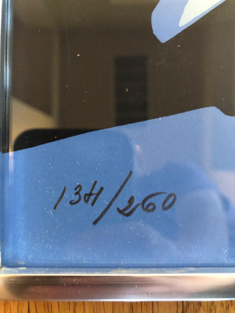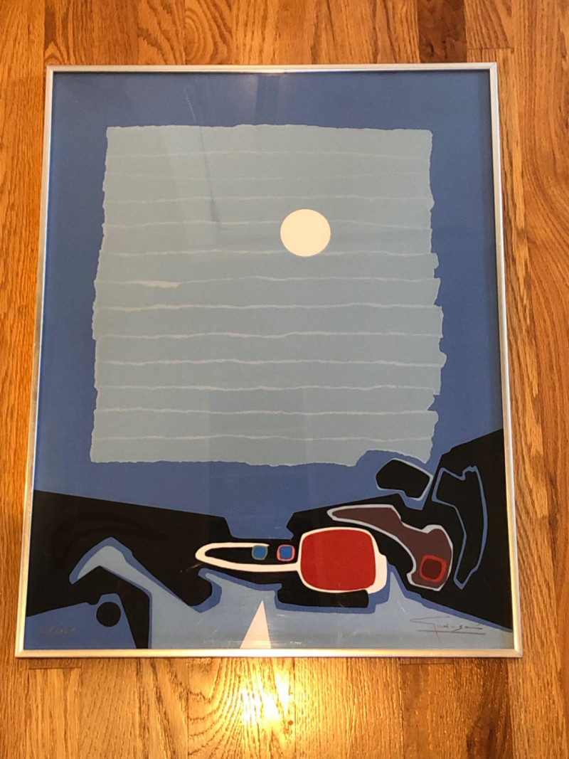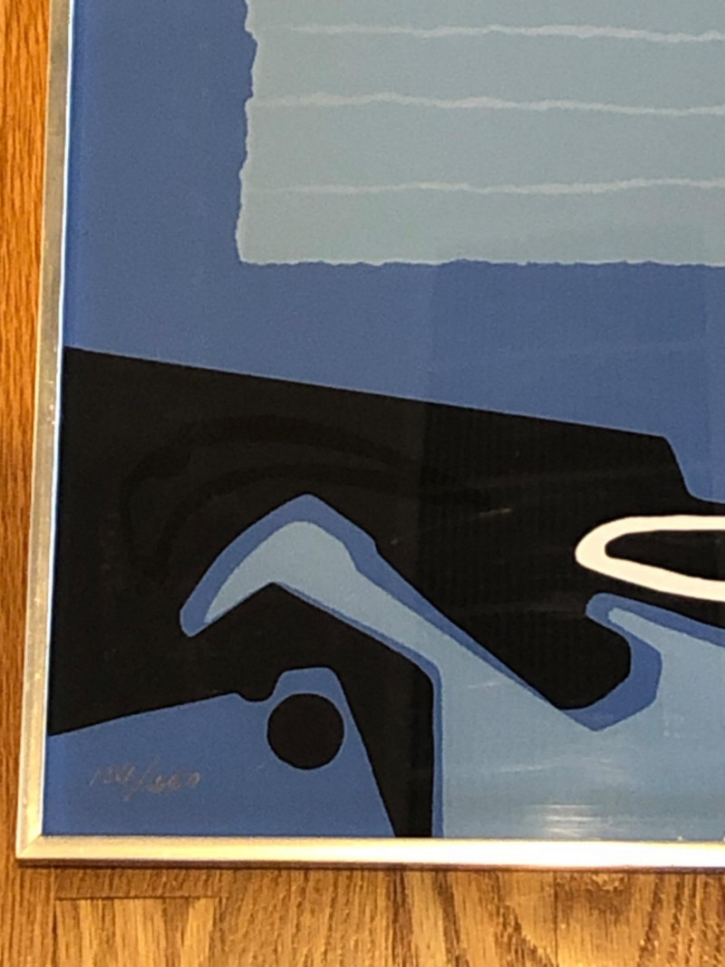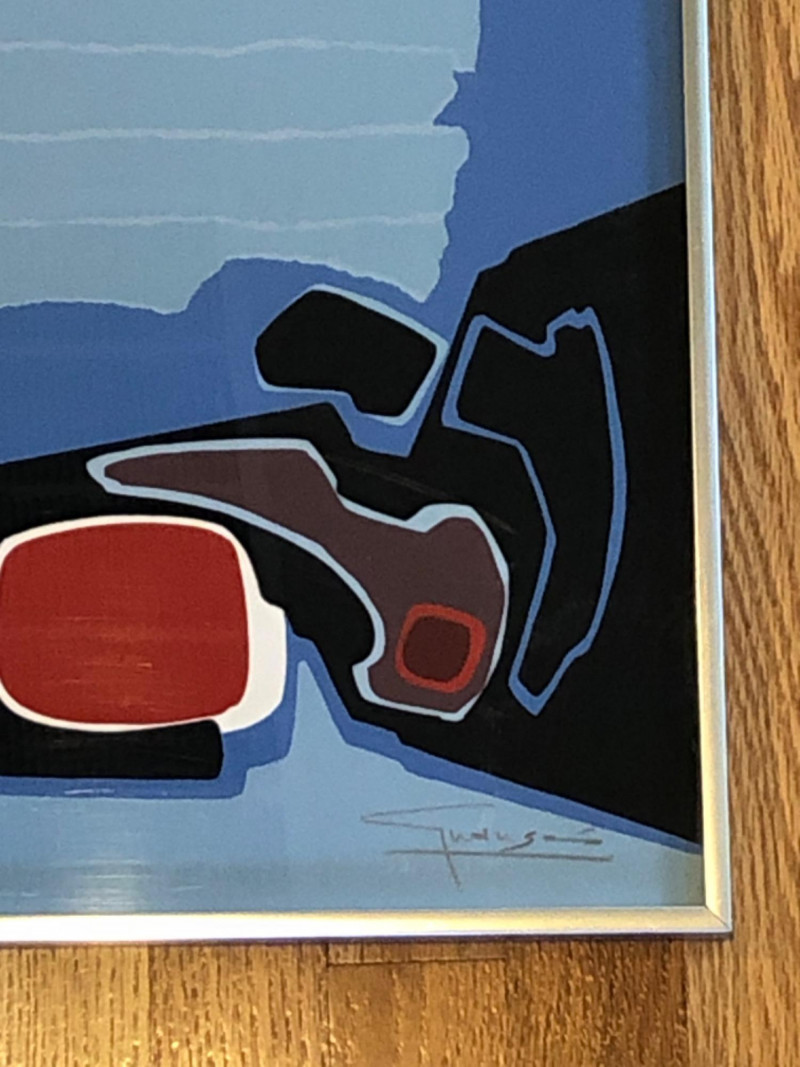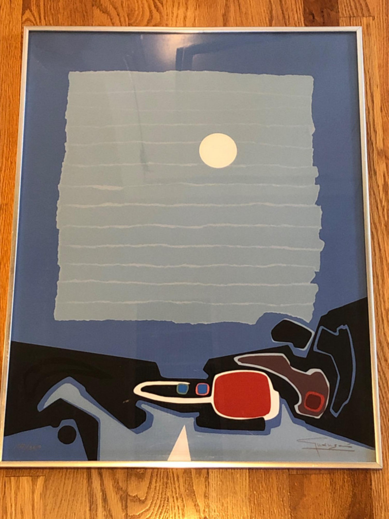 A limited-edition abstract serigraph by renowned Spanish artist Antonio Guanse, numbered 134 of 260. This striking composition features: A central glowing orb set against a layered, textured blue backdrop Bold geometric shapes in deep blues, reds, and whites A dynamic layout suggestive of a moonlit or coastal scene Details: Medium: Serigraph (Silkscreen Print) Edition: 134/260 Signature: Hand-signed by the artist (lower right) Framing: Professionally framed under glass Framing Label: Kulicke/Contract+, 636 Broadway, New York (Back label no. 6425)