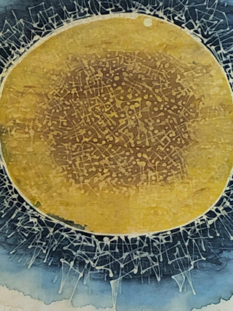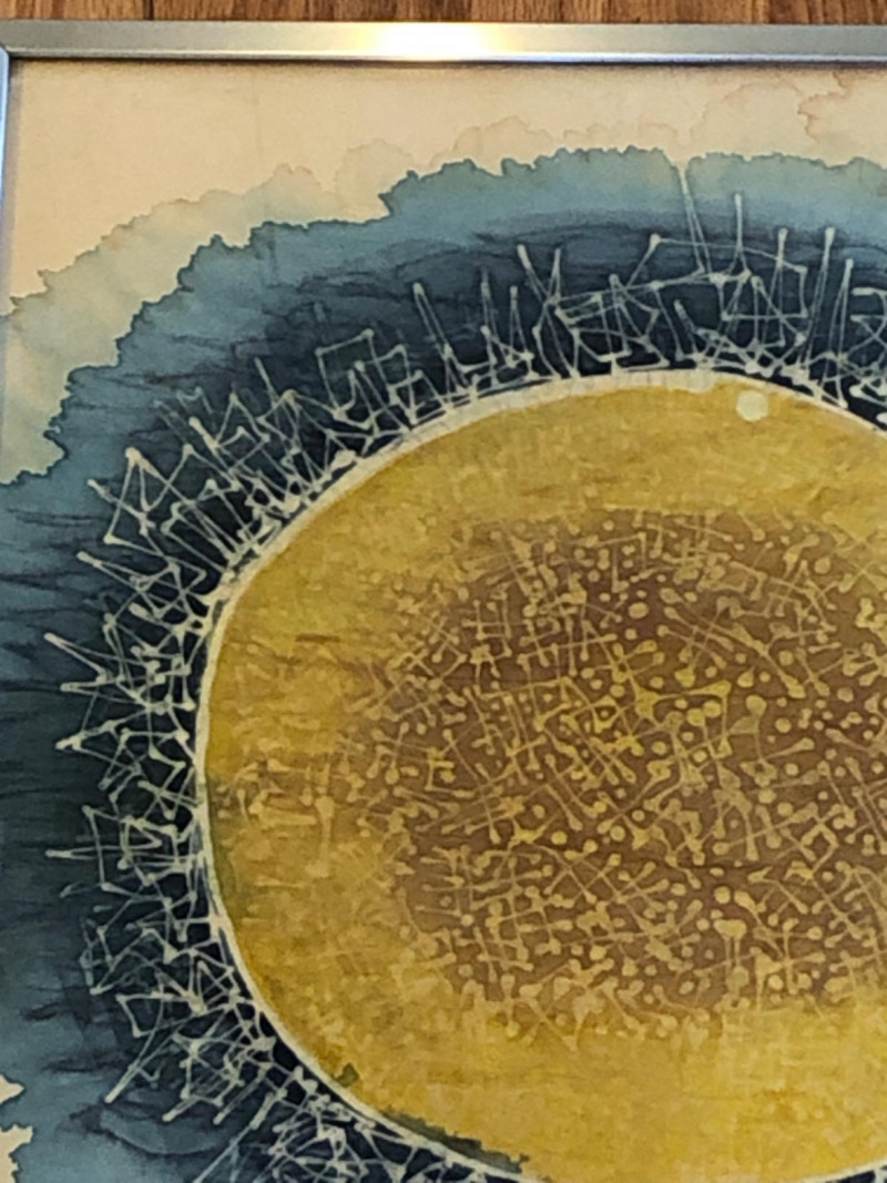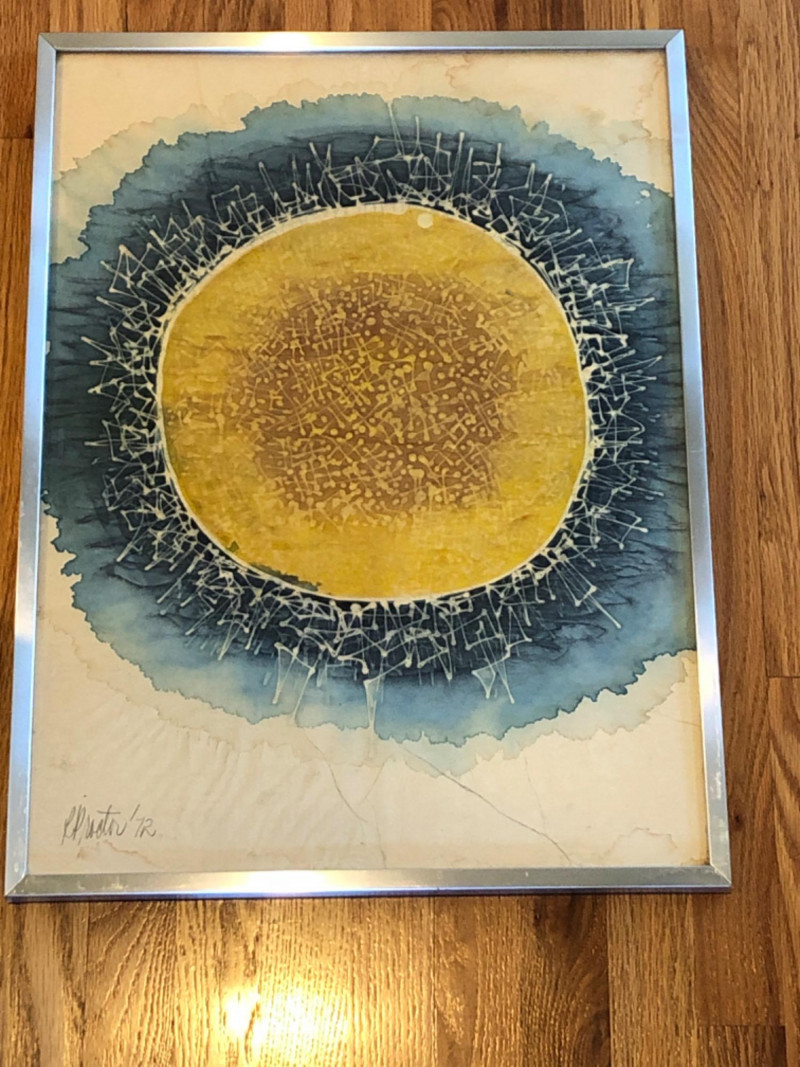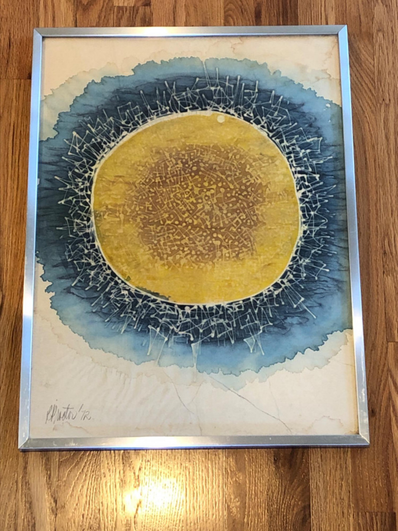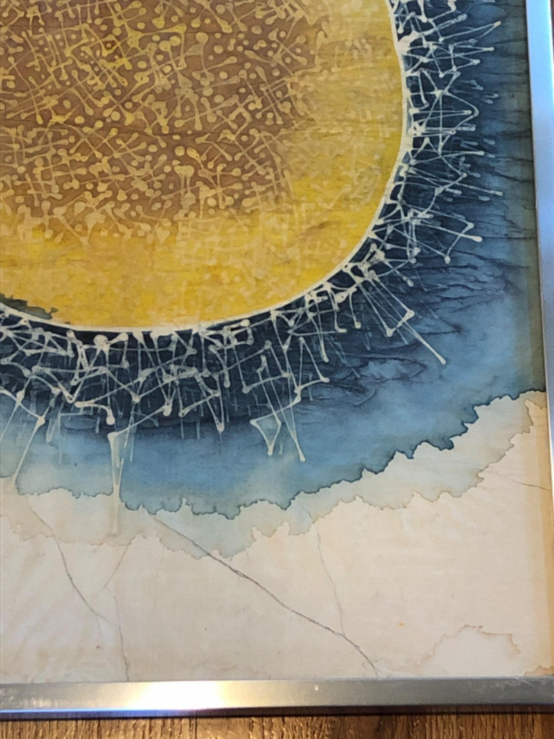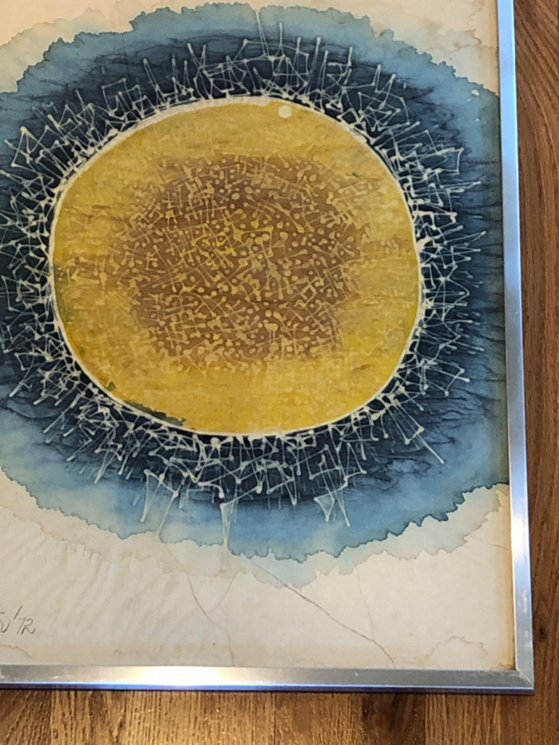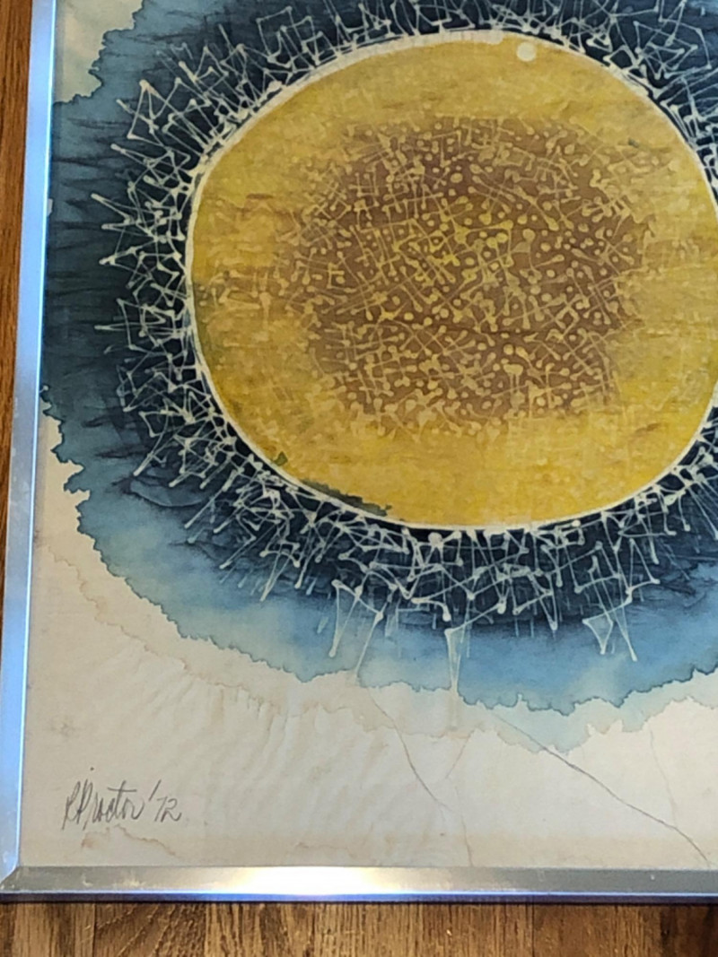A vibrant and bold original watercolor artwork featuring a central golden orb encircled by deep blue washes and intricate white linear detailing. The abstract composition evokes a sense of energy and movement, typical of 1970s modernist styles. The artwork bears visible signs of age, including staining and foxing, which enhance its vintage authenticity and character. Artist: Proctor Provenance: Custom framed at Eastlake Galleries, Seattle, Washington.