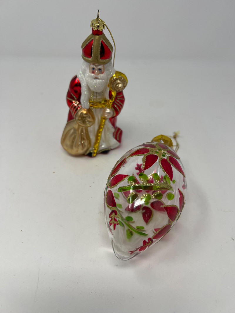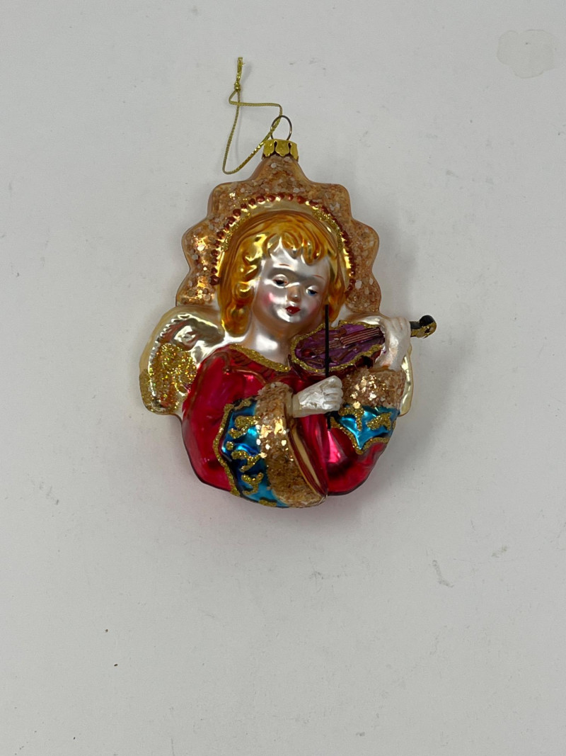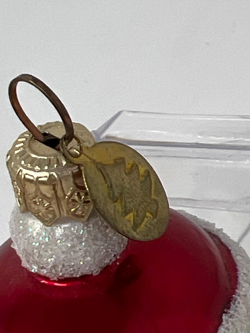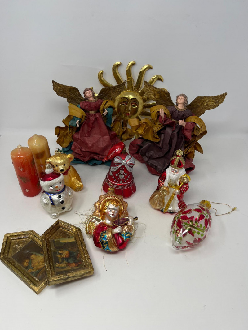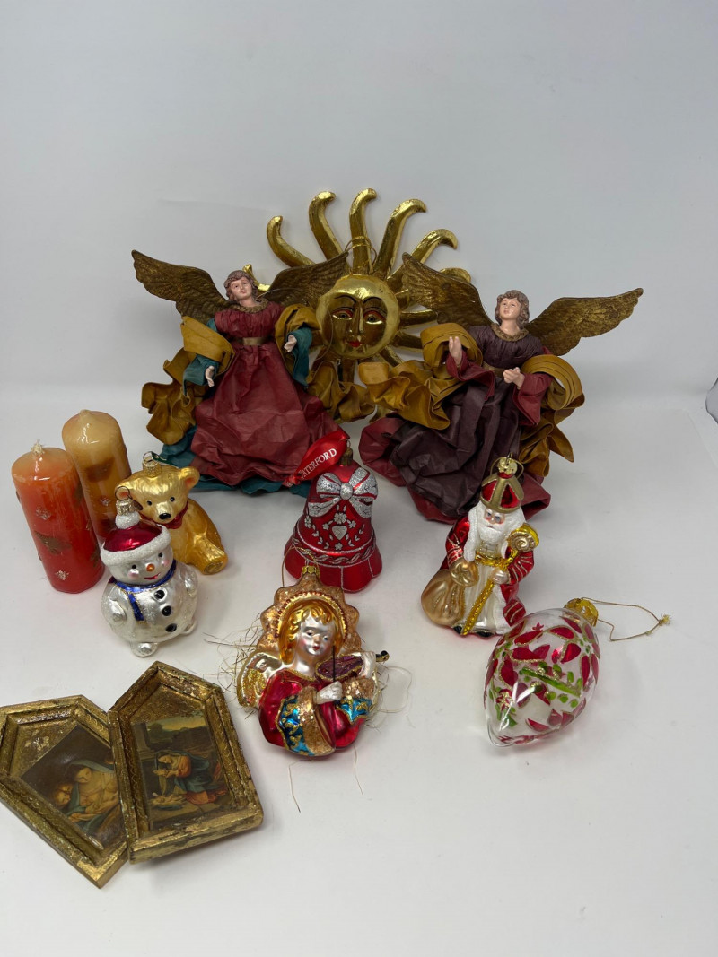Charming set of vintage Christmas and holiday décor featuring a red Waterford glass bell ornament, hand-painted and detailed with a silver bow and heart motif. The collection includes: Two 5.5" tall papier mache angels with sculpted heads and gold wings (Cartapesta?) Gilded sun face ornament - 7" round Two "Made in West Germany" holiday candles (sealed) 4" tall Hand-painted glass ornaments: teddy bear, snowman, violin-playing angel, Santa figure, and egg-shaped floral ornament Religious triptych with traditional imagery Assorted vintage-style baubles and figurines