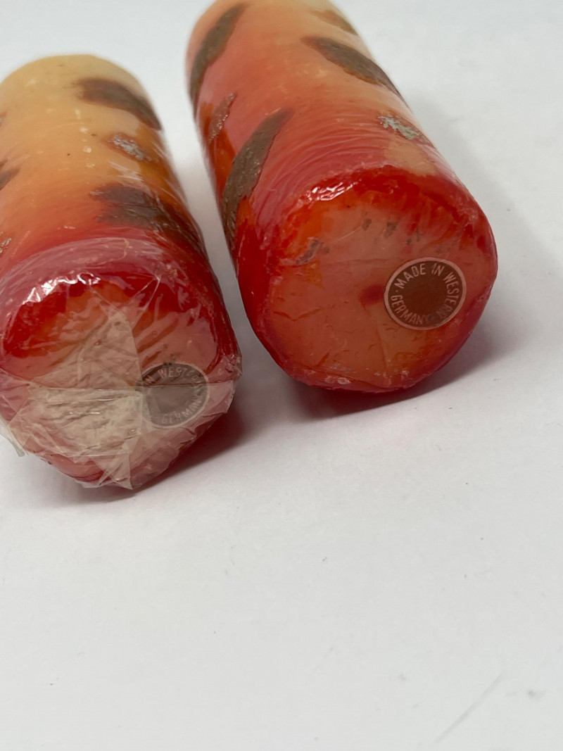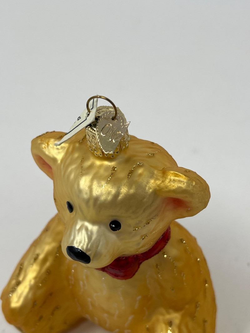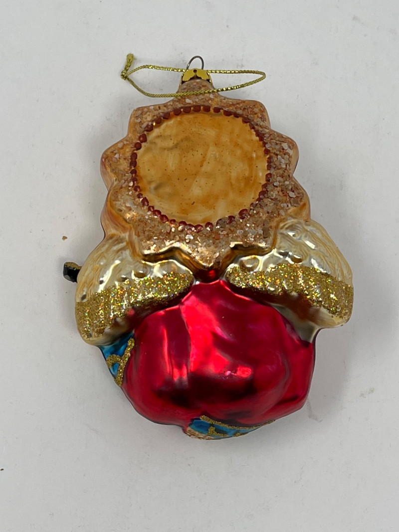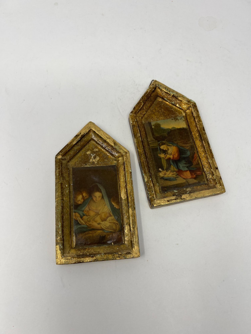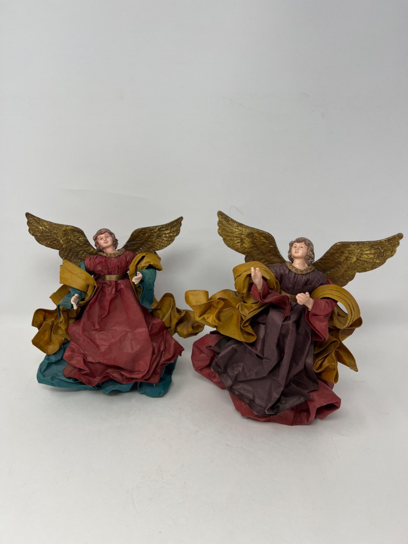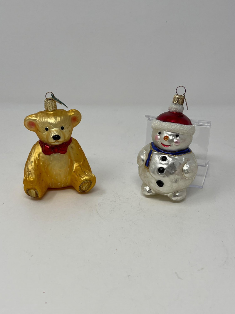 Charming set of vintage Christmas and holiday décor featuring a red Waterford glass bell ornament, hand-painted and detailed with a silver bow and heart motif. The collection includes: Two 5.5" tall papier mache angels with sculpted heads and gold wings (Cartapesta?) Gilded sun face ornament - 7" round Two "Made in West Germany" holiday candles (sealed) 4" tall Hand-painted glass ornaments: teddy bear, snowman, violin-playing angel, Santa figure, and egg-shaped floral ornament Religious triptych with traditional imagery Assorted vintage-style baubles and figurines