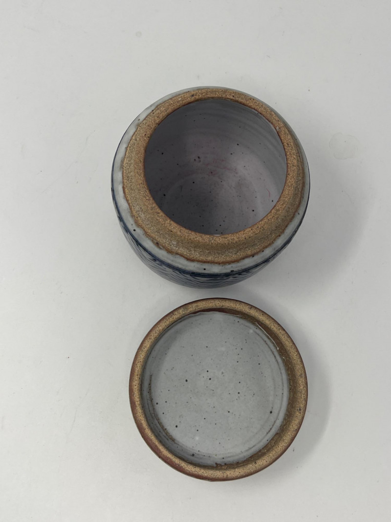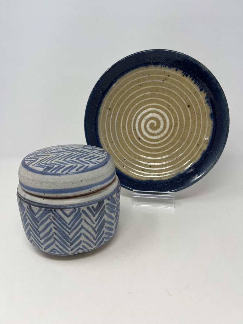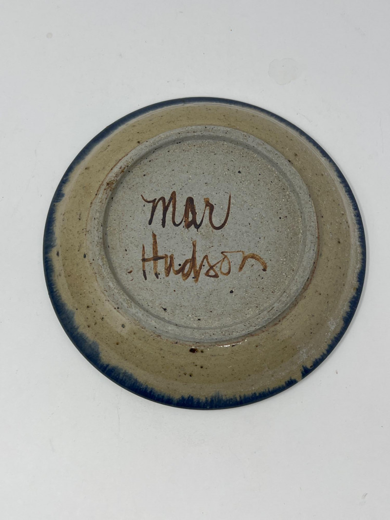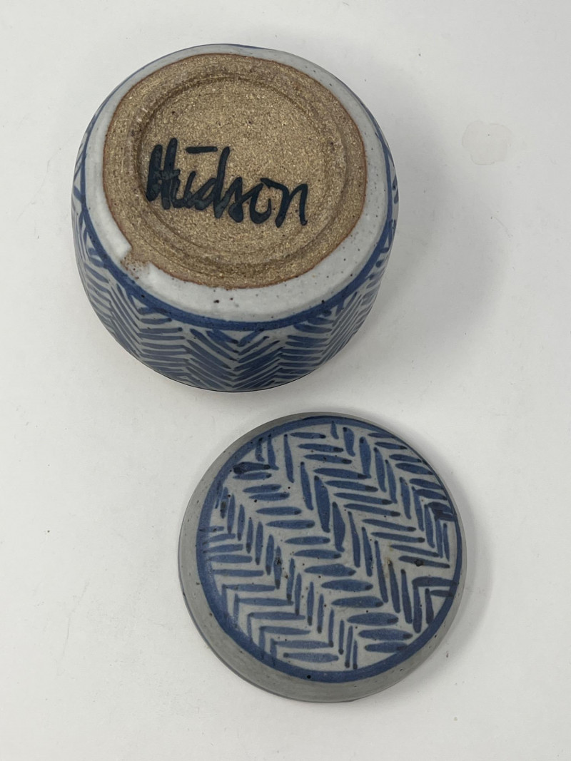 Mar Hudson is a Northwest studio potter known for her handcrafted ceramics, particularly stoneware and glazed pottery. She was active in Seattle, Washington, and her work includes pieces such as lidded jars and sculptural plaques. One of her notable works, a lidded jar from 1960–66, is part of the Art Institute of Chicago’s collection. Her pottery often features organic forms, textured surfaces, and earthy tones, reflecting the Arts and Crafts movement influences. In this lot are two of her artisan pieces:
