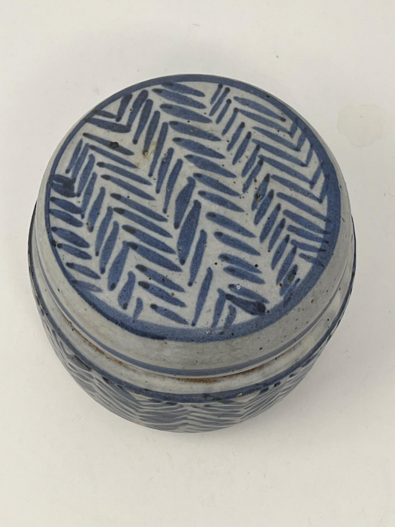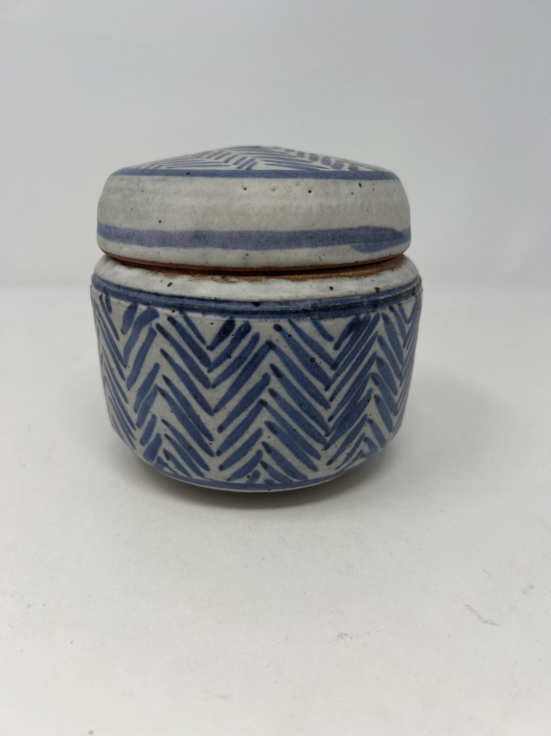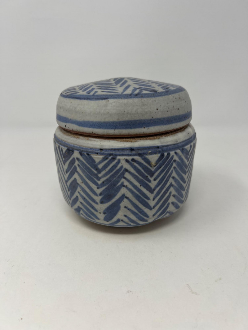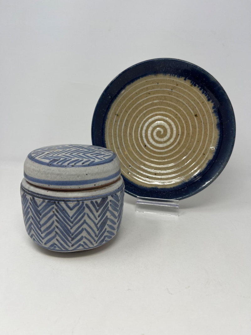 Mar Hudson is a Northwest studio potter known for her handcrafted ceramics, particularly stoneware and glazed pottery. She was active in Seattle, Washington, and her work includes pieces such as lidded jars and sculptural plaques. One of her notable works, a lidded jar from 1960–66, is part of the Art Institute of Chicago’s collection. Her pottery often features organic forms, textured surfaces, and earthy tones, reflecting the Arts and Crafts movement influences. In this lot are two of her artisan pieces: