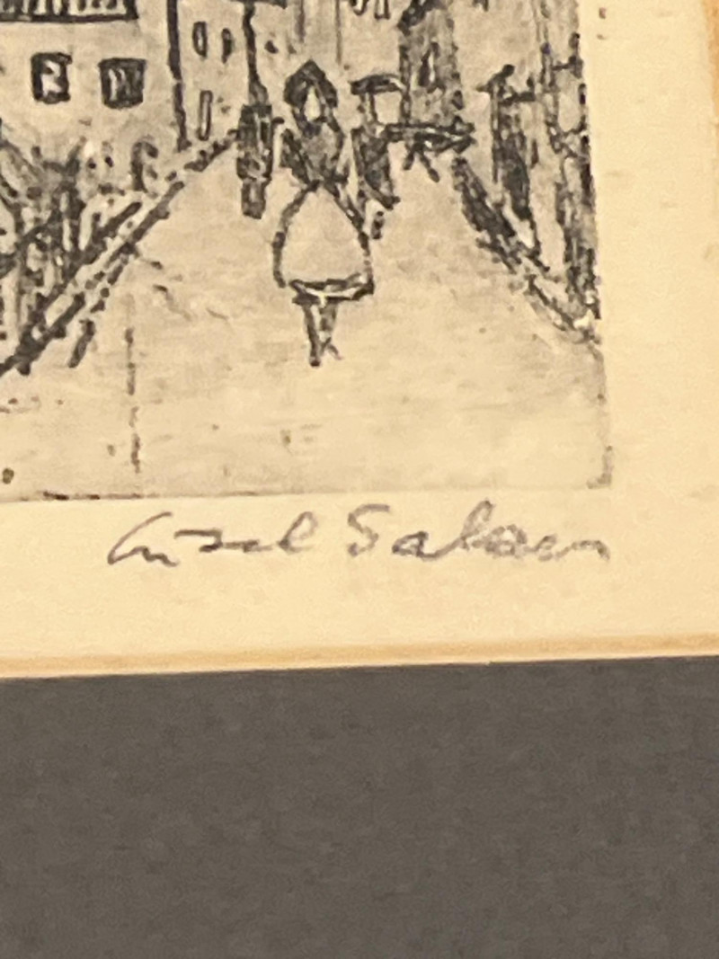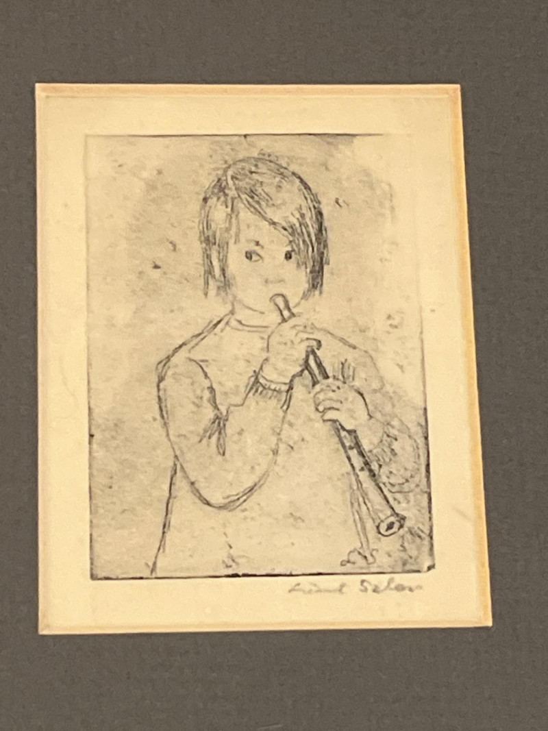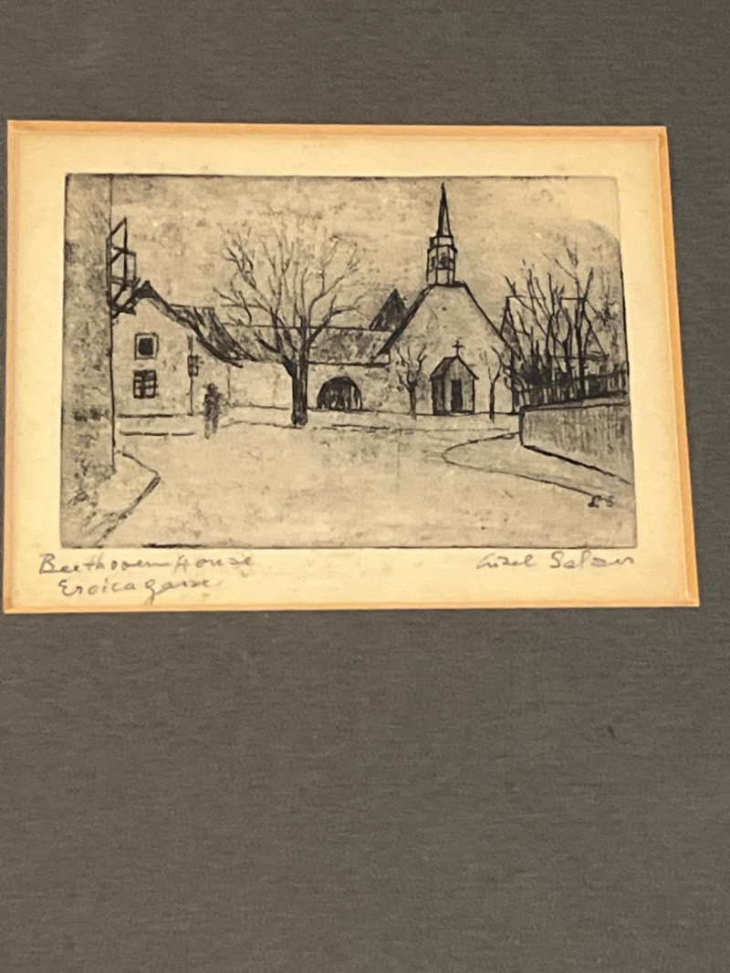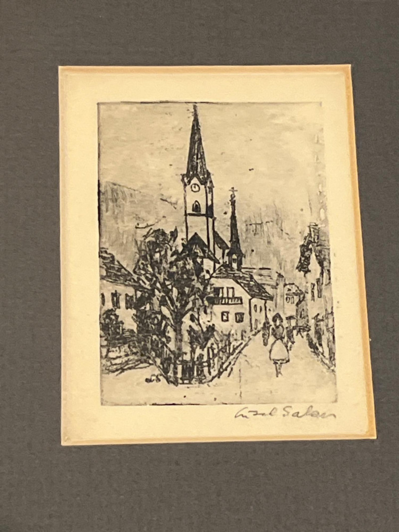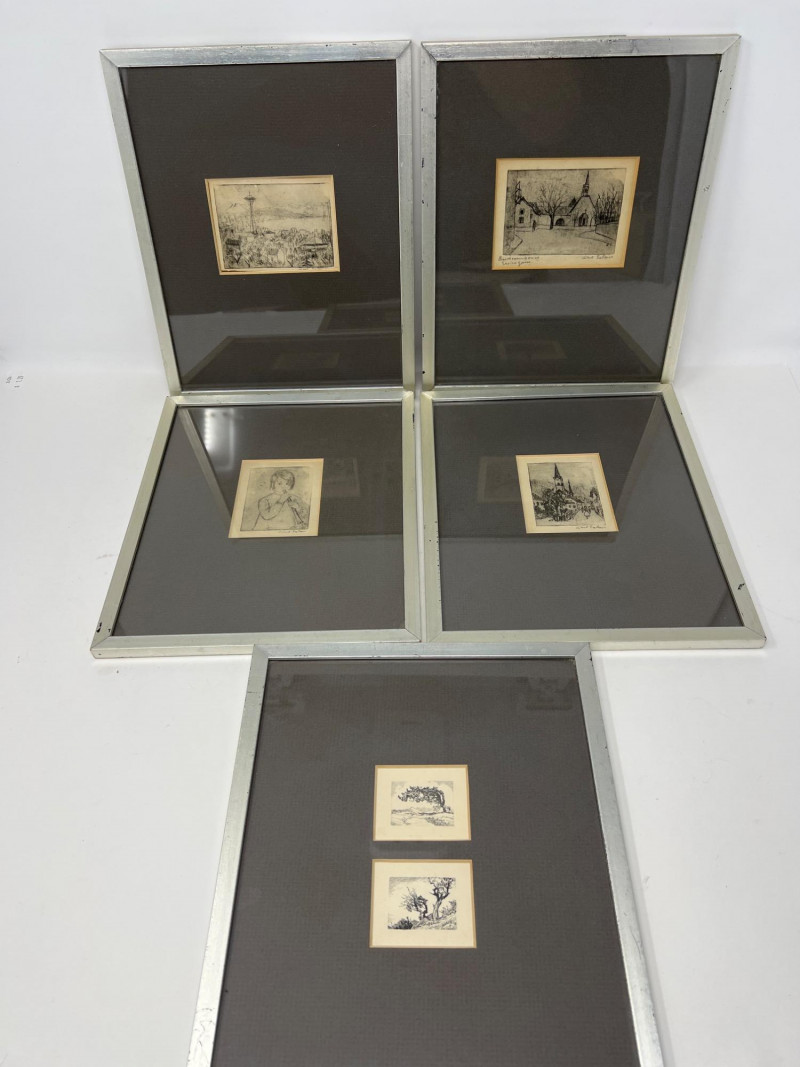 A charming and diverse collection of miniature etchings displayed across five matching frames, each showcasing finely rendered line work and an expressive, understated style. The subjects include both European and American scenes, as well as portrait and landscape studies by Artist Lisel Salzer. Included Subjects: Seattle skyline with the iconic Space Needle. Beethoven House – Eroica Grave, handwritten on one print. A European village street with central church spire. A young child playing a recorder, rendered in soft detail. Two evocative windswept tree landscapes (no visible signature - may be an artist other than Salzer). . Key Details: Each etching is signed in pencil or ink - Lisel Salzer (note artist information below) - Austrian-born Seattle resident. Likely produced in the mid-20th century, based on style and materials. Etchings are framed under glass in sleek silver-tone metal frames with wide black matting. Lisel Salzer (1906–2005) was an Austrian-born painter and enamelist of Jewish heritage who fled Nazi persecution in 1939 and resettled in the United States. She was a highly skilled artist, trained at the Vienna Art Academy, and exhibited alongside renowned figures such as Gustav Klimt and Egon Schiele at the prestigious Würthle Gallery in Vienna.After moving to New York, Salzer continued her artistic career, painting portraits and landscapes. In 1945, she became fascinated with Limoges enamel techniques and taught herself the intricate process, eventually mastering the grisaille method. Her enamel works gained recognition, and she exhibited widely, including at the Syracuse Ceramic National and the Museum of Contemporary Crafts.In 1950, Salzer relocated to Seattle, where she became a prominent portrait artist and enamelist. Her work was showcased at the Otto Seligman Gallery and the Frye Art Museum, and she painted notable figures such as James Washington Jr. and George Tsutakawa. At the age of 96, she was honored with a solo museum exhibition in Austria and awarded the Cross of Merit in Gold by the Austrian province of Salzburg.