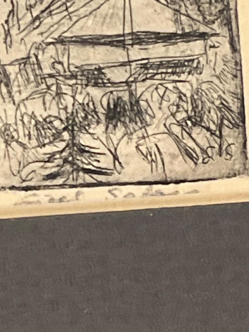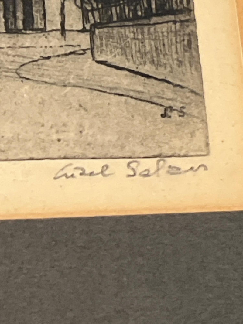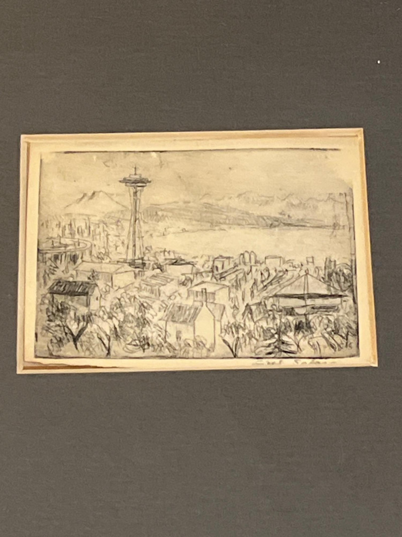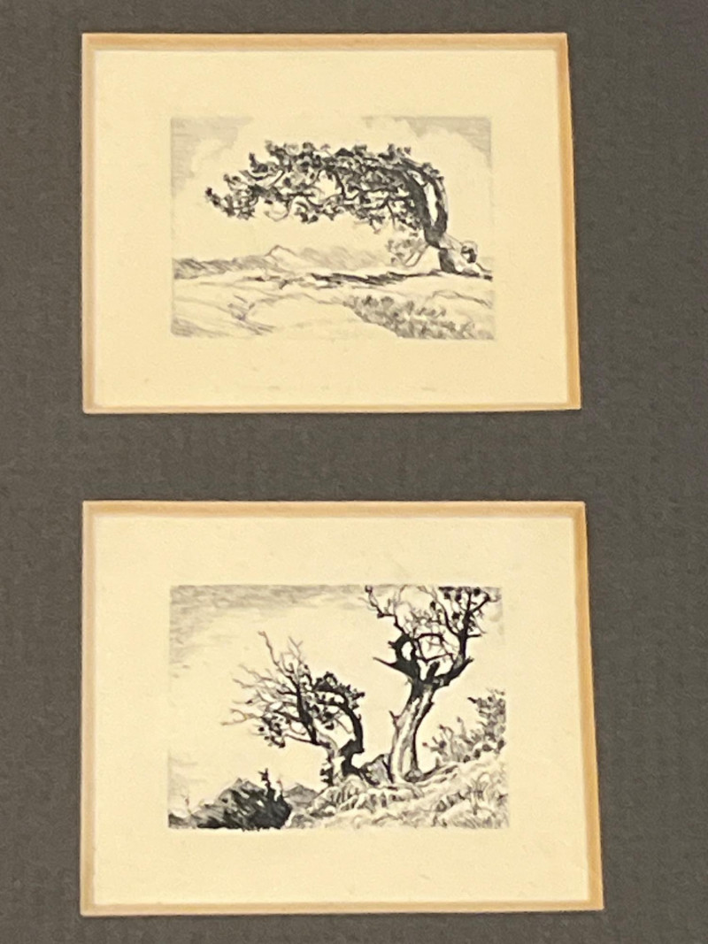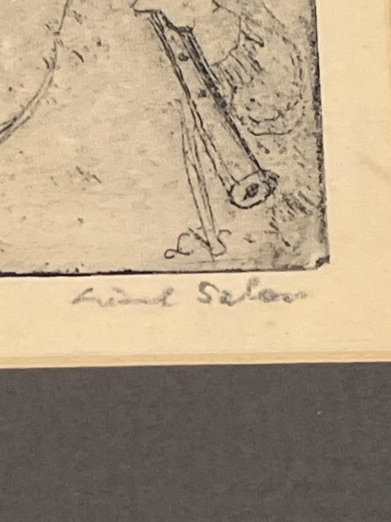 A charming and diverse collection of miniature etchings displayed across five matching frames, each showcasing finely rendered line work and an expressive, understated style. The subjects include both European and American scenes, as well as portrait and landscape studies by Artist Lisel Salzer. Included Subjects: Seattle skyline with the iconic Space Needle. Beethoven House – Eroica Grave, handwritten on one print. A European village street with central church spire. A young child playing a recorder, rendered in soft detail. Two evocative windswept tree landscapes (no visible signature - may be an artist other than Salzer). . Key Details: Each etching is signed in pencil or ink - Lisel Salzer (note artist information below) - Austrian-born Seattle resident. Likely produced in the mid-20th century, based on style and materials. Etchings are framed under glass in sleek silver-tone metal frames with wide black matting. Lisel Salzer (1906–2005) was an Austrian-born painter and enamelist of Jewish heritage who fled Nazi persecution in 1939 and resettled in the United States. She was a highly skilled artist, trained at the Vienna Art Academy, and exhibited alongside renowned figures such as Gustav Klimt and Egon Schiele at the prestigious Würthle Gallery in Vienna.After moving to New York, Salzer continued her artistic career, painting portraits and landscapes. In 1945, she became fascinated with Limoges enamel techniques and taught herself the intricate process, eventually mastering the grisaille method. Her enamel works gained recognition, and she exhibited widely, including at the Syracuse Ceramic National and the Museum of Contemporary Crafts.In 1950, Salzer relocated to Seattle, where she became a prominent portrait artist and enamelist. Her work was showcased at the Otto Seligman Gallery and the Frye Art Museum, and she painted notable figures such as James Washington Jr. and George Tsutakawa. At the age of 96, she was honored with a solo museum exhibition in Austria and awarded the Cross of Merit in Gold by the Austrian province of Salzburg.