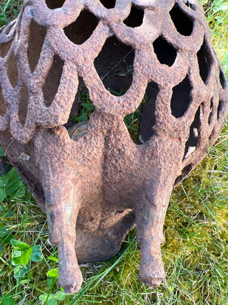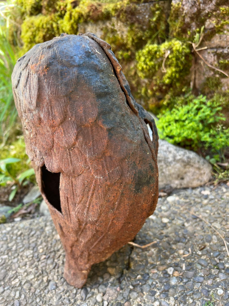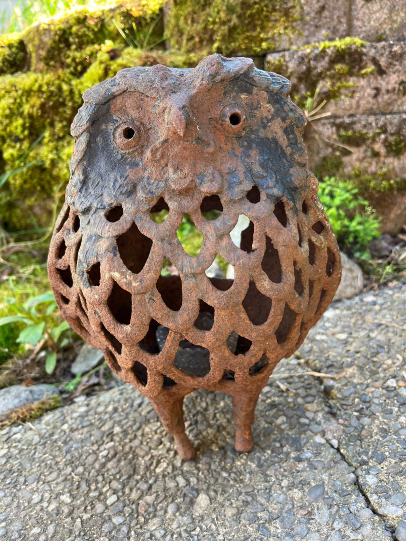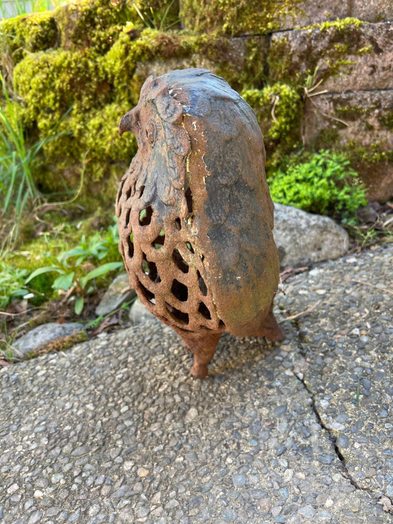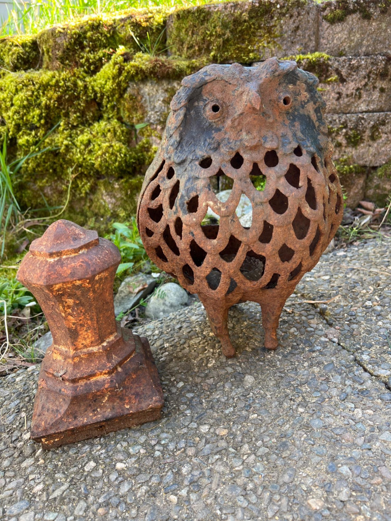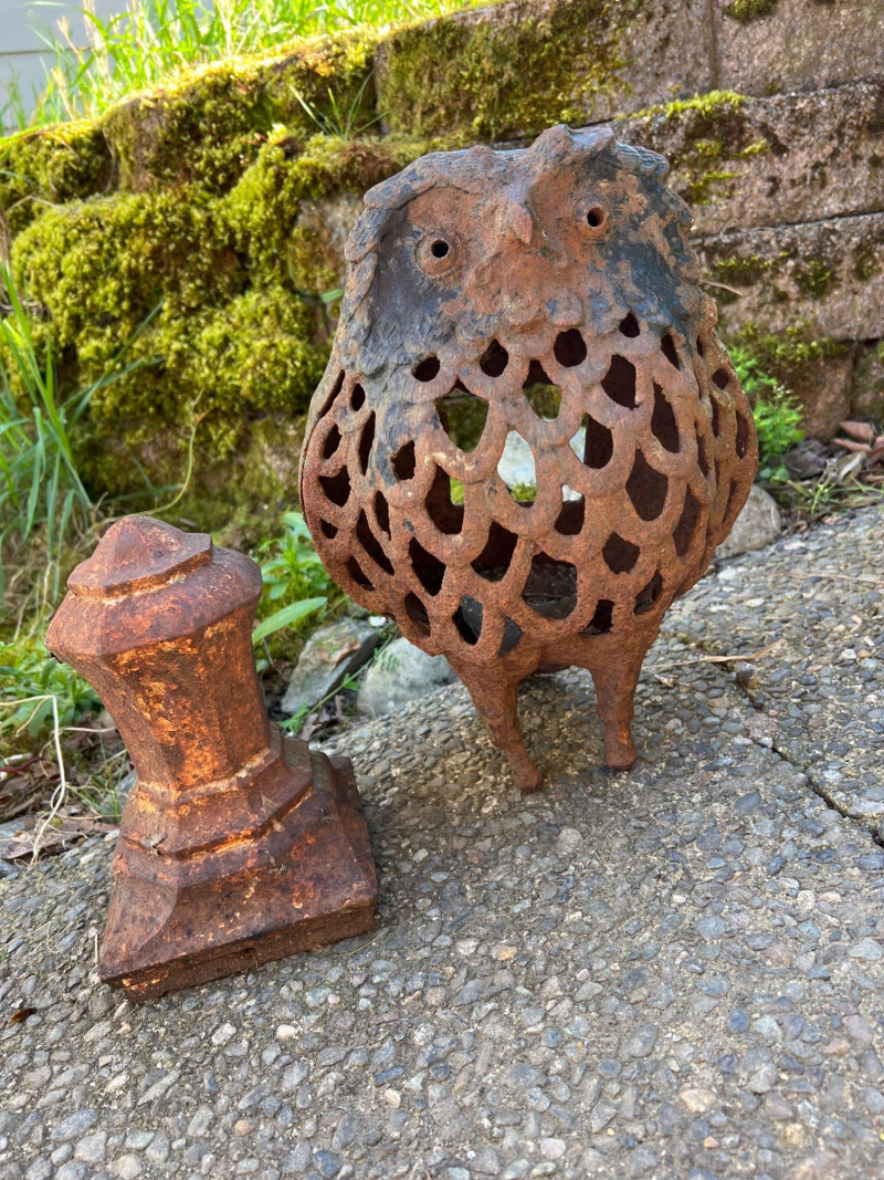 This charming set features two rustic cast iron pieces, each weathered to perfection with a rich, naturally aged patina: Hollow Cast Iron Owl: A stylized, openwork owl figure with detailed feather-like cutouts. It stands on two small feet and has a back opening, possibly for use as a candleholder or garden lantern. The surface displays heavy rusting and wear, adding to its vintage, primitive appeal. Rusted Fence Post Finial: A hefty, architectural topper with octagonal design and flared base. This piece also bears extensive rust, offering great character as a standalone decorative accent or repurposed element.