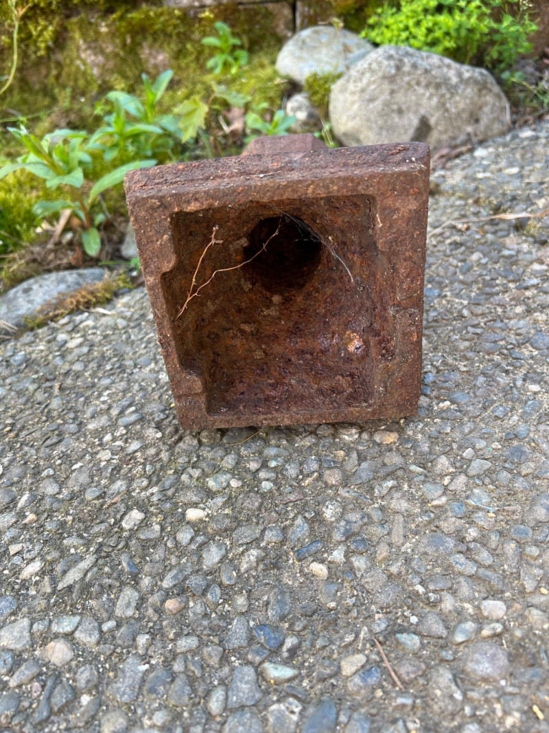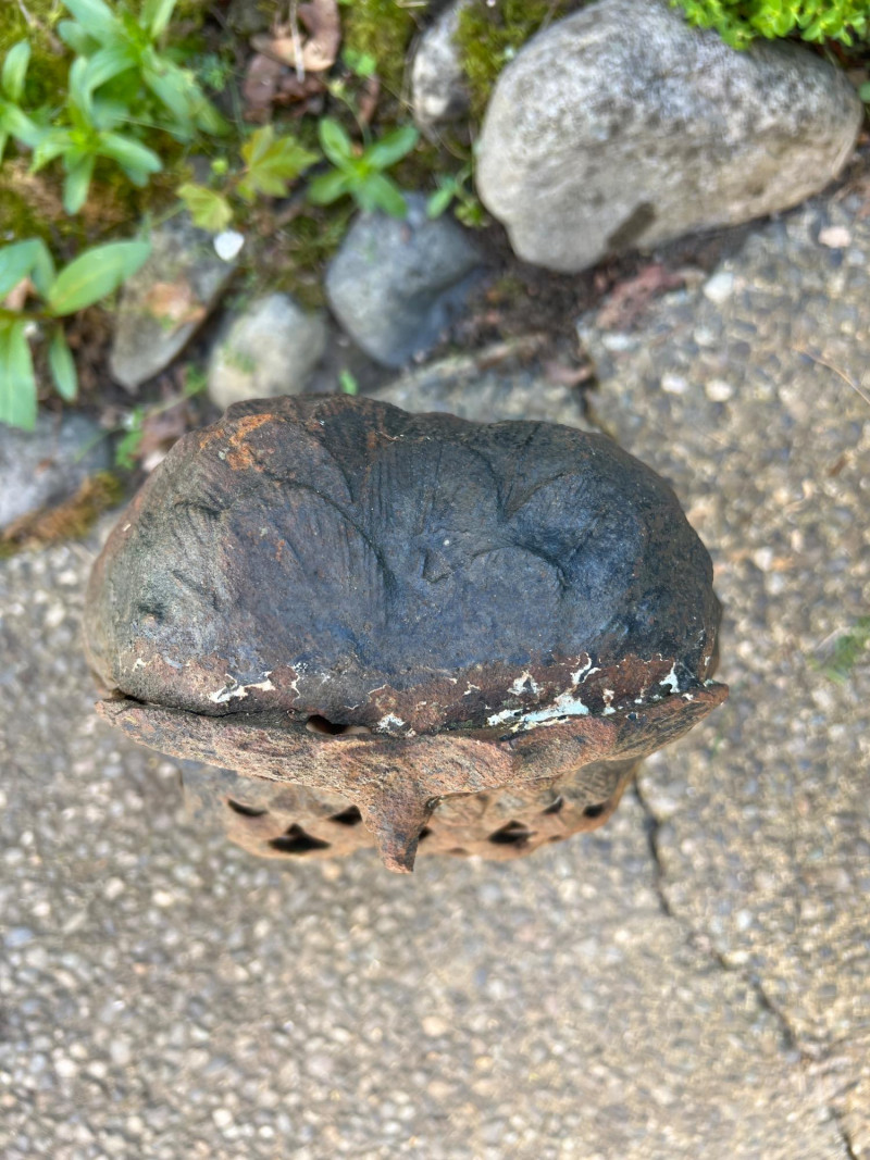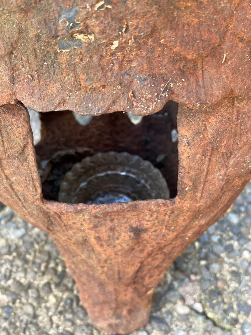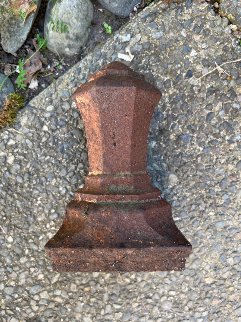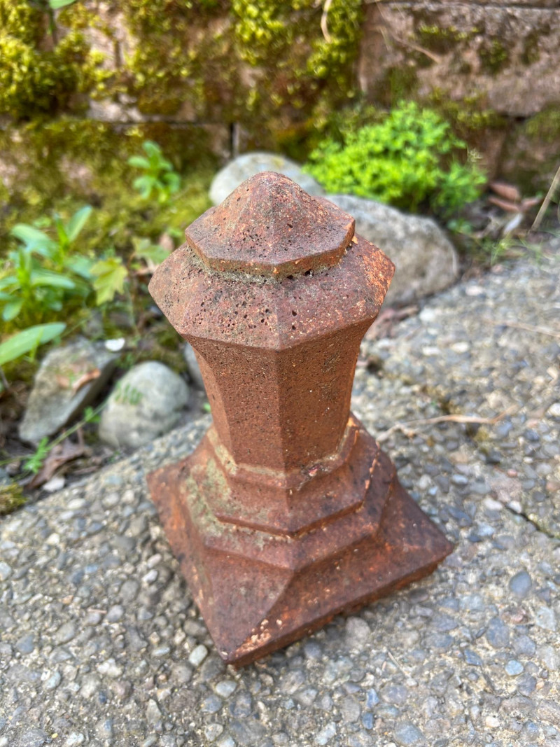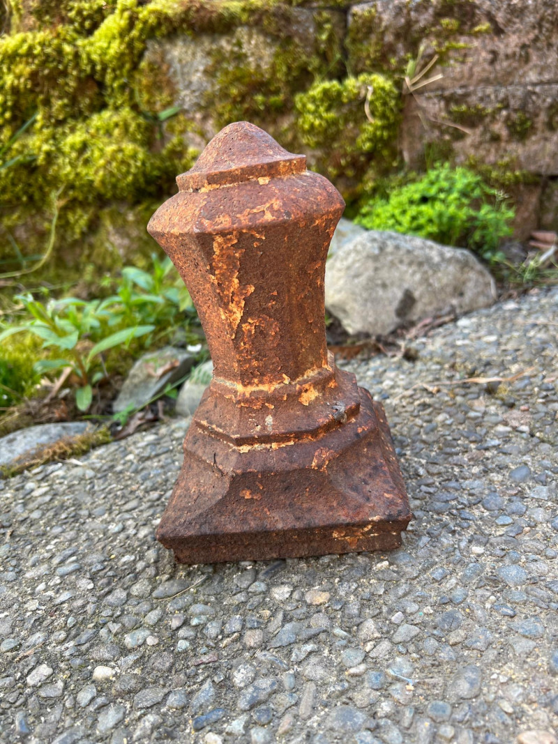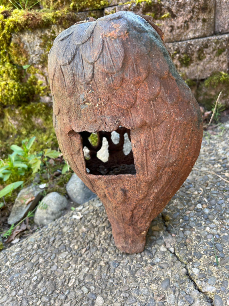 This charming set features two rustic cast iron pieces, each weathered to perfection with a rich, naturally aged patina: Hollow Cast Iron Owl: A stylized, openwork owl figure with detailed feather-like cutouts. It stands on two small feet and has a back opening, possibly for use as a candleholder or garden lantern. The surface displays heavy rusting and wear, adding to its vintage, primitive appeal. Rusted Fence Post Finial: A hefty, architectural topper with octagonal design and flared base. This piece also bears extensive rust, offering great character as a standalone decorative accent or repurposed element.