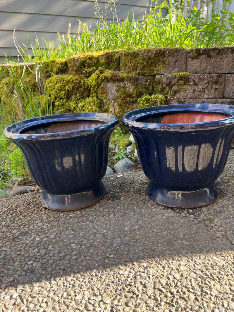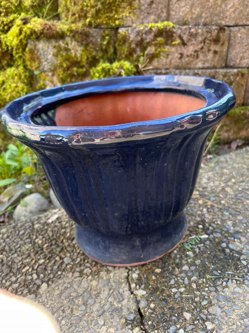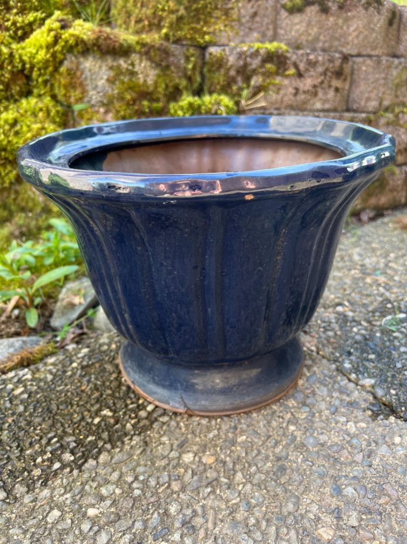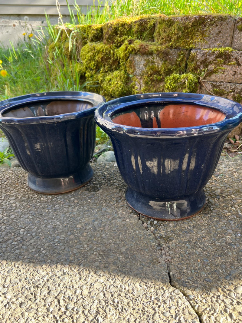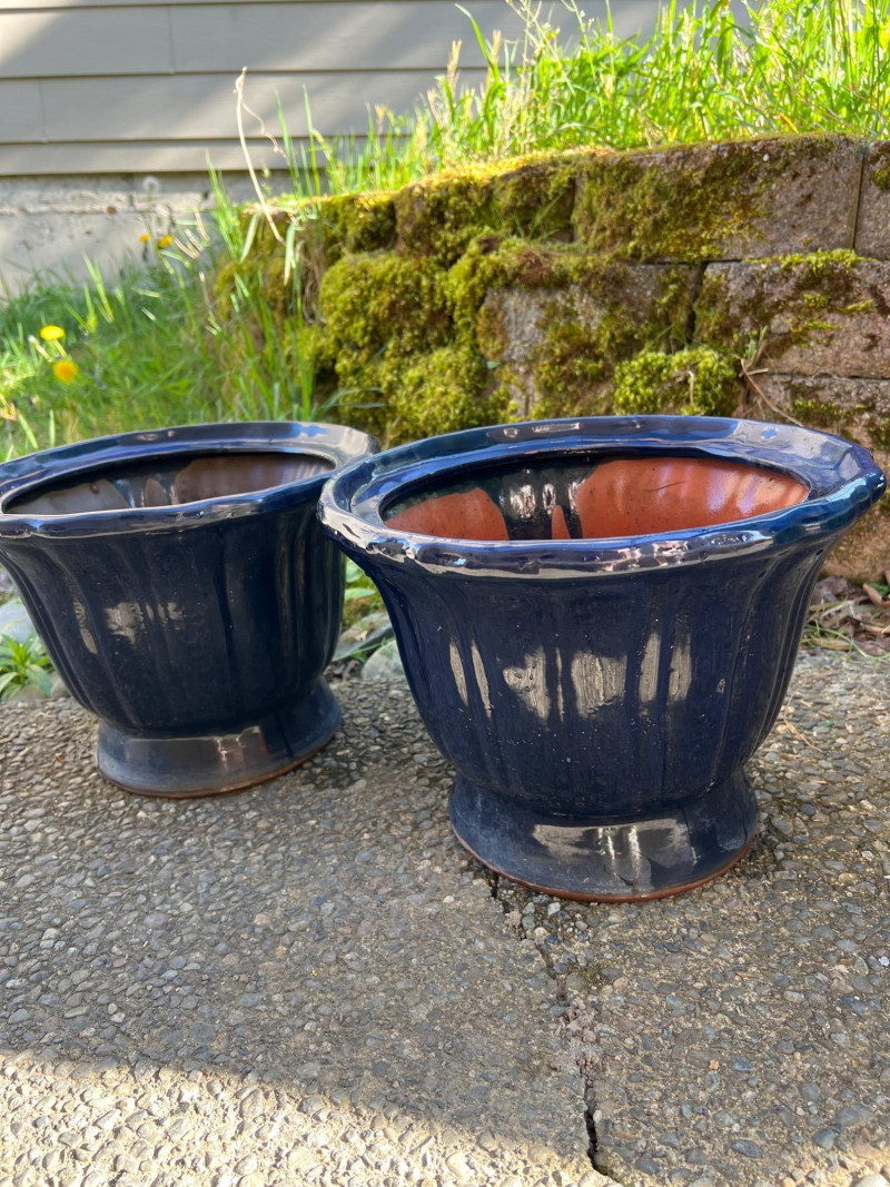 Classic outdoor pots featuring a rich navy blue glaze over terracotta clay. Each has a wide flared rim, ribbed sides, and drainage holes for outdoor planting. Their aged finish adds rustic charm, ideal for garden or patio settings.
