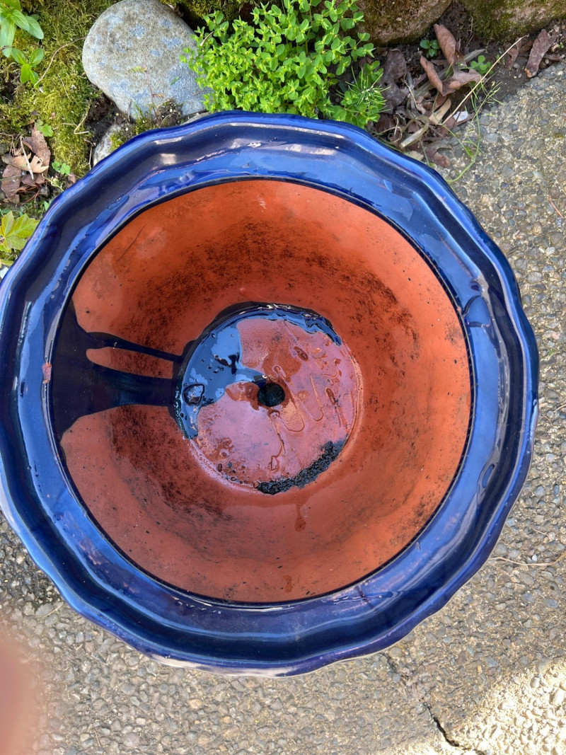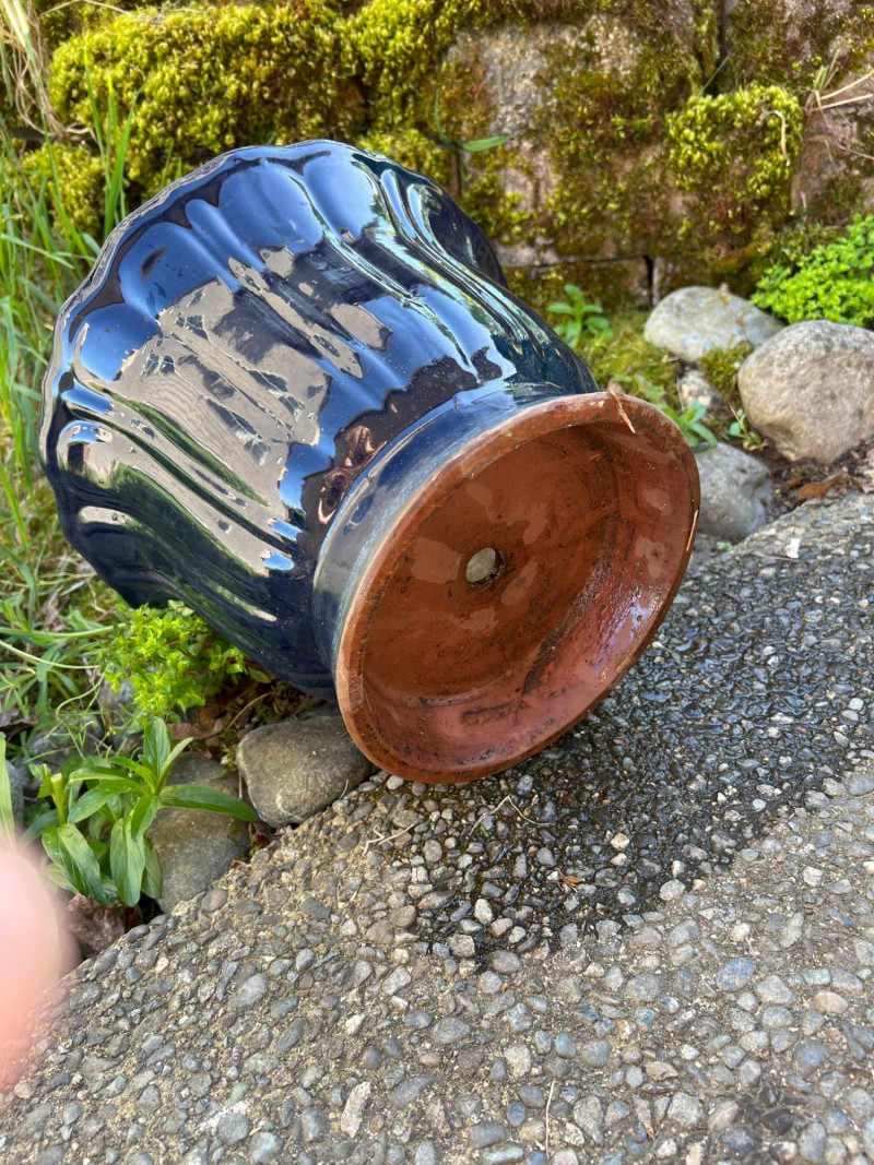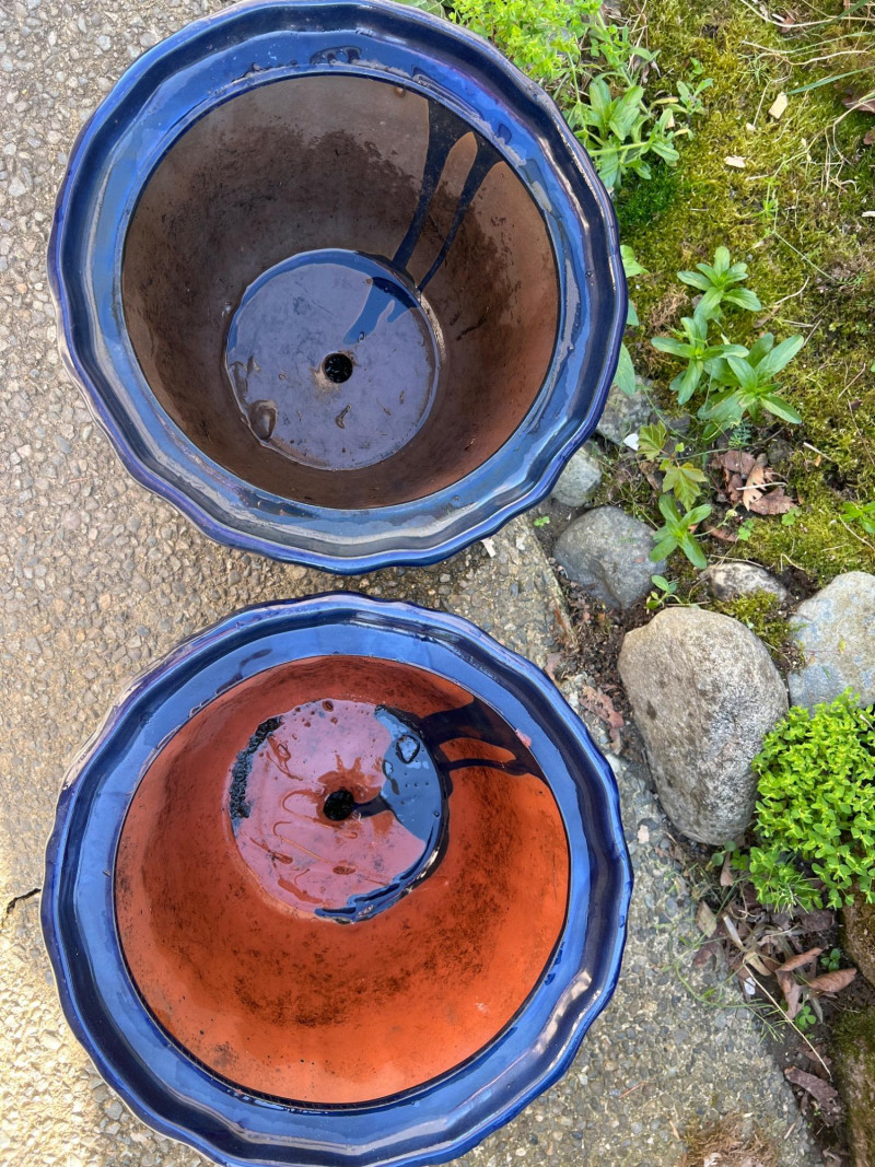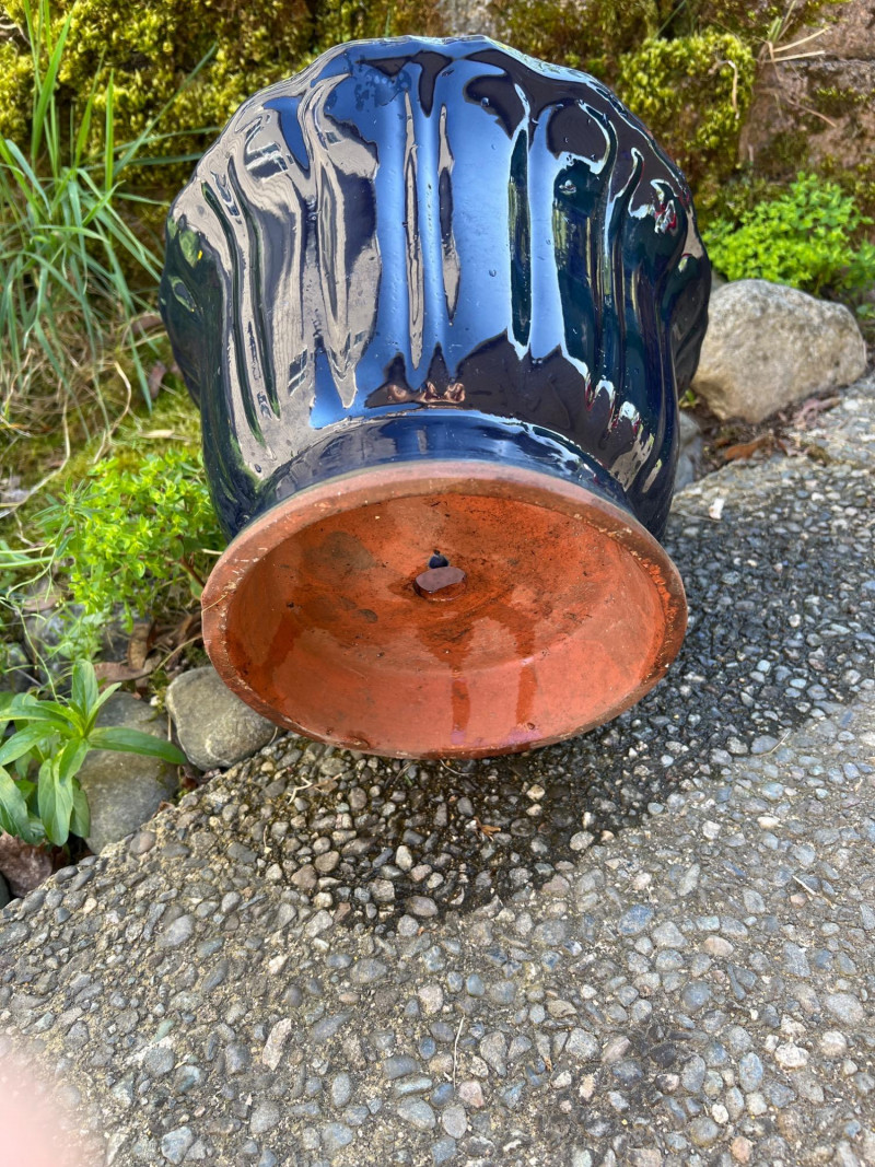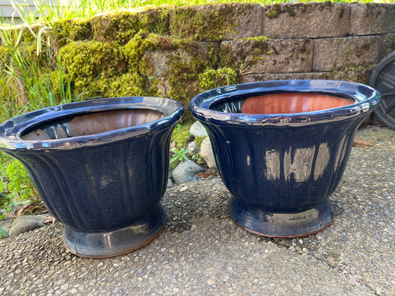 Classic outdoor pots featuring a rich navy blue glaze over terracotta clay. Each has a wide flared rim, ribbed sides, and drainage holes for outdoor planting. Their aged finish adds rustic charm, ideal for garden or patio settings.