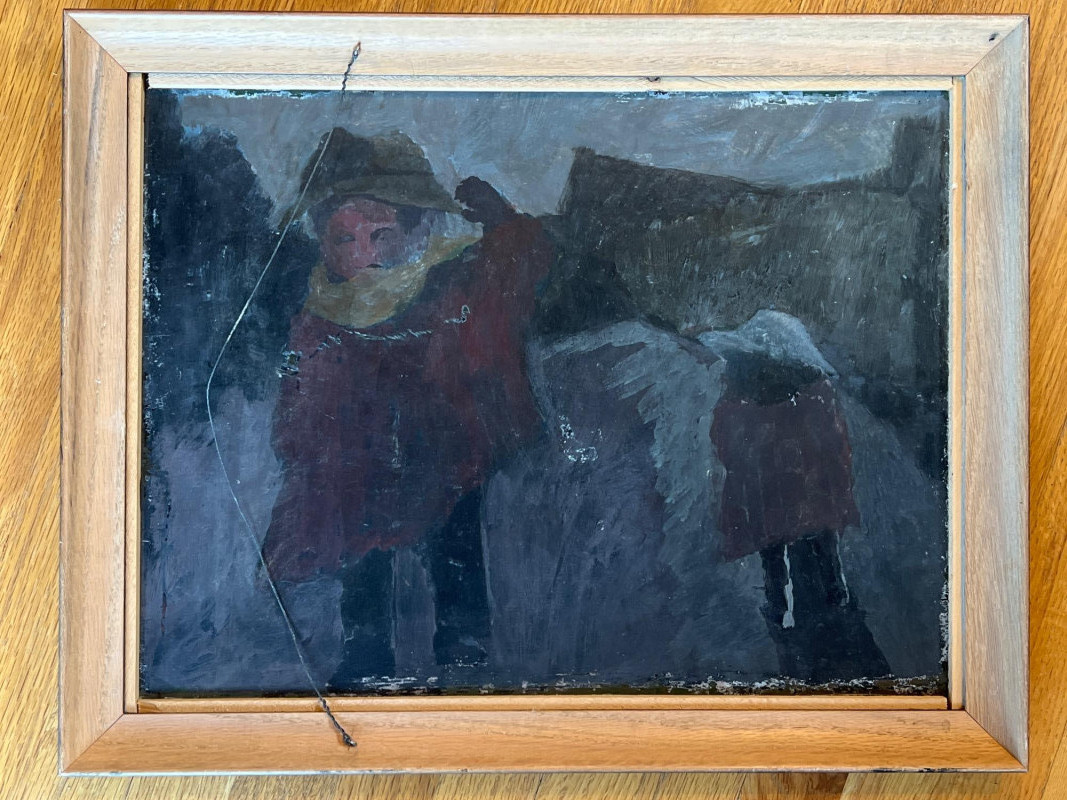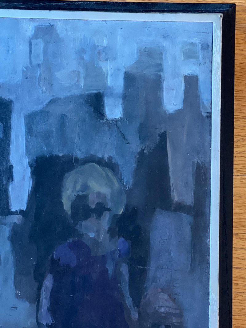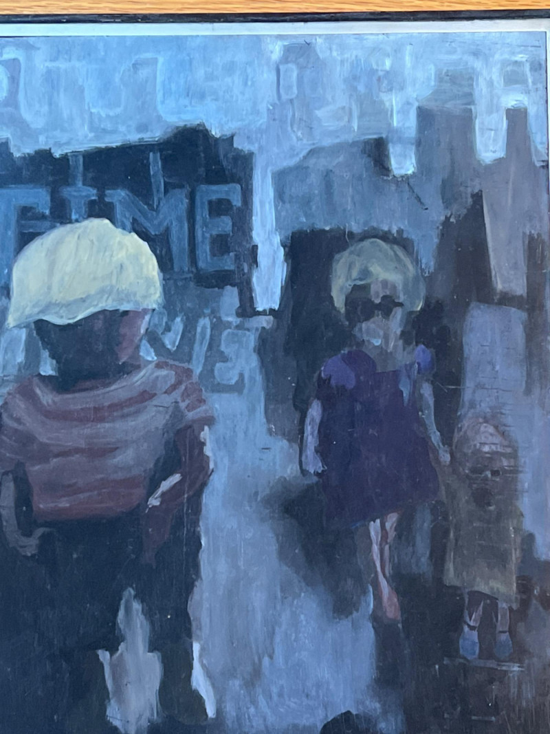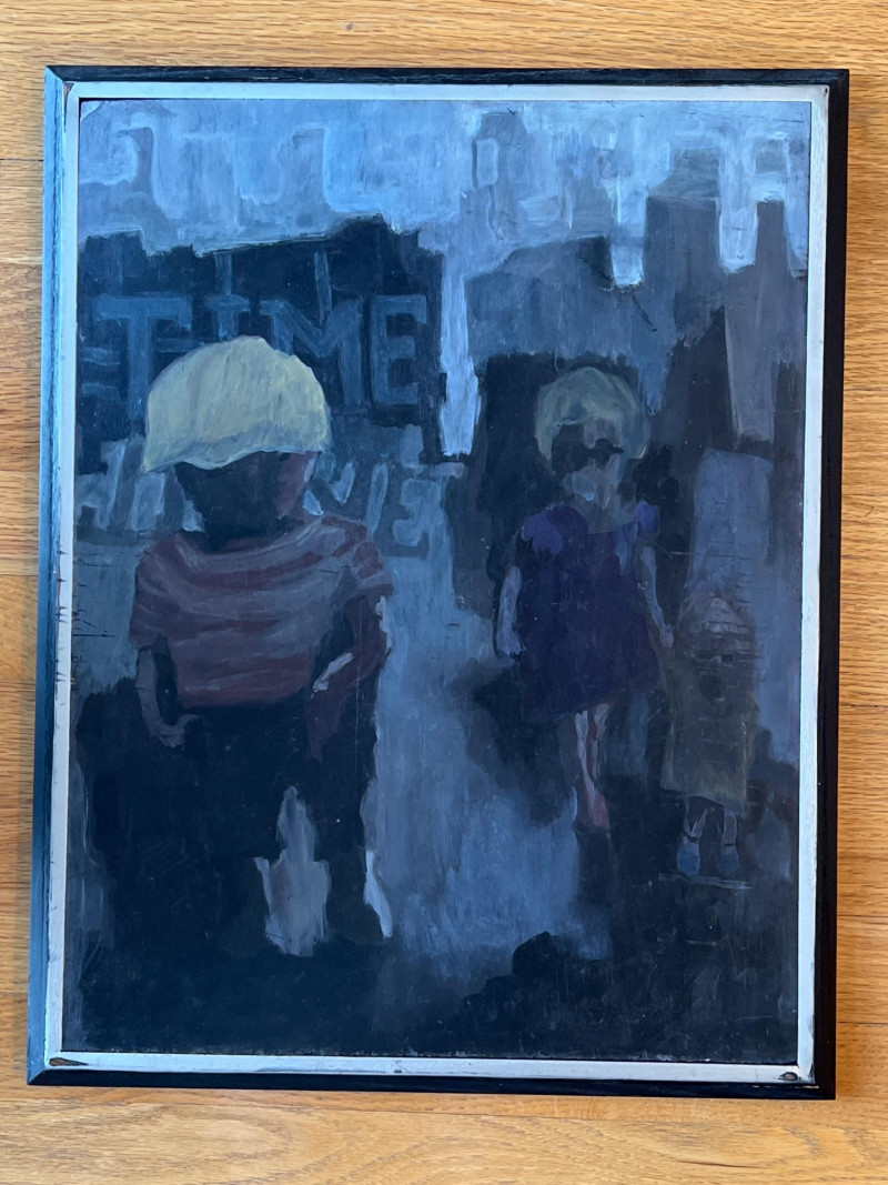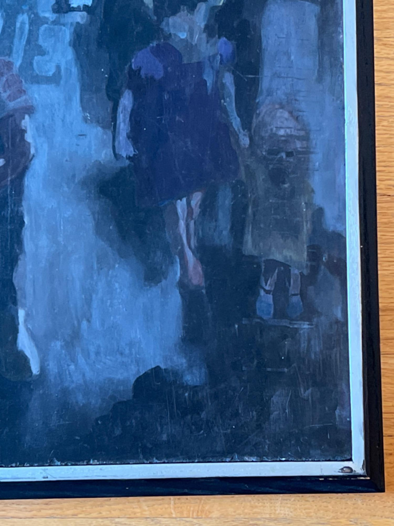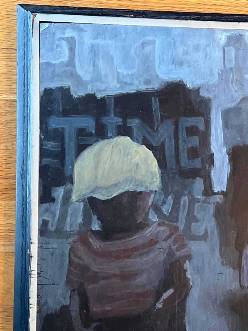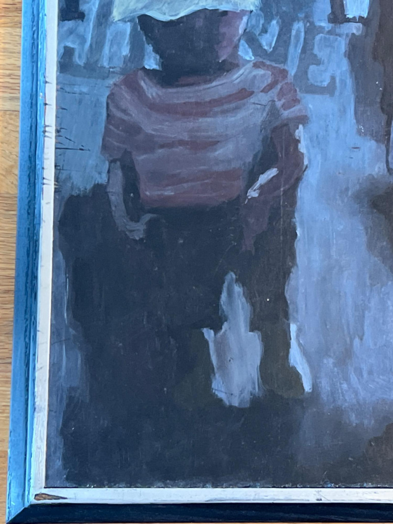 Impressionist Night Painting captures a mysterious urban scene, featuring three figures walking through a textured, dimly lit environment. Features of the Painting: The composition showcases three human forms, each with distinctive clothing, moving through a cityscape. A dark-toned background enhances the moody ambiance, while pops of lighter hues bring contrast. The painting exhibits rough, expressive brushstrokes, adding depth and energy. The faint lettering, including the word "TIME", appears in the background, hinting at themes of movement or passage. On what would be considered the other side of the frame or backside of the painting itself is another painting that features a dark, atmospheric street scene with two figures walking through what appears to be a nighttime urban setting. The figure on the left wears a hat and a scarf, while the figure on the right is less distinct, possibly wearing a coat. The background consists of shadowy shapes, suggesting buildings or landscape elements, giving the painting a somber and mysterious tone. No artist signature.