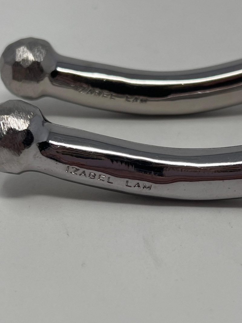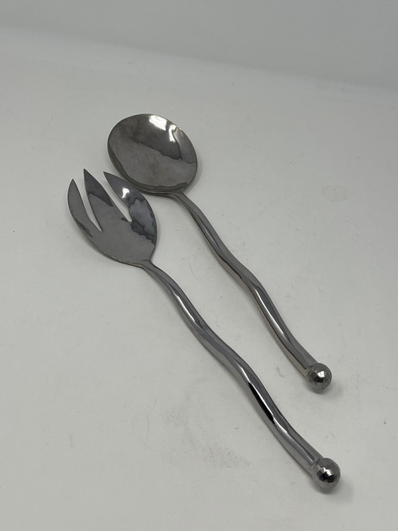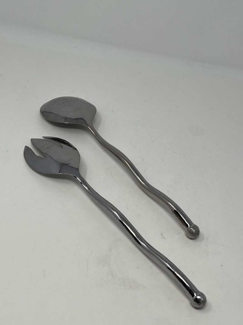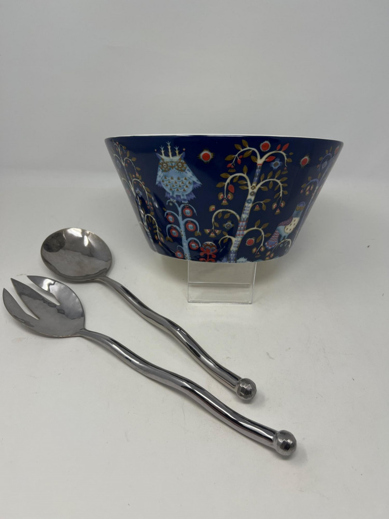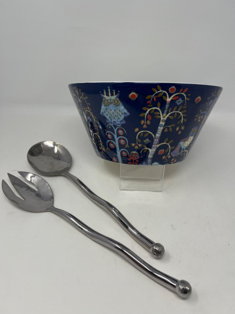 This bowl is from Iittala, a renowned Finnish design brand known for its high-quality ceramics and glassware. It is from their Taika collection, which features intricate, folklore-inspired patterns designed by Klaus Haapaniemi. This Iittala showcases a striking dark blue background, adorned with an intricate and colorful design. The centerpiece is a stylized peacock with a red-and-white body accented by blue tones. Surrounding the bird are whimsical trees with blue and gold branches and leaves, along with red and white circular patterns. This type of vibrant, detailed pottery is often influenced by traditional folk art or ceramic painting styles seen in regions like Eastern Europe, Turkey, or Central Asia. The combination of bold colors, intricate designs, and animal motifs suggests a handcrafted, artistic approach. Fine, smooth porcelain. 10" round x 5" height. The Izabel Lam culinary set features a distinctive spoon and fork with wavy handles and rounded ends, crafted from metal with a reflective surface, likely stainless steel. Izabel Lam is known for her elegant and sculptural designs, blending artistry with functionality in kitchenware. Features of Izabel Lam Culinary Pieces: Organic, flowing shapes – Inspired by natural forms and movement. High-quality materials – Often crafted from stainless steel. Unique textures and finishes. Modern yet timeless aesthetic – Designed for both practical use and artistic display.12.5” length.