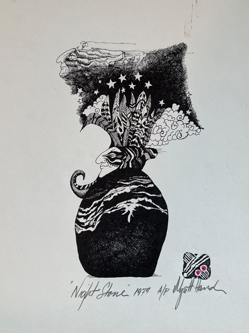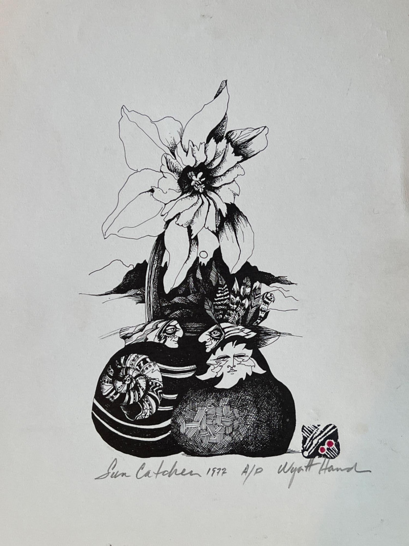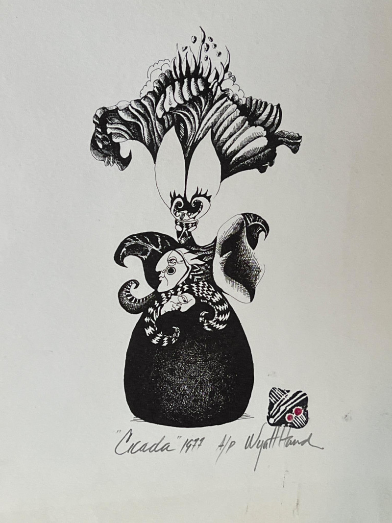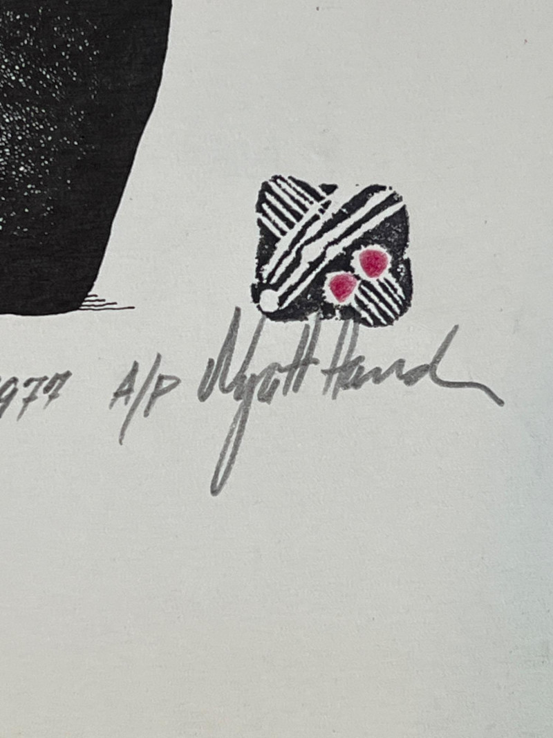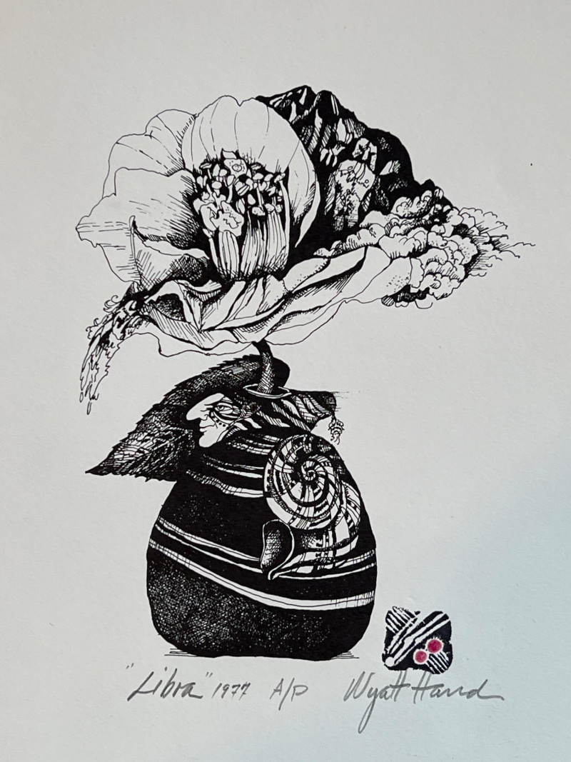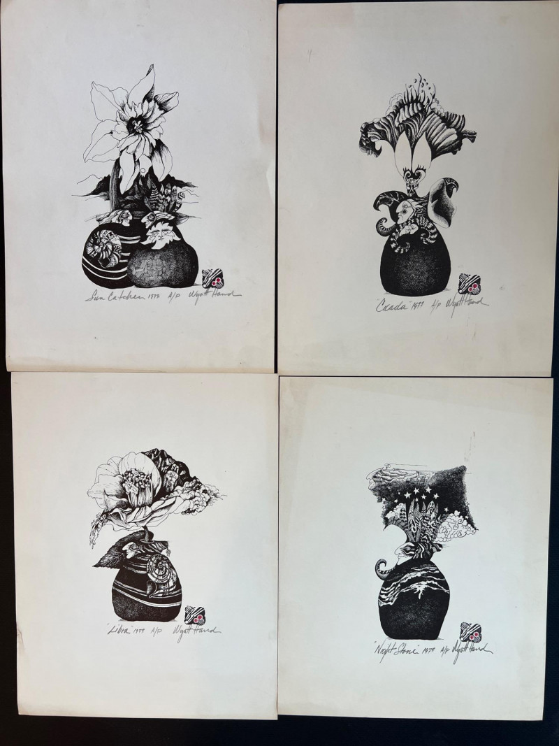 Four Artist Proof’s signed in pencil by Wyatt Hand and dated 1977. Black and white prints on heavier paper stock. Entitled: “Night Stone”, “Libra”, “Cicada”, and “ Sun Catcher”.
