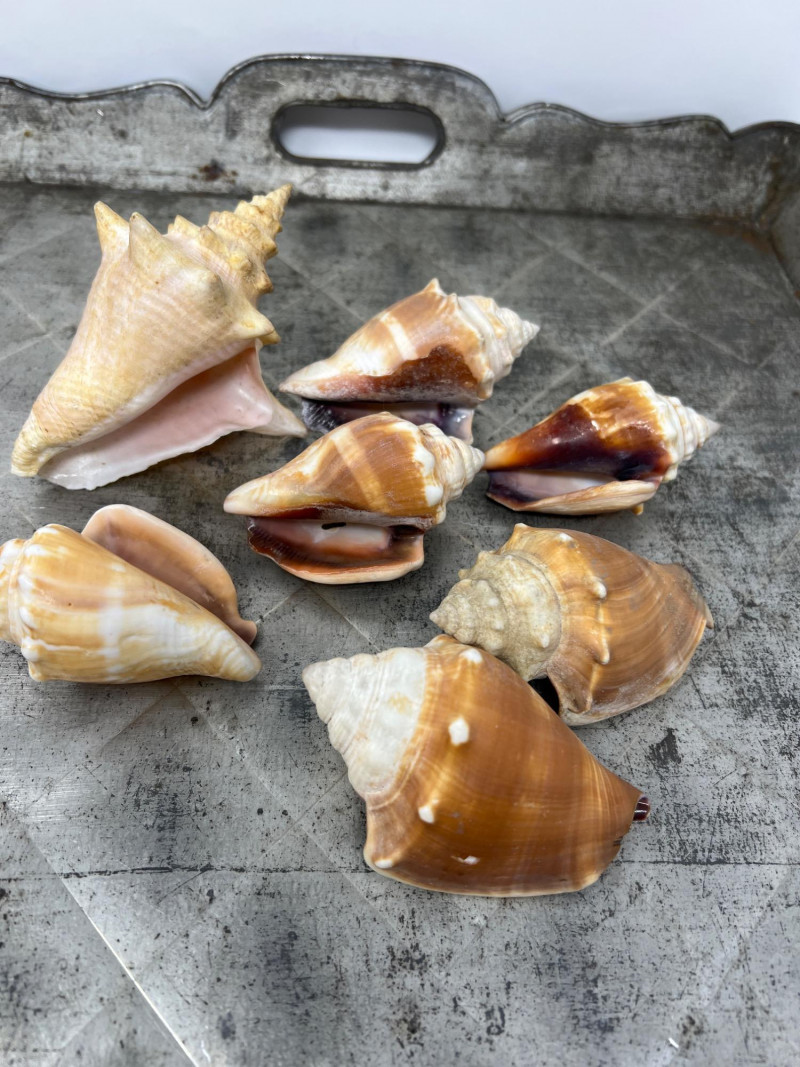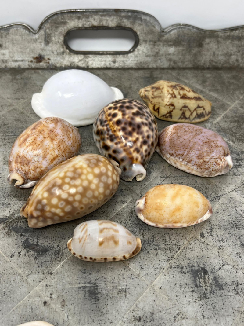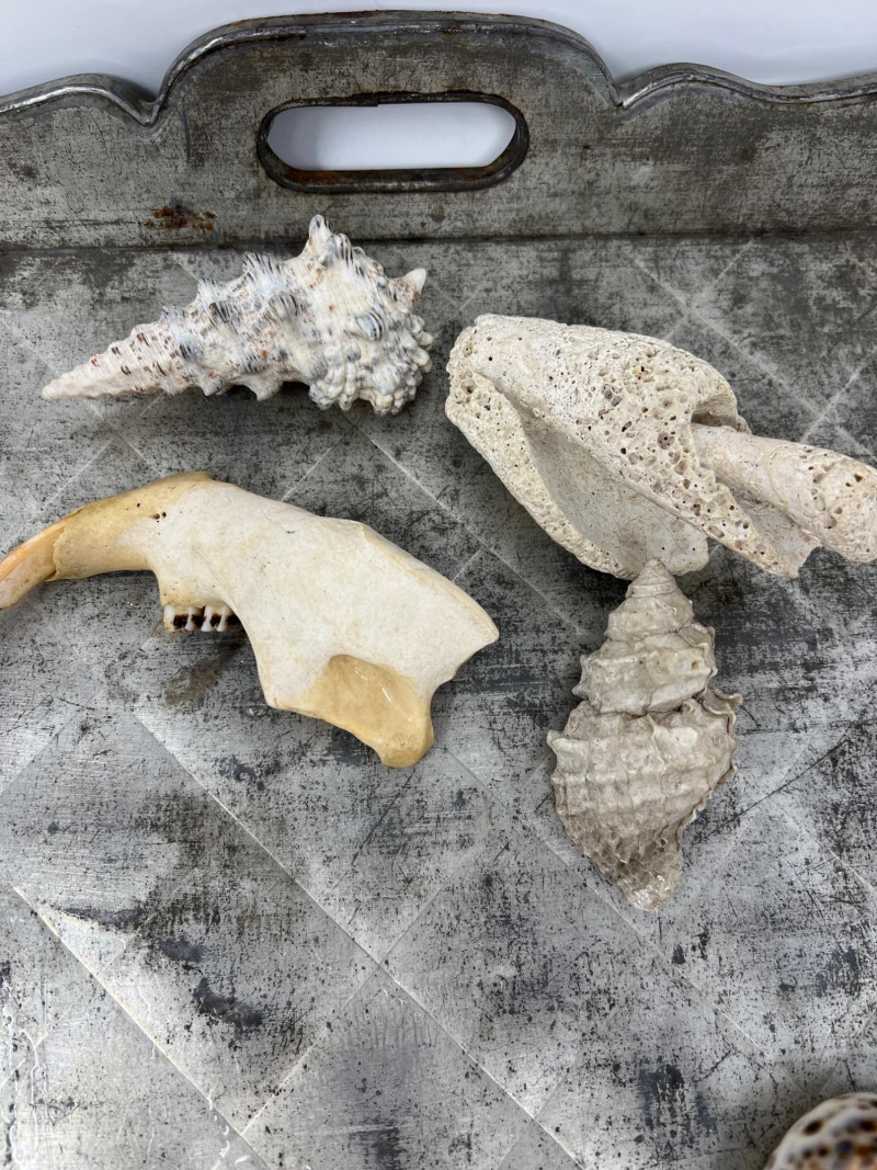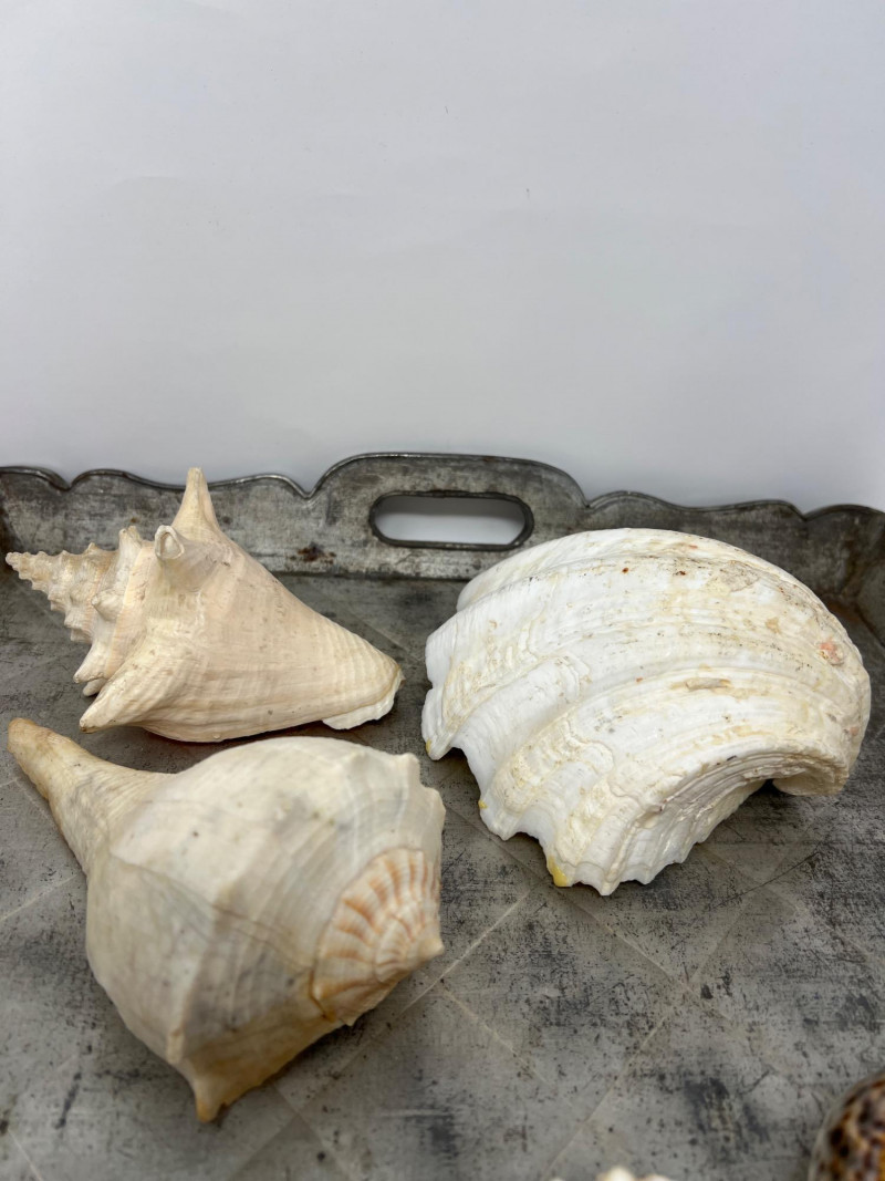 Here are a variety of sea shells that include different species - conch, clam, scallop, and whelk shells. Each shell carries distinct patterns and ocean-worn textures, making them visually captivating. This collection is the perfect for coastal-themed decor, or collectors delight for nature enthusiasts. The antiqued Metal Tray has a rustic, aged aesthetic and is included in this collection lot. Seashell collections like this often evoke a sense of tranquility and connection to the ocean, making them ideal for home decor, meditation spaces, or artistic inspiration. The antiqued metal tray features a diamond-shaped embossing is a common feature in mid-century decorative trays and this tray's pattern has a rustic, aged aesthetic. The scalloped edges add to its decorative appeal, making it a stylish display for decorative appeal or to be used for serving.