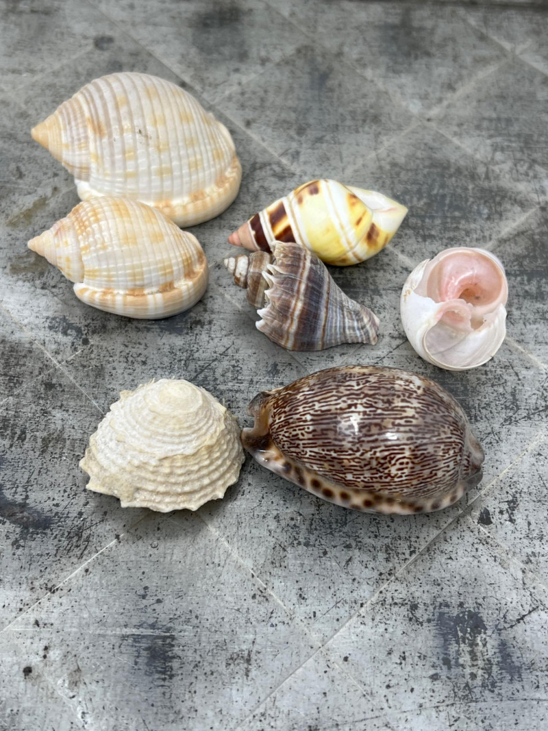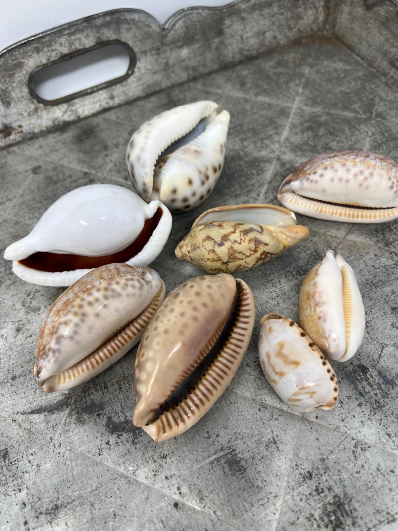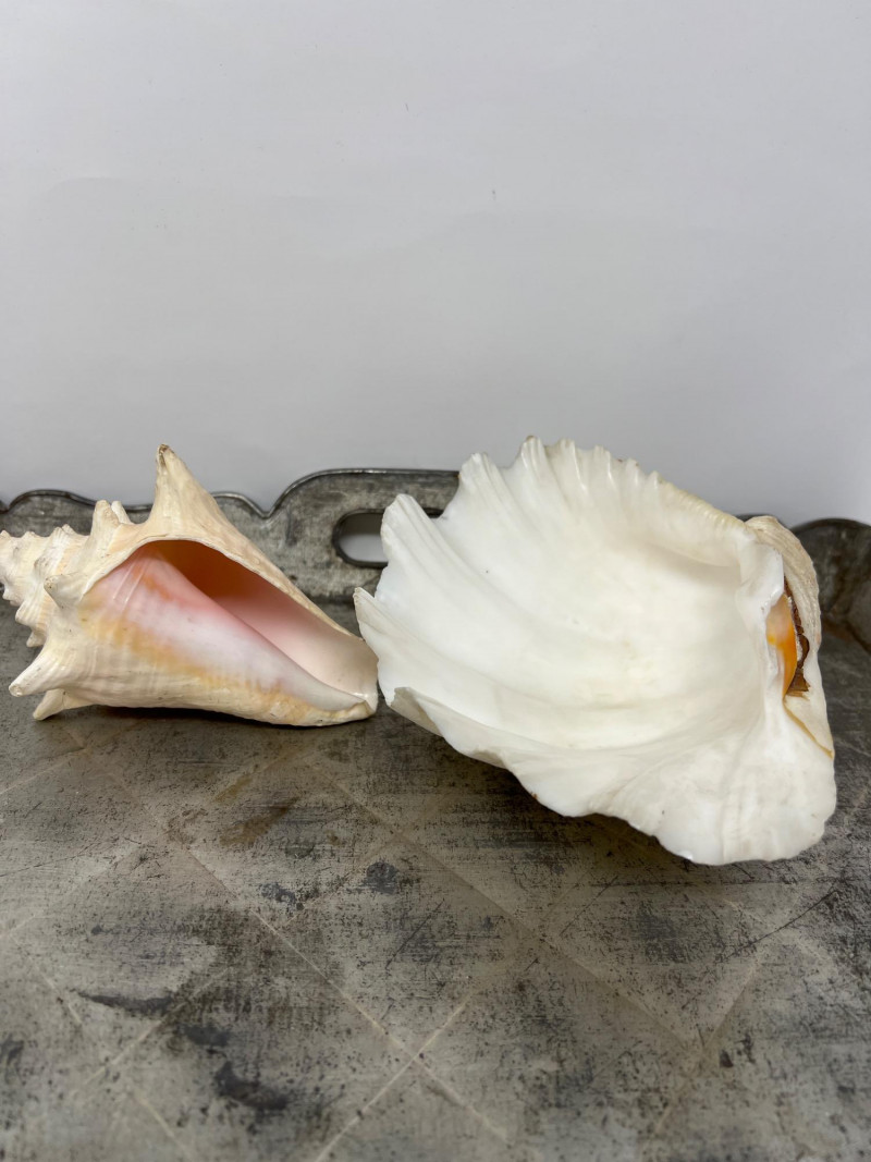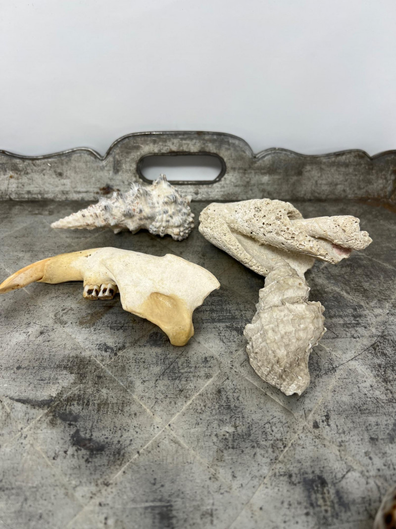 Here are a variety of sea shells that include different species - conch, clam, scallop, and whelk shells. Each shell carries distinct patterns and ocean-worn textures, making them visually captivating. This collection is the perfect for coastal-themed decor, or collectors delight for nature enthusiasts. The antiqued Metal Tray has a rustic, aged aesthetic and is included in this collection lot. Seashell collections like this often evoke a sense of tranquility and connection to the ocean, making them ideal for home decor, meditation spaces, or artistic inspiration. The antiqued metal tray features a diamond-shaped embossing is a common feature in mid-century decorative trays and this tray's pattern has a rustic, aged aesthetic. The scalloped edges add to its decorative appeal, making it a stylish display for decorative appeal or to be used for serving.
